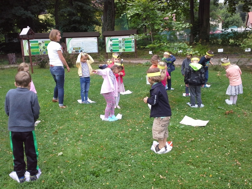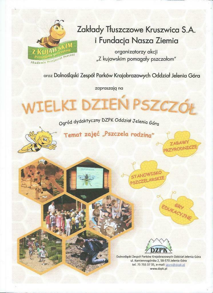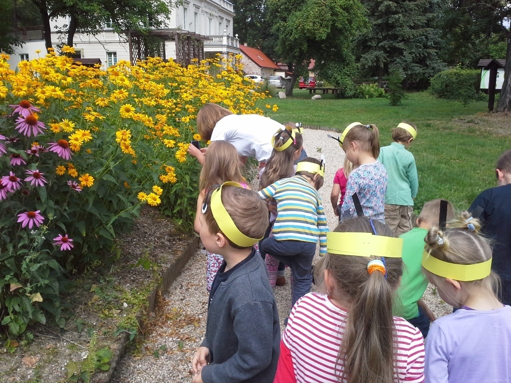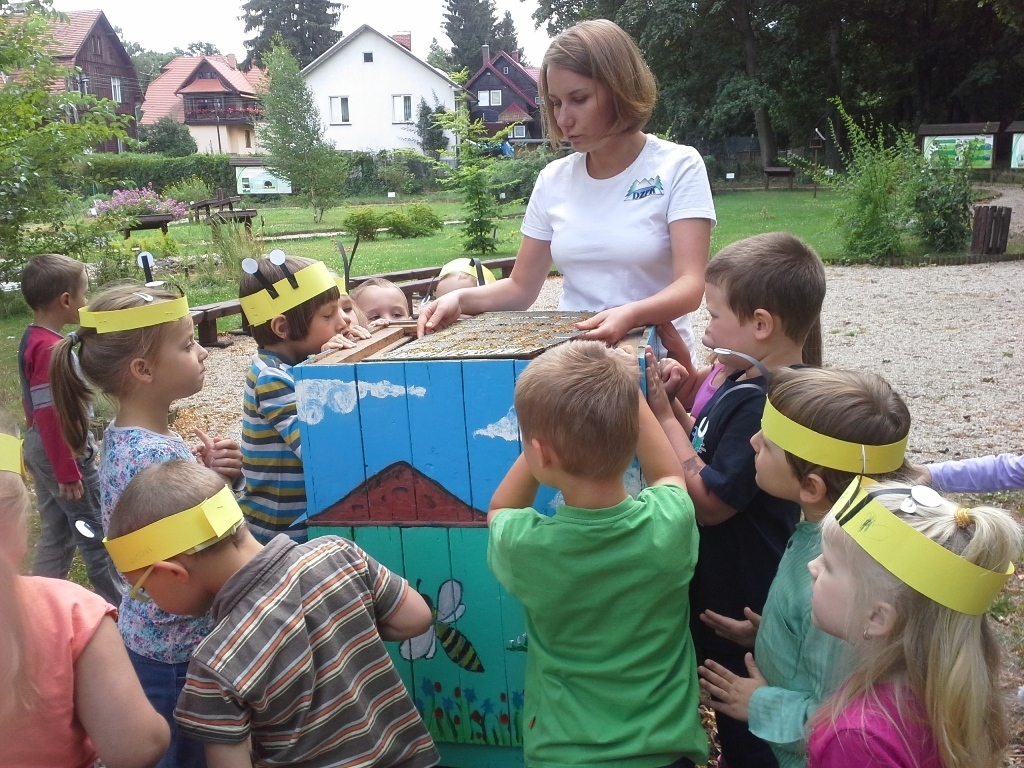 Dnia 29.07.2015 grupy starszak,ów i średniaków wybrały się autobusem miejskim na warsztaty do Dolnośląskiego Zespołu Parków Krajobrazowych w Sobieszowie. Tematem zajęć było życie pszczół. Dowiedzieliśmy się, że niektóre z nich żyją w wielkich rodzinach a niektóre samotnie. Te żyjące w dużych gromadach mieszkają w ulu, a te które żyją same tworzą swoje domki w niewielkich szczelinach drzew i łodygach niektórych kwiatów. Pani prowadząca pokazała nam piękny okaz trzmiela, który też jest pszczołą, a następnie wyszliśmy do ogrodu, gdzie mogliśmy obejrzeć prawdziwy ul i zajrzeć do środka. Aby było w nim więcej mieszkań dla pszczół. Zasadziliśmy w ogrodzie nowe kwiaty, a sami a dla siebie przygotowaliśmy pszczółkowe opaski. Zajęcia były bardzo ciekawe, na koniec każdy otrzymał odznakę pszczelarza.