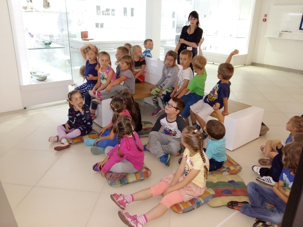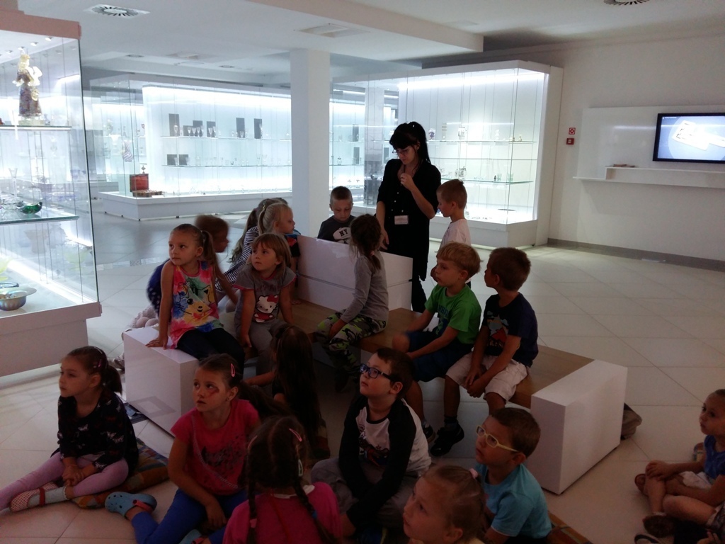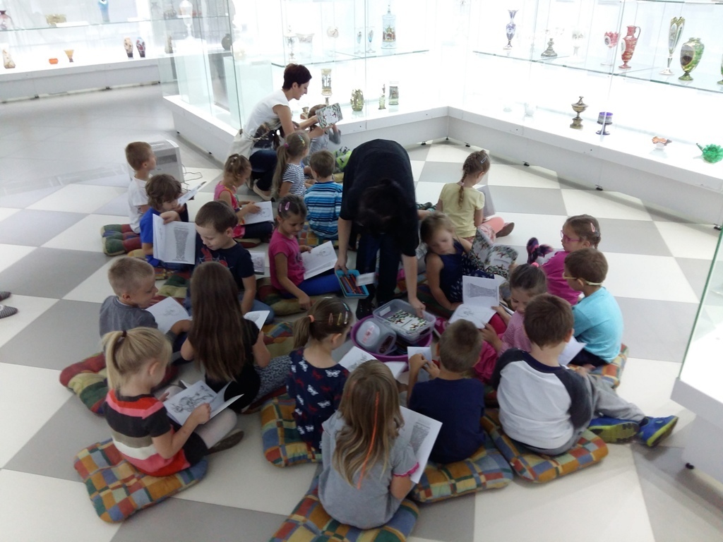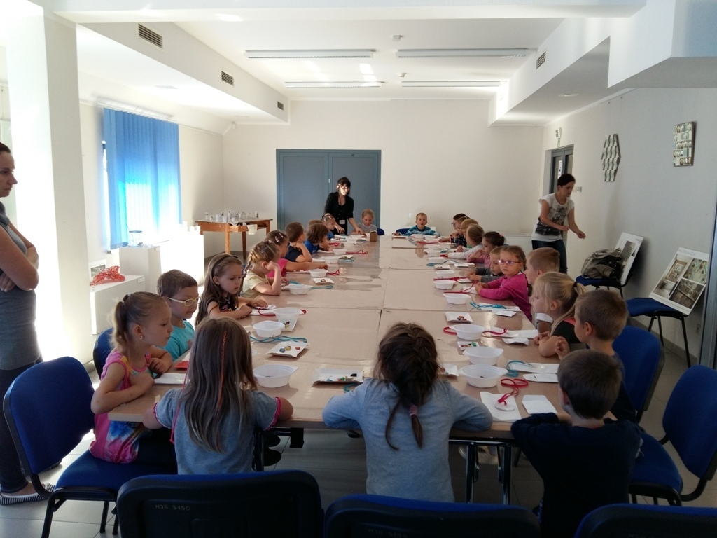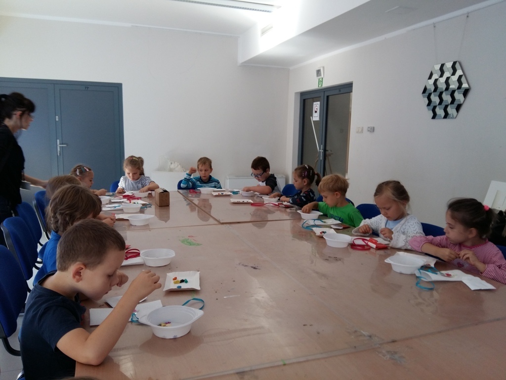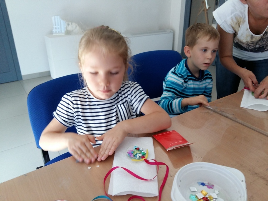 Otrzymaliśmy także kolorowanki przedstawiające eksponaty znajdujące się w muzeum. Bawiliśmy się również w zgadywankę: „odszukaj właściwy eksponat”. Poszukiwaliśmy eksponatów w sali wystawowej, takich samych jak na obrazkach wylosowanych przez wybrane osoby. Poradziliśmy sobie z tym zadaniem błyskawicznie dzięki naszej spostrzegawczości i zwinności. Natomiast nasze zdolności manualne przydały się do kolejnego zadania, jakim było wykonanie własnoręcznie zdobionych medalionów ze szkła. Ile dzieci, tyle pomysłów, a wszystkie udały się znakomicie. To były wspaniałe warsztaty, a już niedługo udamy się na kolejne.