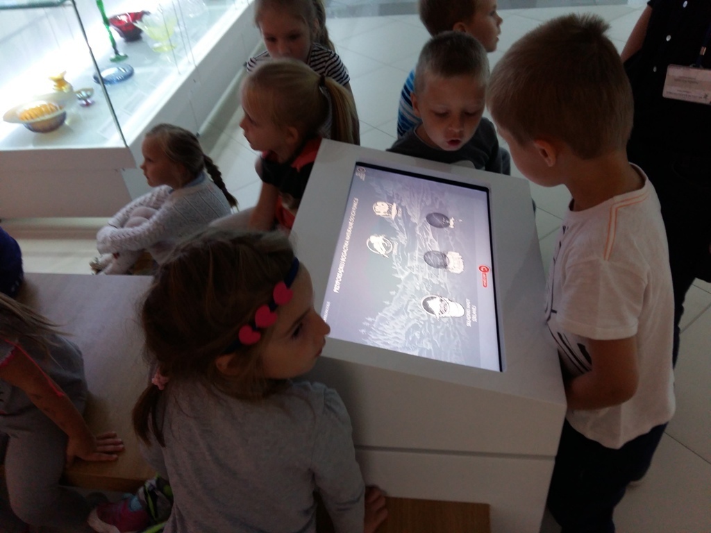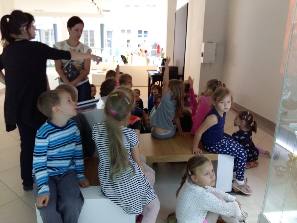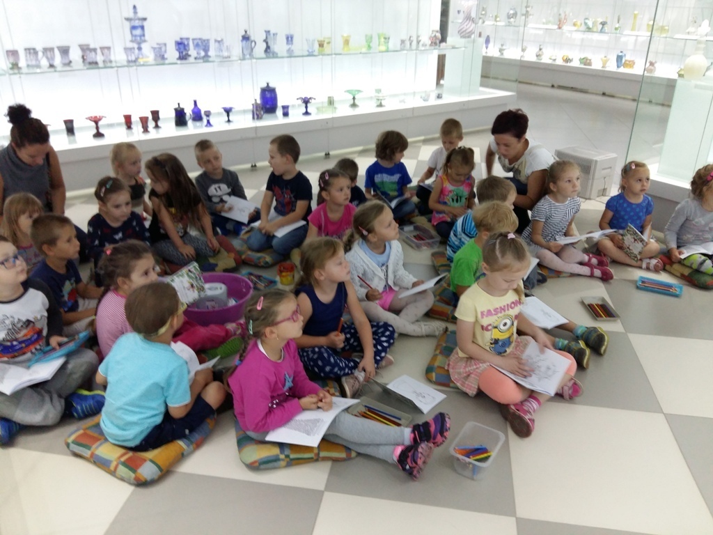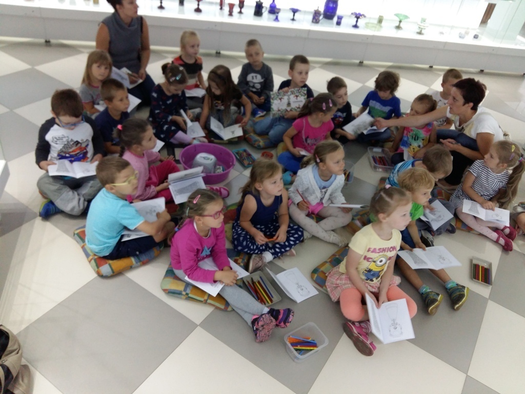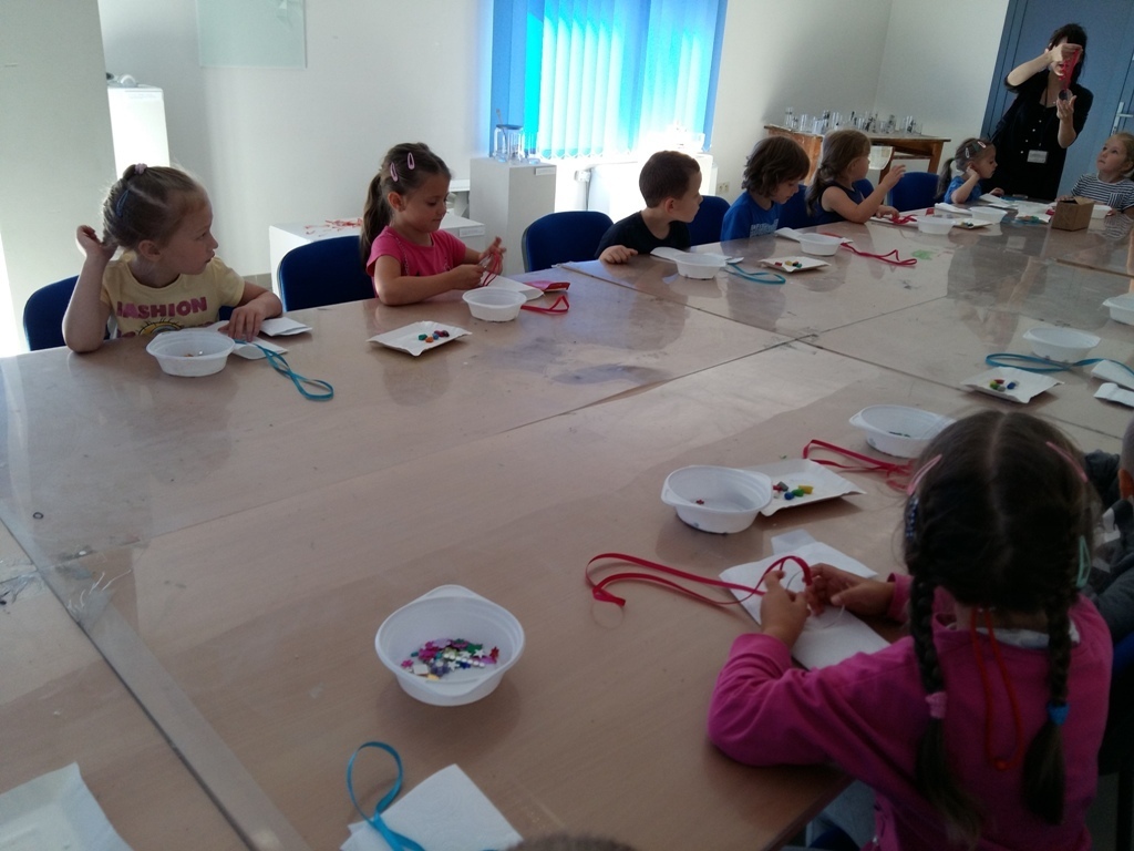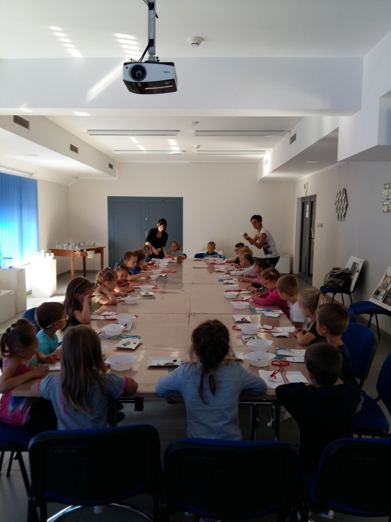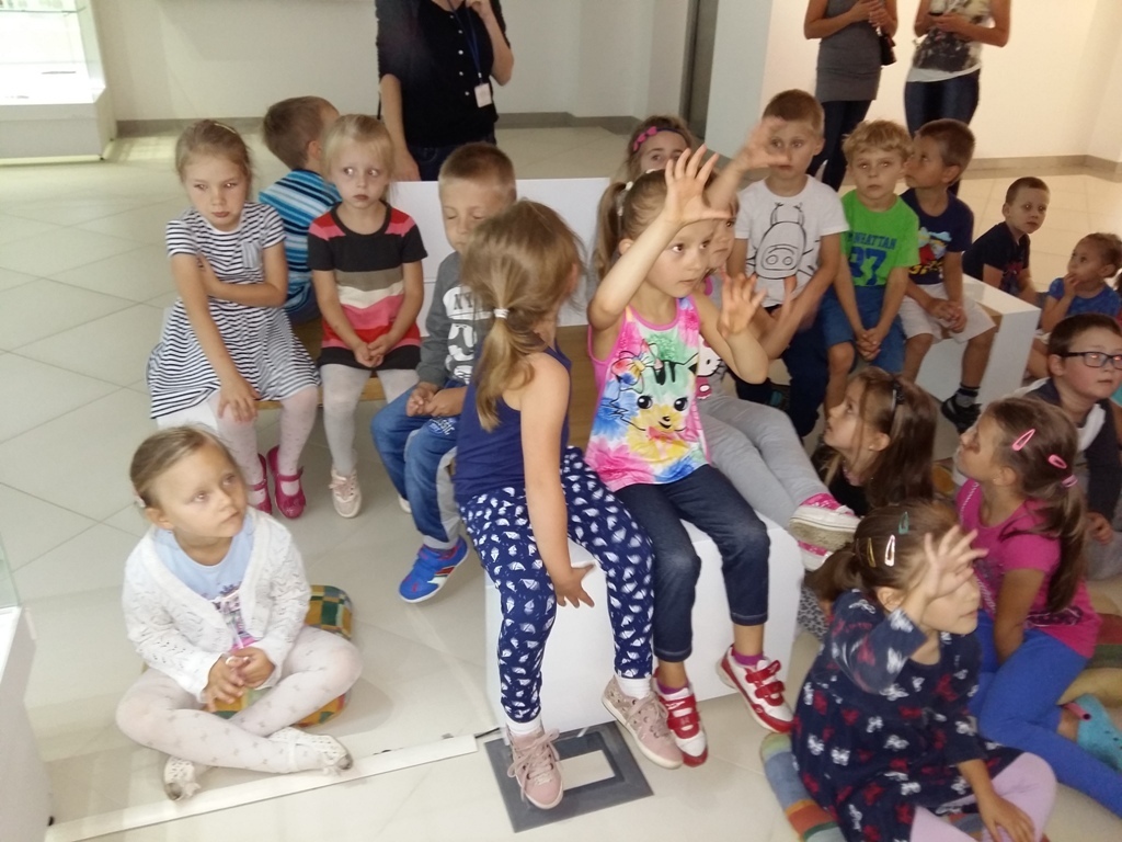 Otrzymaliśmy także kolorowanki przedstawiające eksponaty znajdujące się w muzeum. Bawiliśmy się również w zgadywankę: „odszukaj właściwy eksponat”. Poszukiwaliśmy eksponatów w sali wystawowej, takich samych jak na obrazkach wylosowanych przez wybrane osoby. Poradziliśmy sobie z tym zadaniem błyskawicznie dzięki naszej spostrzegawczości i zwinności. Natomiast nasze zdolności manualne przydały się do kolejnego zadania, jakim było wykonanie własnoręcznie zdobionych medalionów ze szkła. Ile dzieci, tyle pomysłów, a wszystkie udały się znakomicie. To były wspaniałe warsztaty, a już niedługo udamy się na kolejne.