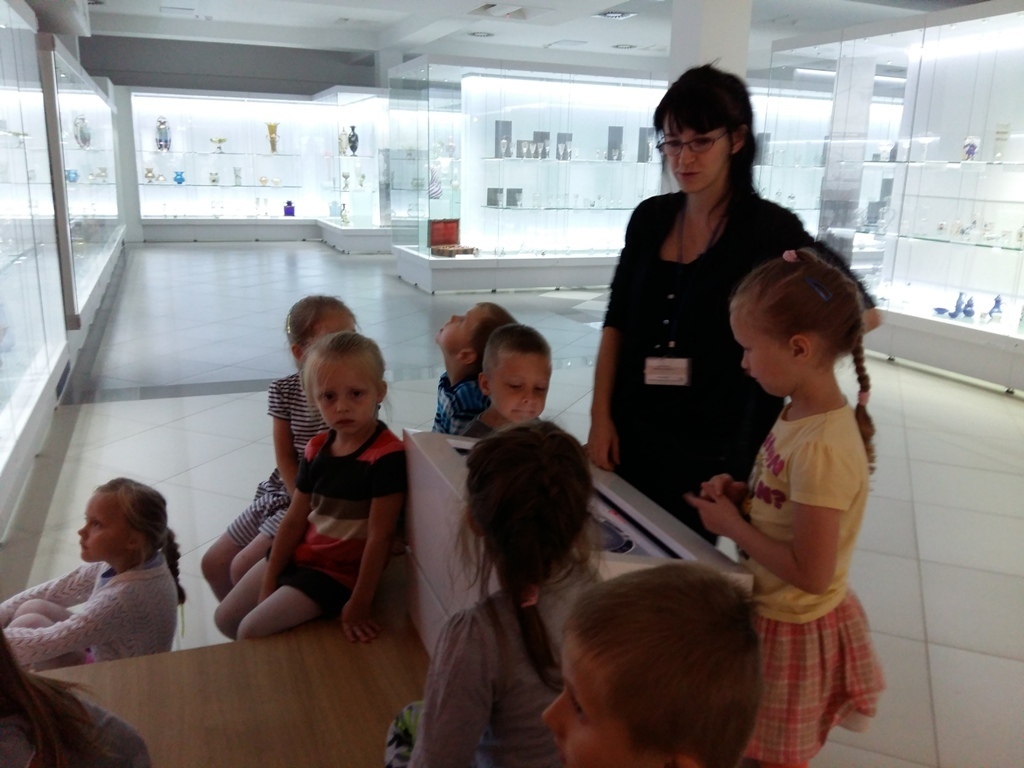 Przy wejściu powitała nas pani prowadząca warsztaty i zaprowadziła do budynku, gdzie czekały na nas nie lada atrakcje. Wizytę rozpoczęliśmy od wysłuchania opowieści o szkle - skąd się bierze, jakie są jego składniki, gdzie wyrabia się szklane pzedmioty. Wiele z tych informacji pamiętaliśmy z wizyty w hucie "Julia" w Piechowicach, dlatego nie mieliśmy problemu z zagadkami zadawanymi przez panią edukatorkę.
