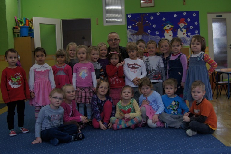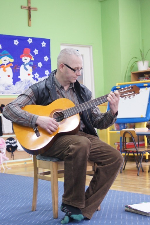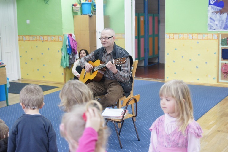 Było to wyjątkowe spotkanie, ponieważ tata Oli zaprezentował nam grę na gitarze klasycznej, a przedstawił nam repertuar Juliana Tuwima i Jana Brzechwy. Dzieci z przyjemnością i radością śpiewały wraz z panem Markiem utwory takie jak: „Kaczka Dziwaczka” czy „Z popielnika na Wojtusia iskiereczka mruga”. Wyrecytował również „Katar”, „Koziołeczek”, „Gdyby kózka nie skakała” , „Rzepka” i wiele innych wierszy, z pomcą dzieci. Wszyscy się świetnie bawili.