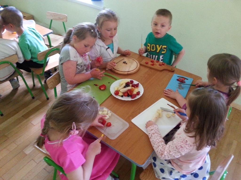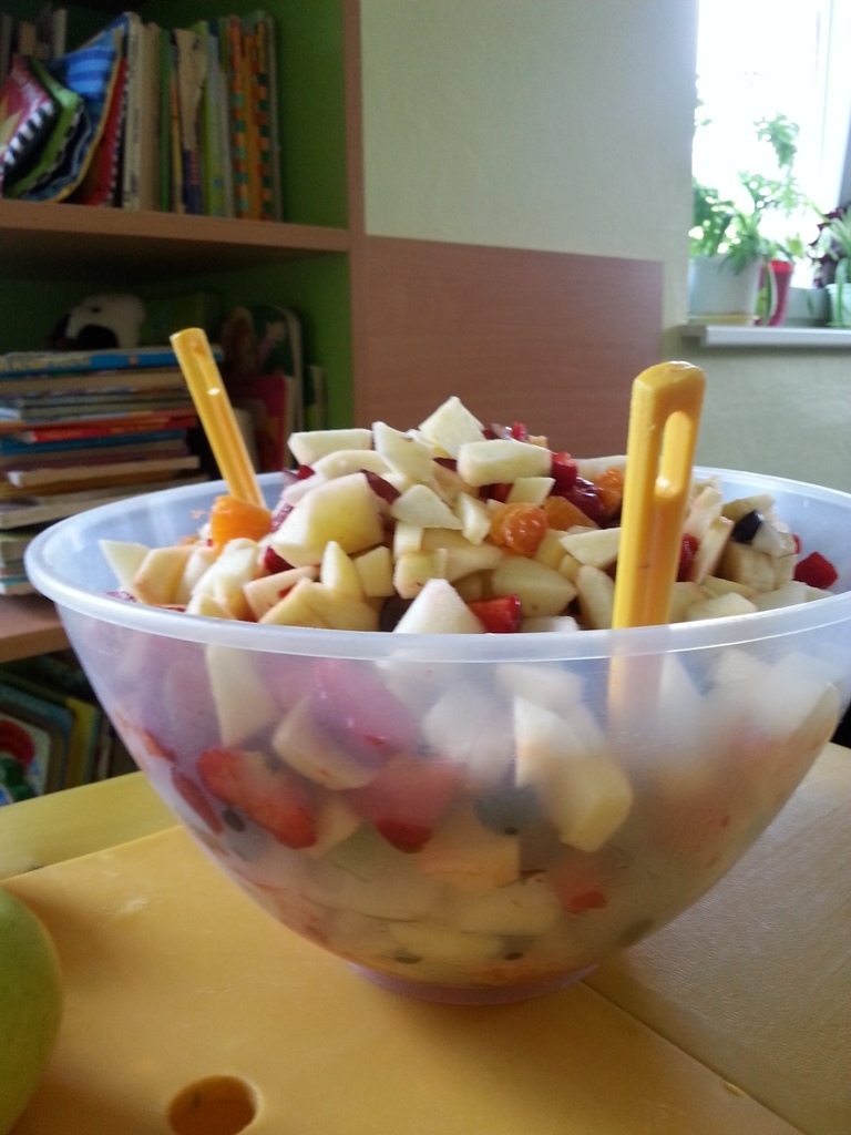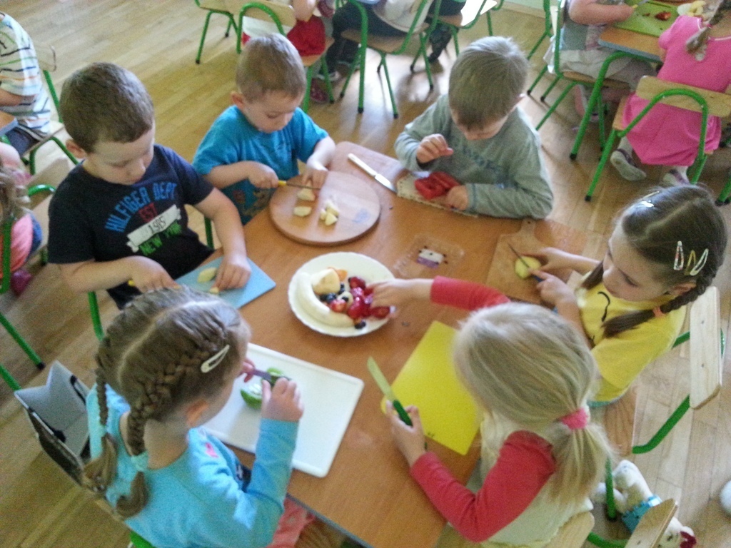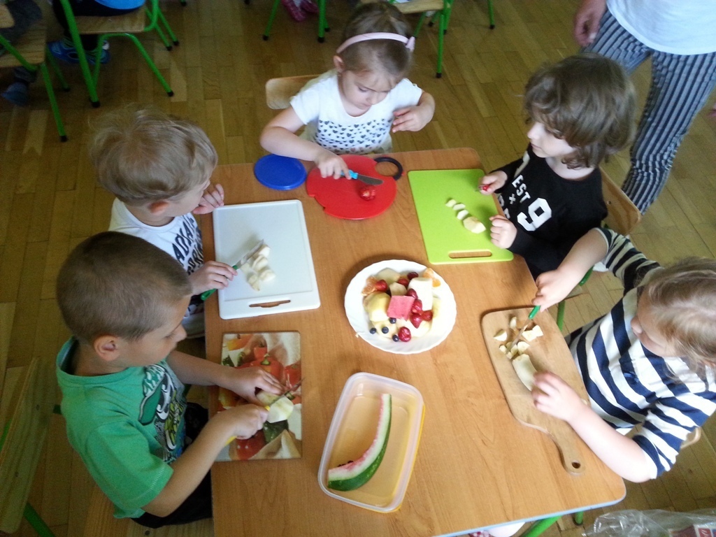 Dzisiejszy dzień pokazał, że w przedszkolu na pewno nie ma nudy, nawet jeśli inne grupy wychodzą. Grupa III Żabek, spędziła dziś bardzo intensywny dzień. Głównym planem dnia była sałatka owocowa. Każde z dzieci przyniosło swoją deskę do krojenia i ulubiony owoc. O 10:00 zakasaliśmy rękawy, aby wykonać najlepszą na świecie sałatkę owocową. Taka też wyszła, a pusta miska była tego dowodem. Nawet te dzieci, które mówiły: „Nie lubimy tych owoców” - zjadły sałatkę ze smakiem.