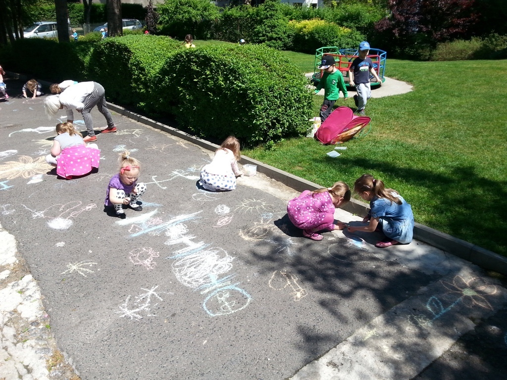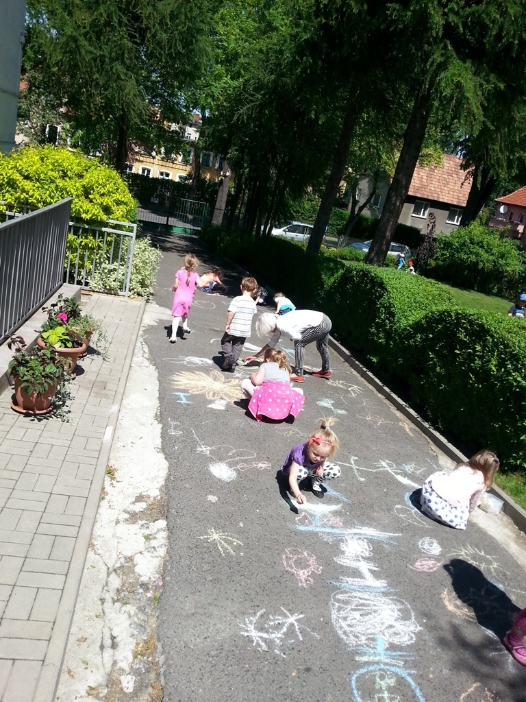 Natomiast czas od II śniadania do obiadu spędziliśmy w przedszkolnym ogrodzie. Dzieci mogły przez chwilę poczuć się jak artyści - kredą ozdobiły niemal cały chodnik oraz krawężniki.
