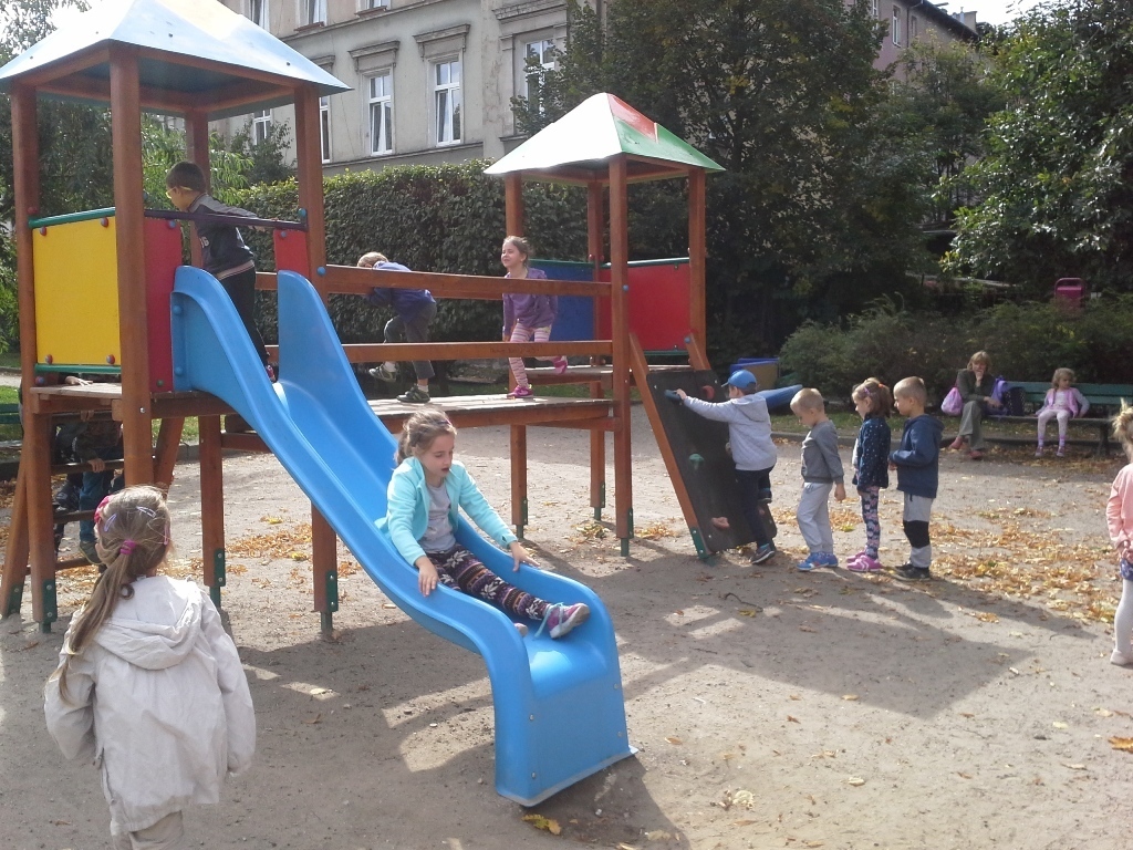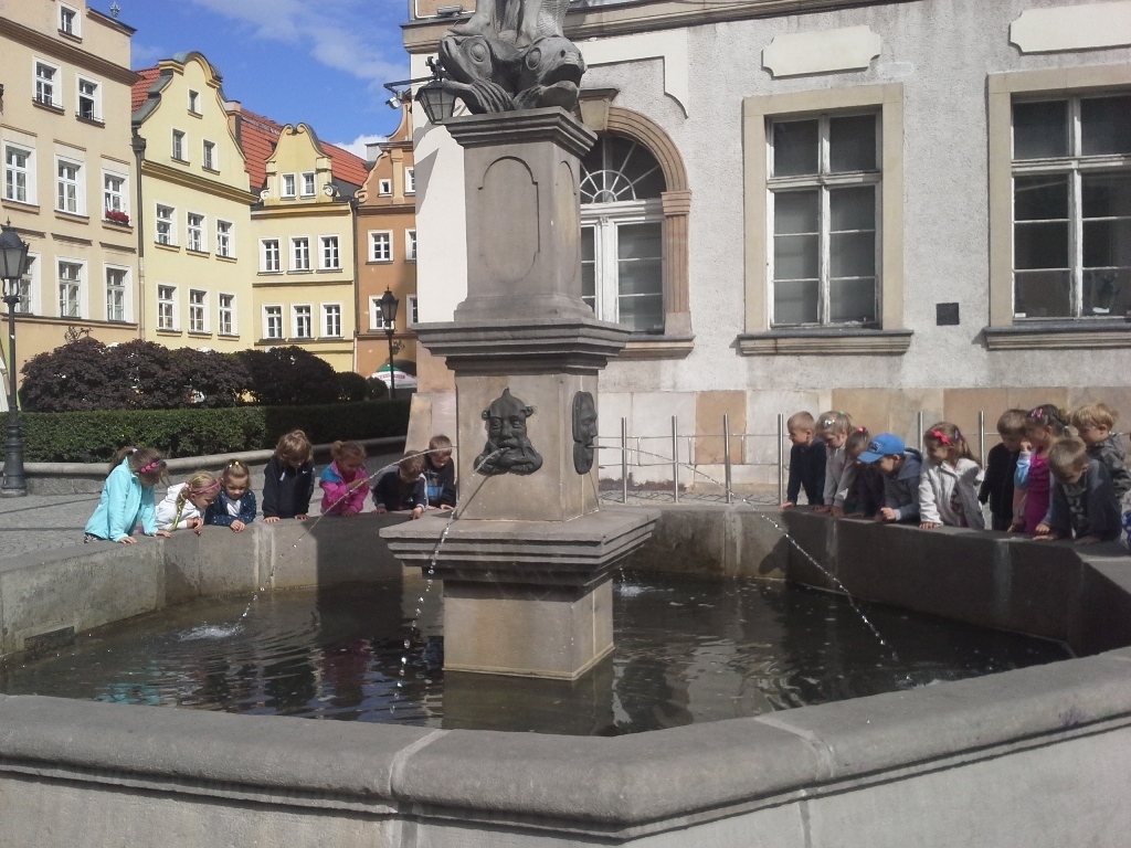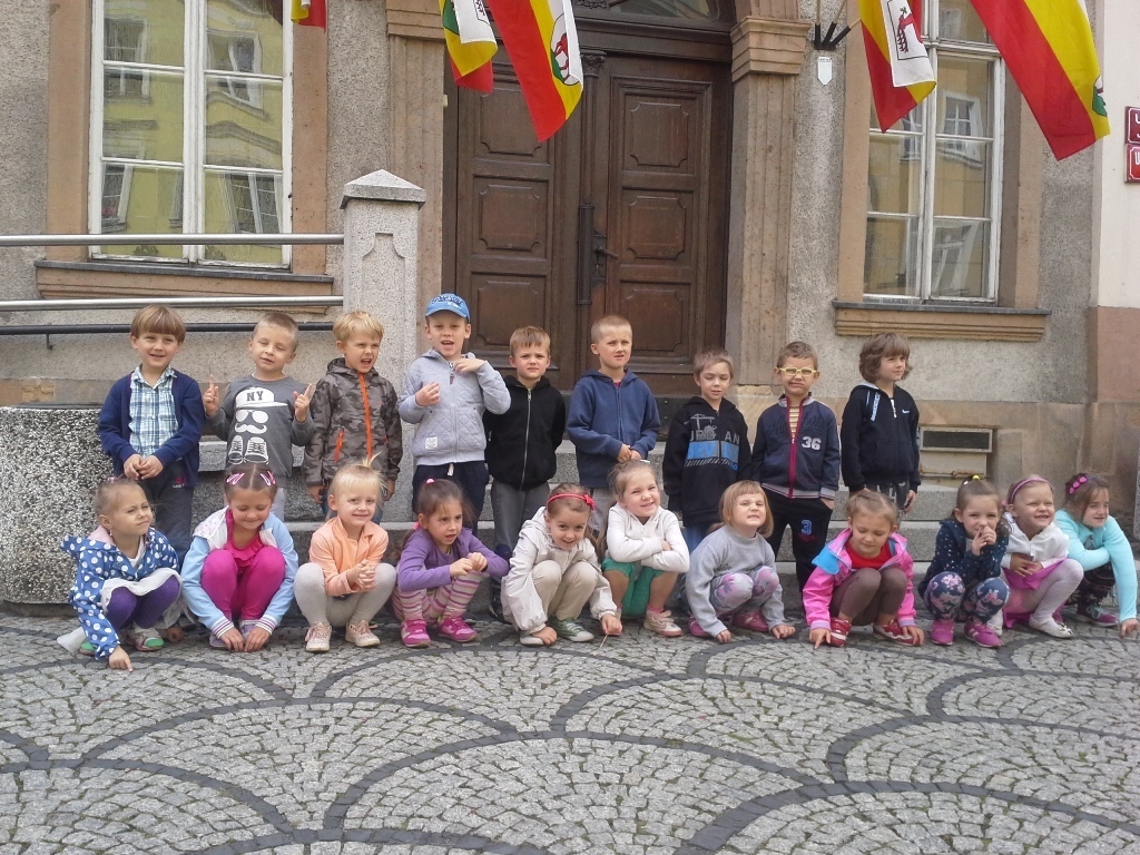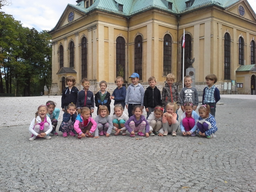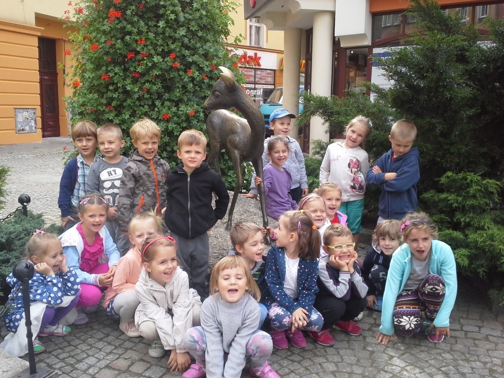 Dnia 18 września grupa starszaków wybrała się na wyprawę ulicami naszego miasta. Najpierw skierowaliśmy się w stronę Placu Ratuszowego, który wcześniej oglądaliśmy na fotografiach i widokówkach. Dzieciom bardzo podobała się fontanna. Jaka szkoda, że nie można było się popluskać. Następnie ruszyliśmy głównym deptakiem obok zabytkowego tramwaju, a dalej ulicą Konopnickiej, aż do Bramy Wojanowskiej. Kolejnym obowiązkowym przystankiem była fotografia z jelonkiem, skąd mieliśmy już tylko parę kroków do Kościoła Garnizonowego. Starczyło nam jeszcze sił na chwilę zabawy na miejskim placu zabaw, a potem wyczerpani udaliśmy się na przystanek MZK, skąd autobus zawiózł nas prawie do samego przedszkola. Zmęczeni, zadowoleni i uśmiechnięci wróciliśmy w sam raz na obiad.