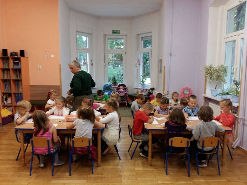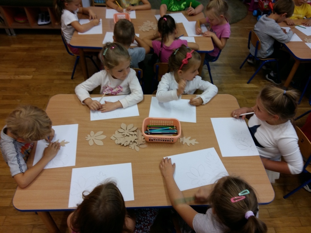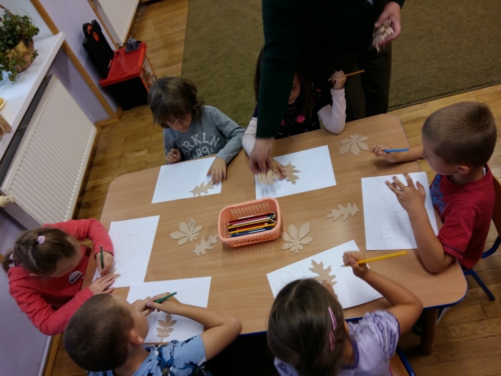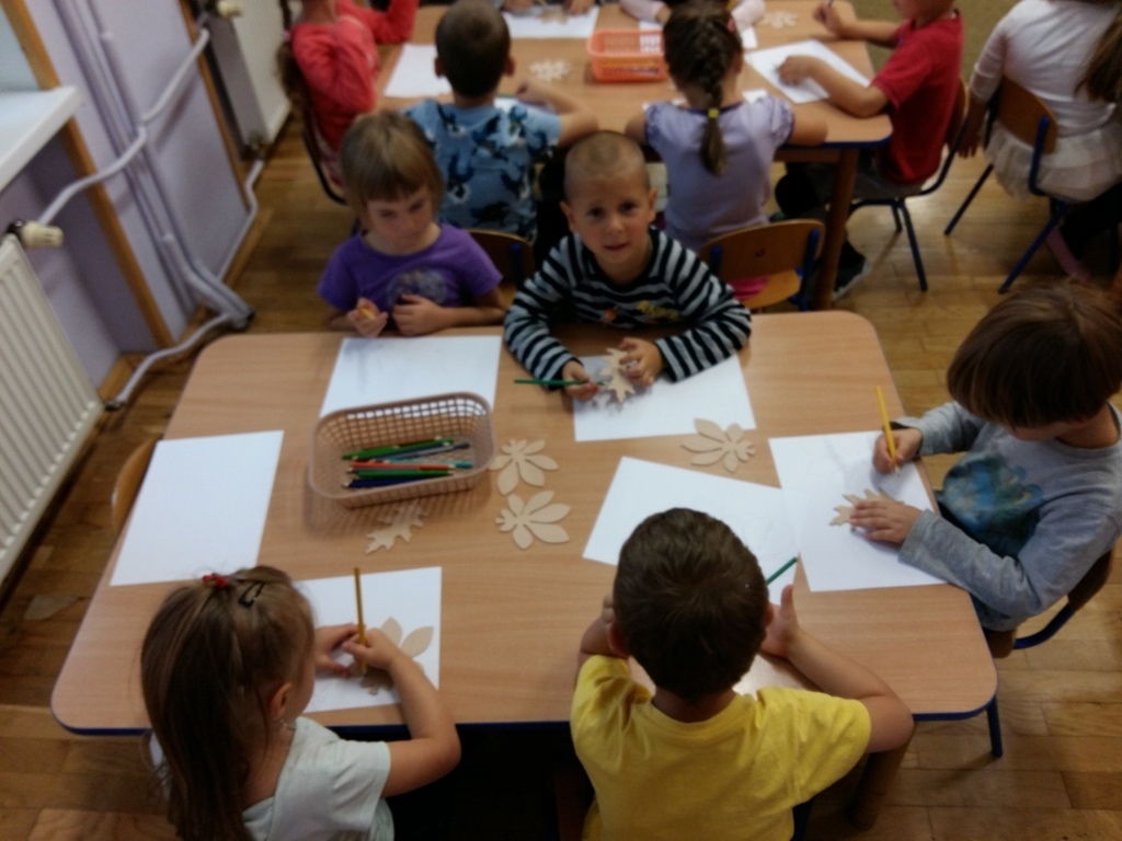 Dowiedzieliśmy się, że dziś jest „Dzień spadającego liścia”, dlatego też zajęcia były związane właśnie z listkami. Próbowaliśmy odgadnąć do jakich drzew należą sylwety liści prezentowane przez panią Bogusię. Niektóre pamiętaliśmy z poprzednich zajęć, ale niektóre były bardzo trudne dlatego pani edukator trochę nam pomagała. Odrysowywaliśmy także kształty liści na kartce, starając się stworzyć obrazek pełen barw jesieni. Nasze wspaniałe prace zostały wyeksponowane w sali, a my czekamy na kolejne zajęcia z naszą wspaniałą panią Bogusią.