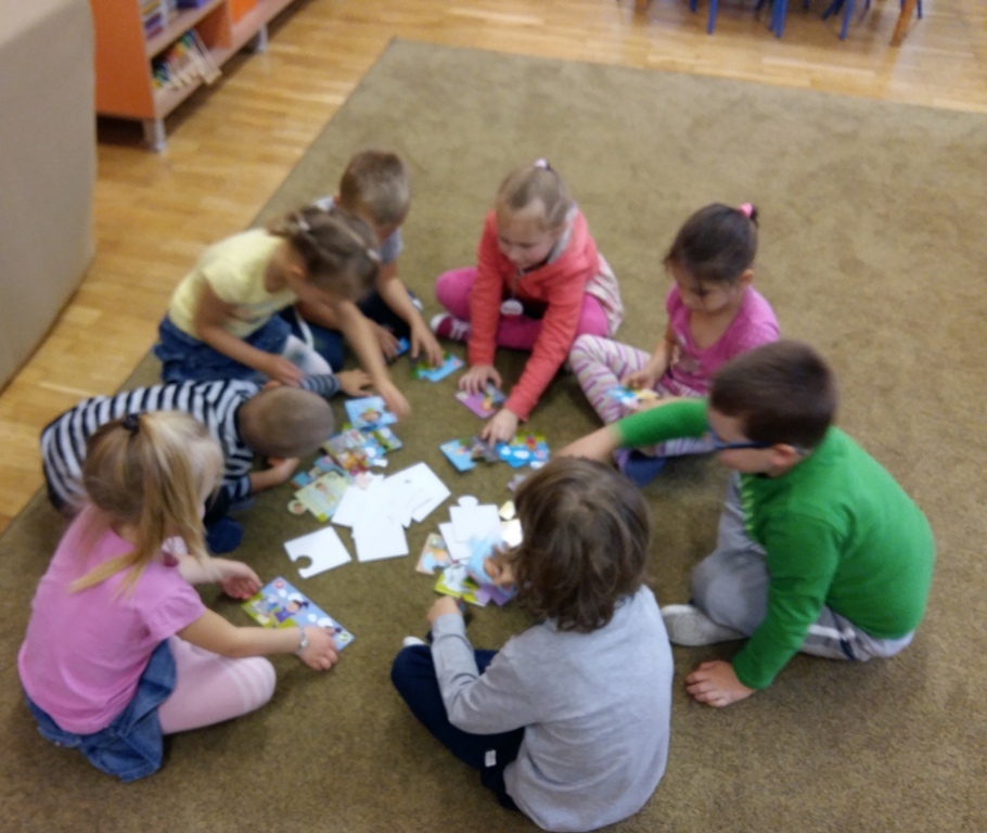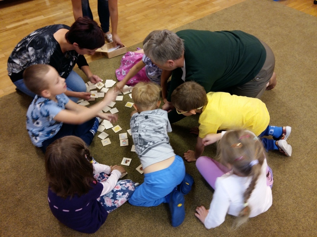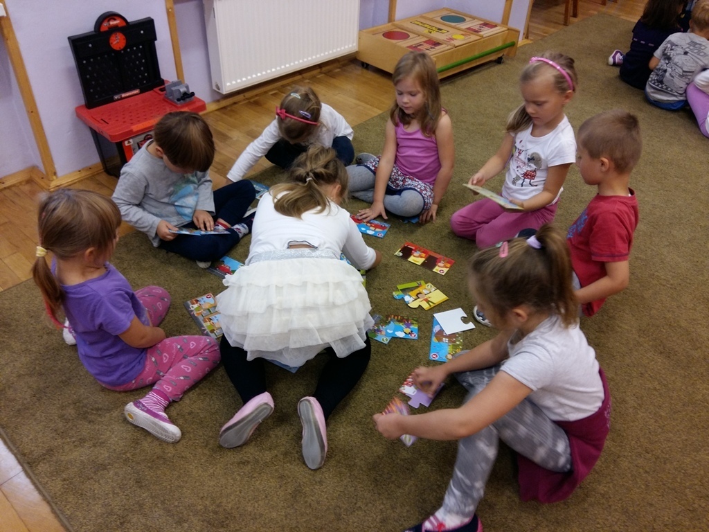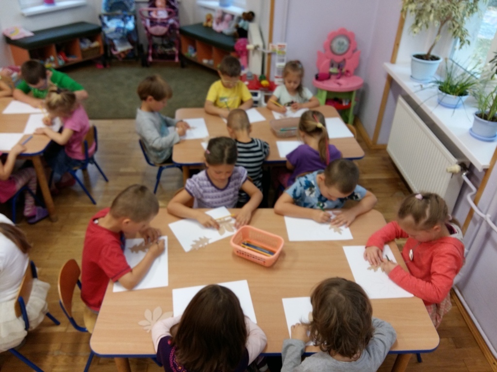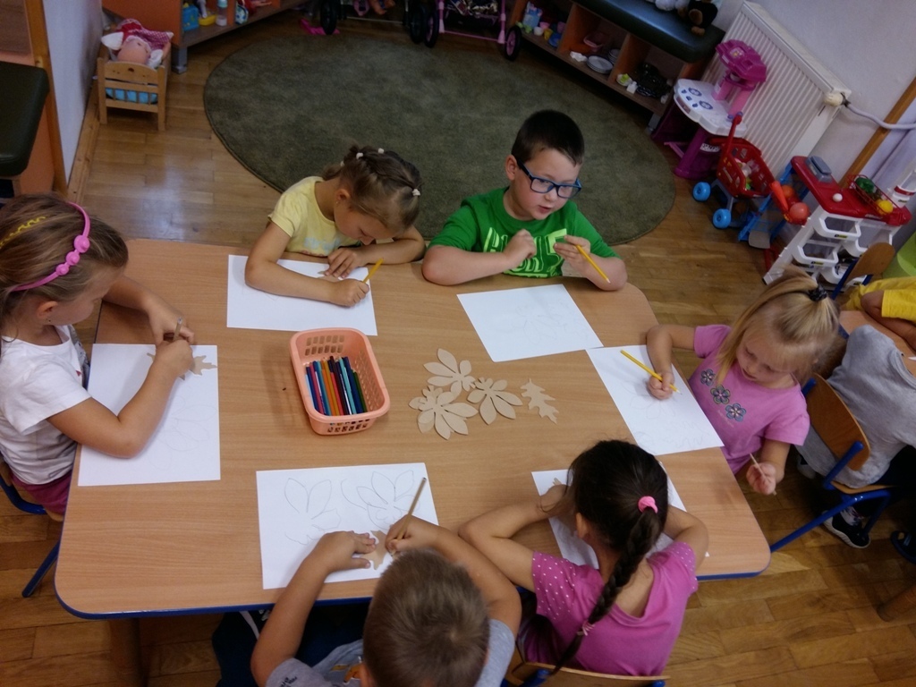 Dowiedzieliśmy się, że dziś jest „Dzień spadającego liścia”, dlatego też zajęcia były związane właśnie z listkami. Próbowaliśmy odgadnąć do jakich drzew należą sylwety liści prezentowane przez panią Bogusię. Niektóre pamiętaliśmy z poprzednich zajęć, ale niektóre były bardzo trudne dlatego pani edukator trochę nam pomagała. Odrysowywaliśmy także kształty liści na kartce, starając się stworzyć obrazek pełen barw jesieni. Nasze wspaniałe prace zostały wyeksponowane w sali, a my czekamy na kolejne zajęcia z naszą wspaniałą panią Bogusią.