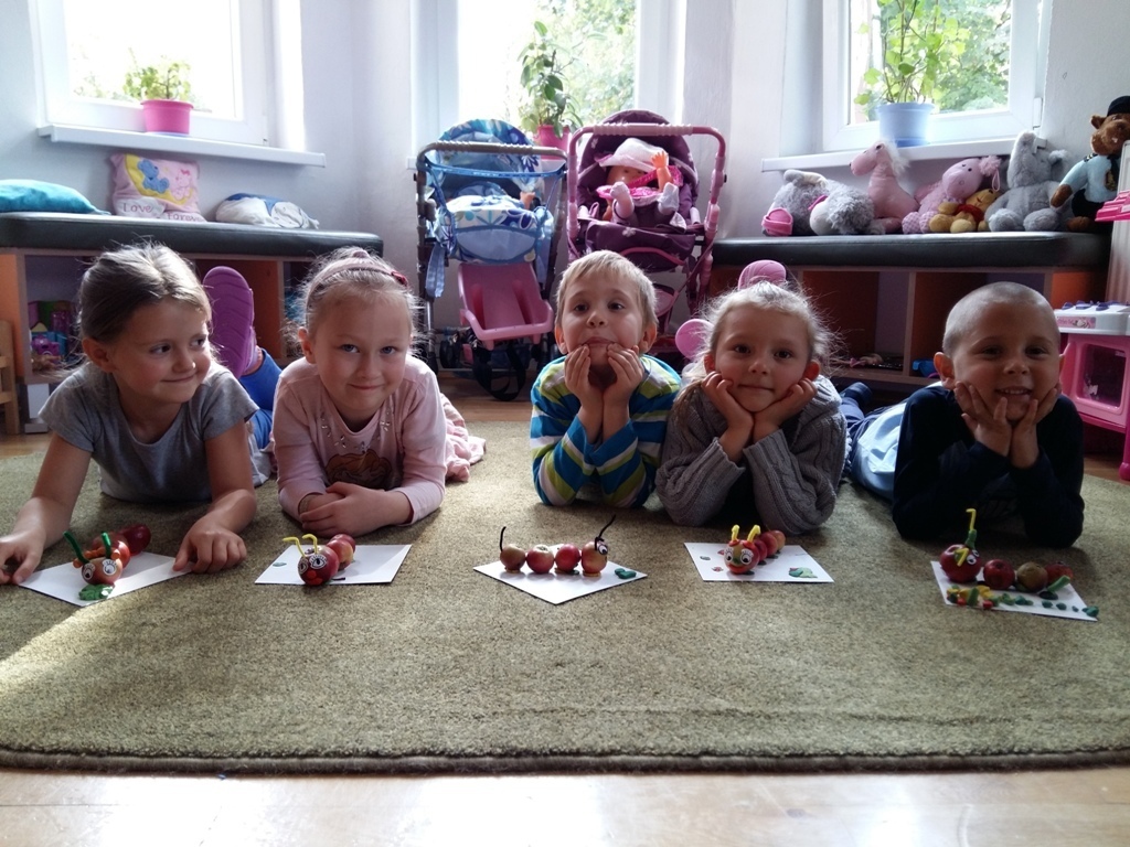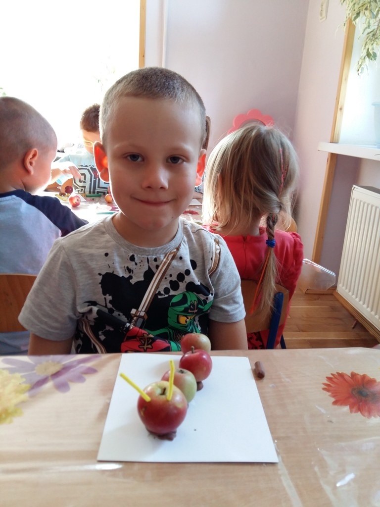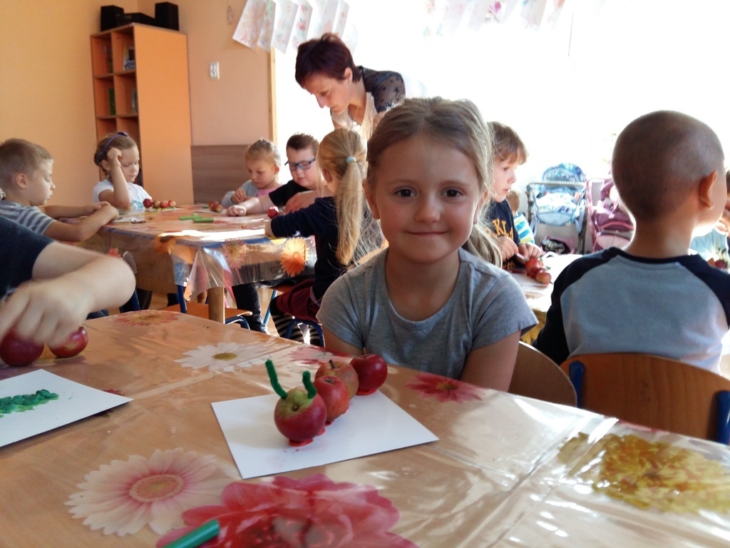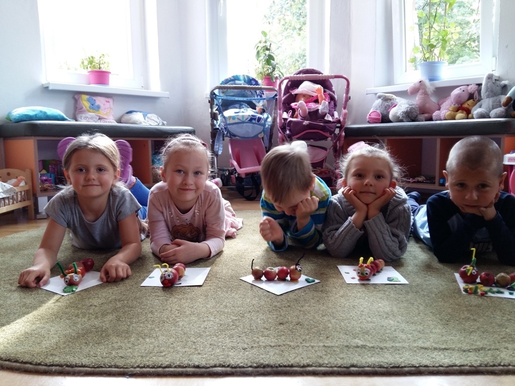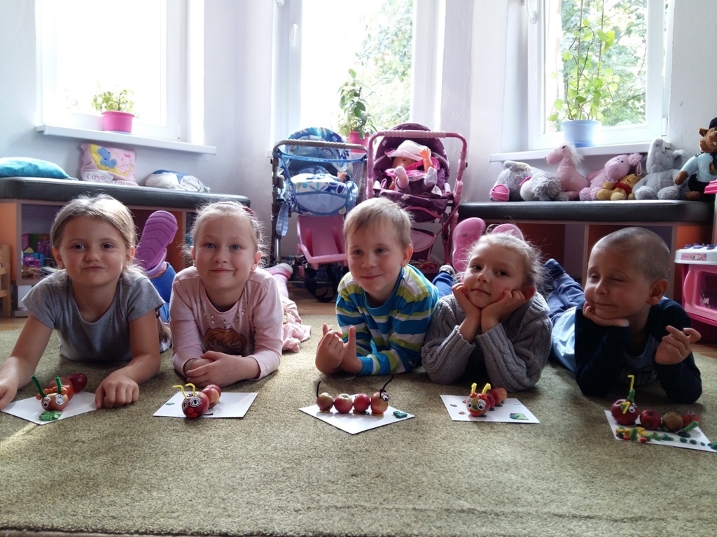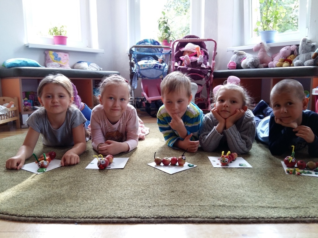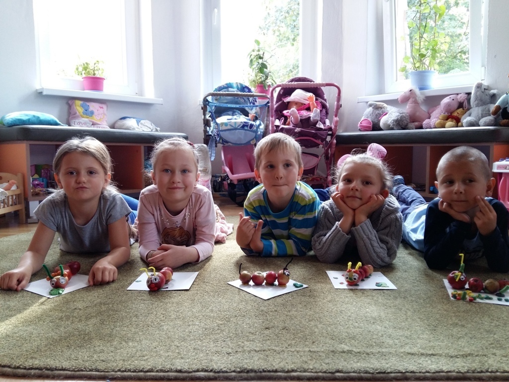 Dnia 25.09 odbyły się kolejne ciekawe zajęcia matematyczne. Tym razem przeliczaliśmy i porównywaliśmy wielkości przy użyciu liczmanów, którymi były małe jabłuszka. Przypomnieliśmy sobie znaczenie określeń: „najmniejszy", „największy", „średni", „duży" i „mały". Z tych porównań powstały matematyczne gąsienice. Starszaki stworzyły piękną rodzinę jabłuszkowych gąsienic. Kolejne ciekawe zajęcia przed nami.
