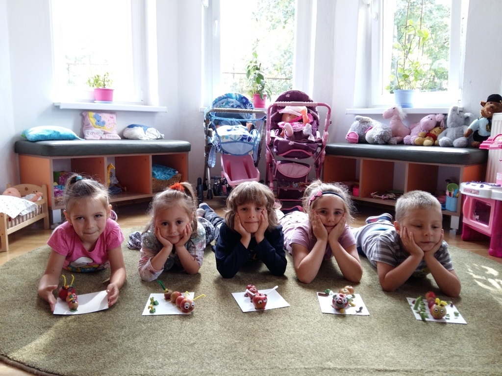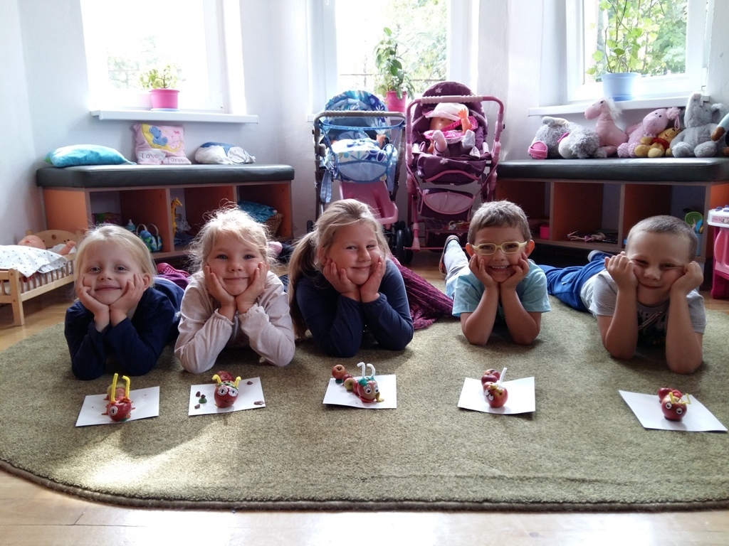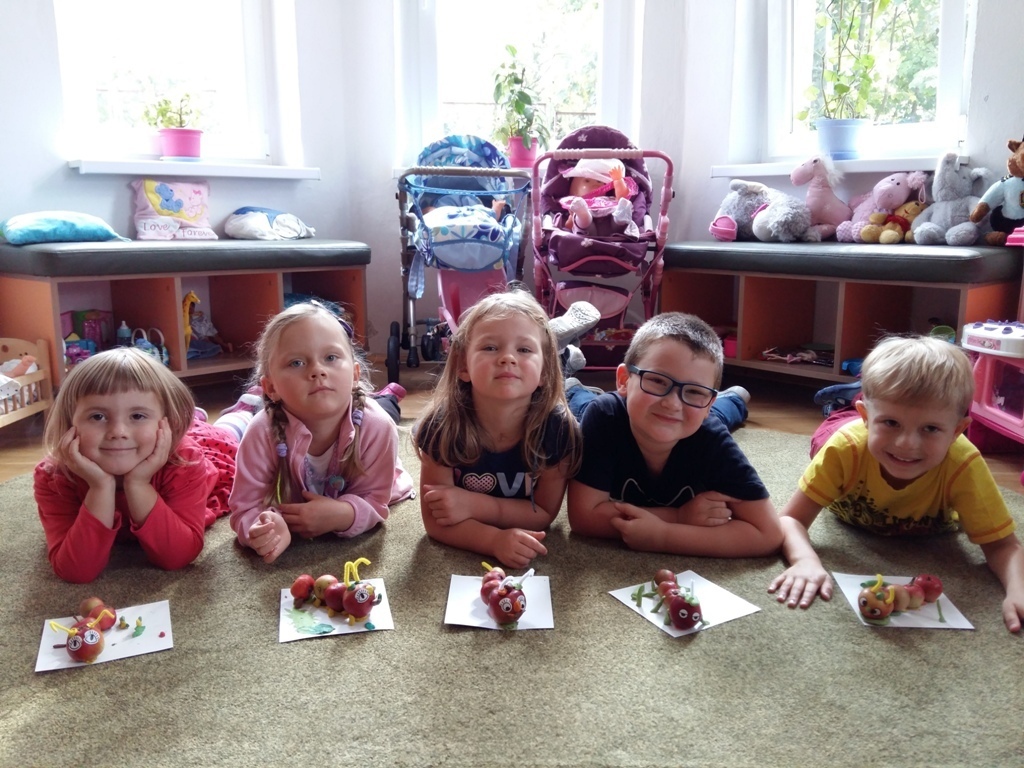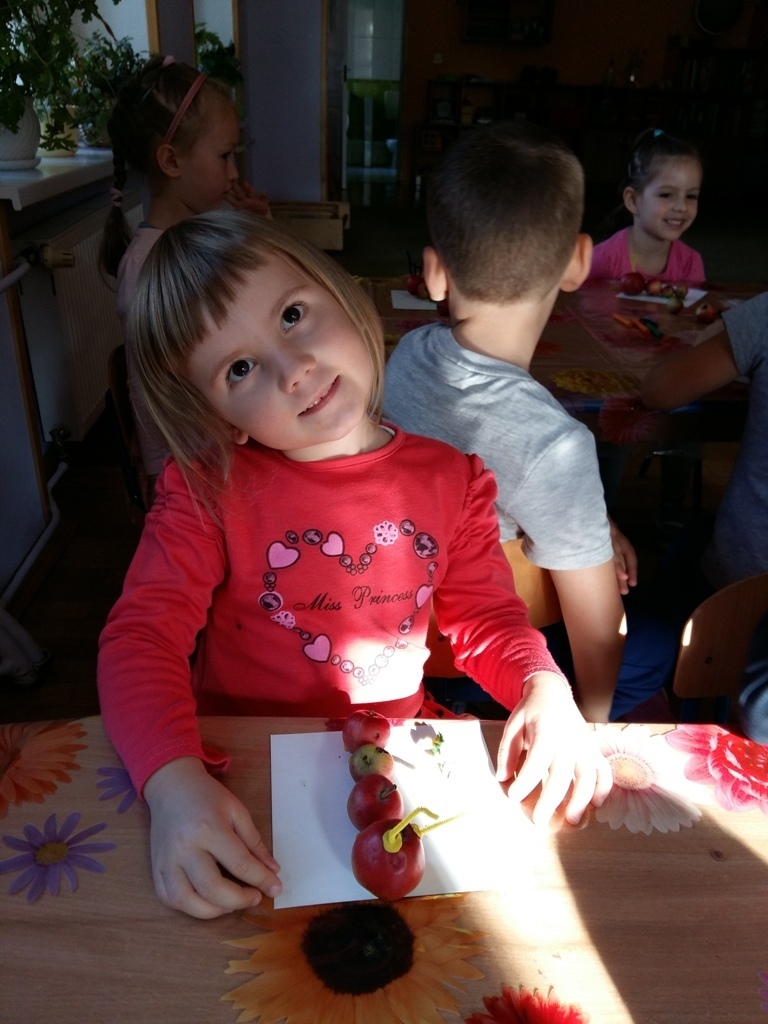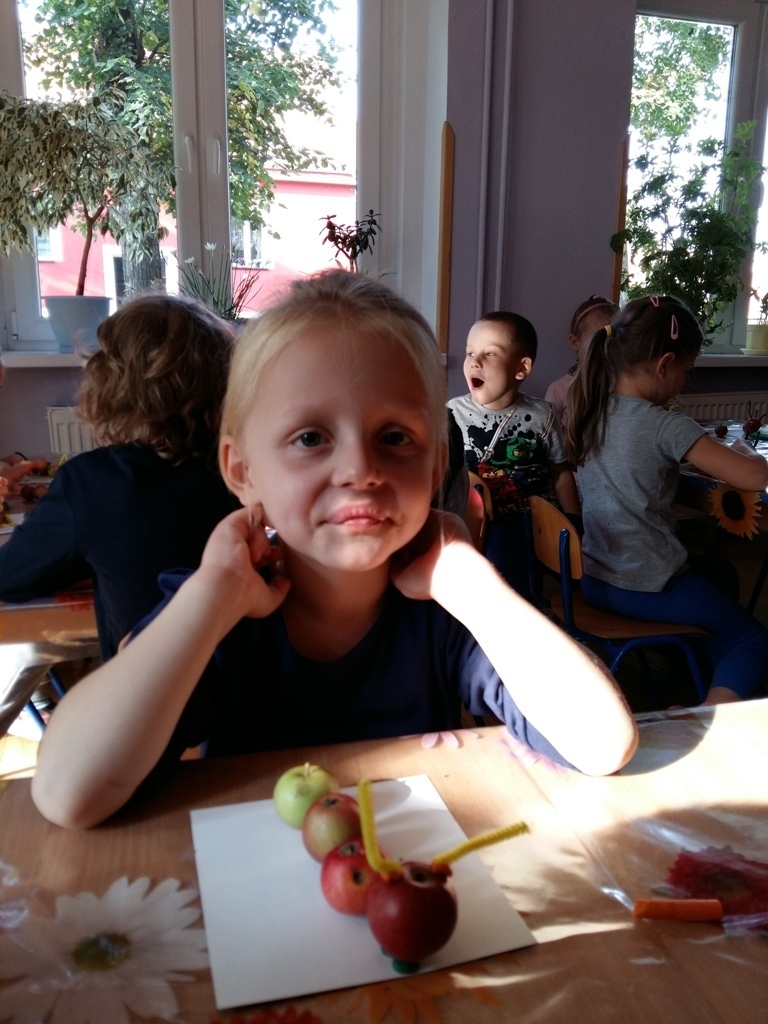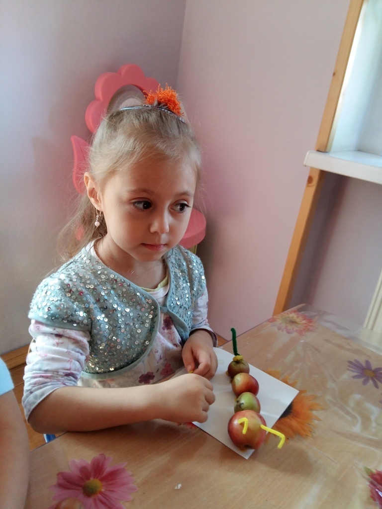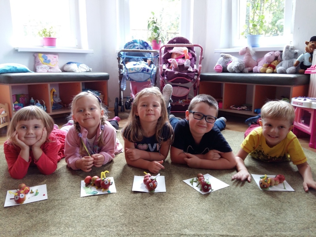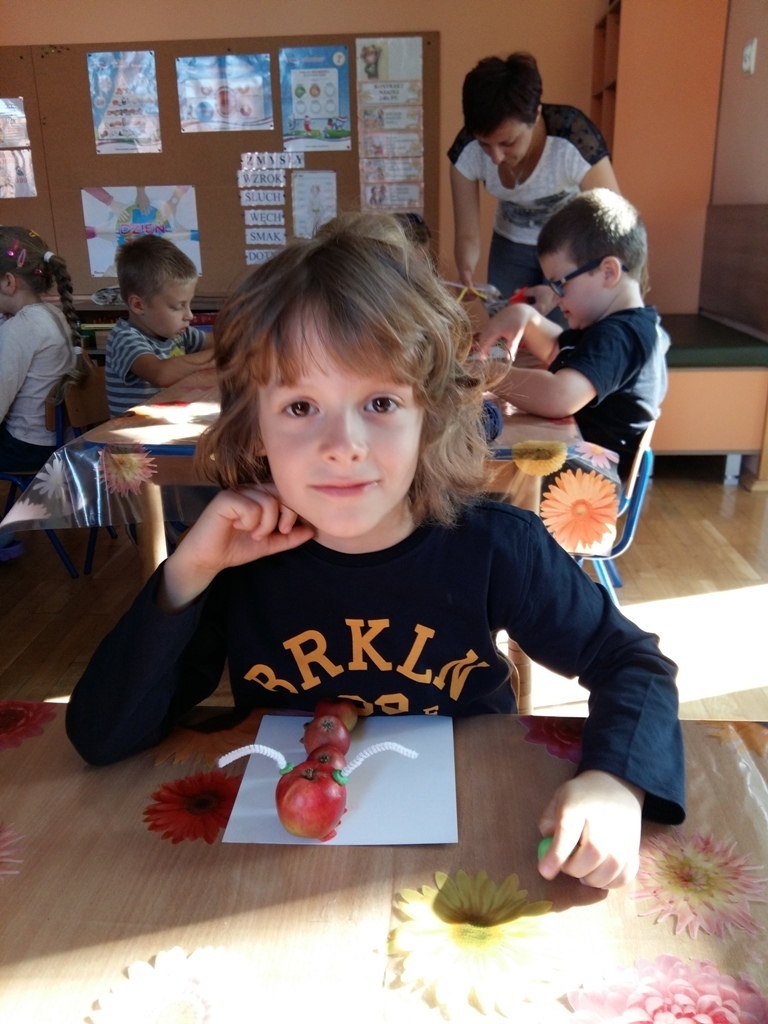 Dnia 25.09 odbyły się kolejne ciekawe zajęcia matematyczne. Tym razem przeliczaliśmy i porównywaliśmy wielkości przy użyciu liczmanów, którymi były małe jabłuszka. Przypomnieliśmy sobie znaczenie określeń: „najmniejszy", „największy", „średni", „duży" i „mały". Z tych porównań powstały matematyczne gąsienice. Starszaki stworzyły piękną rodzinę jabłuszkowych gąsienic. Kolejne ciekawe zajęcia przed nami.