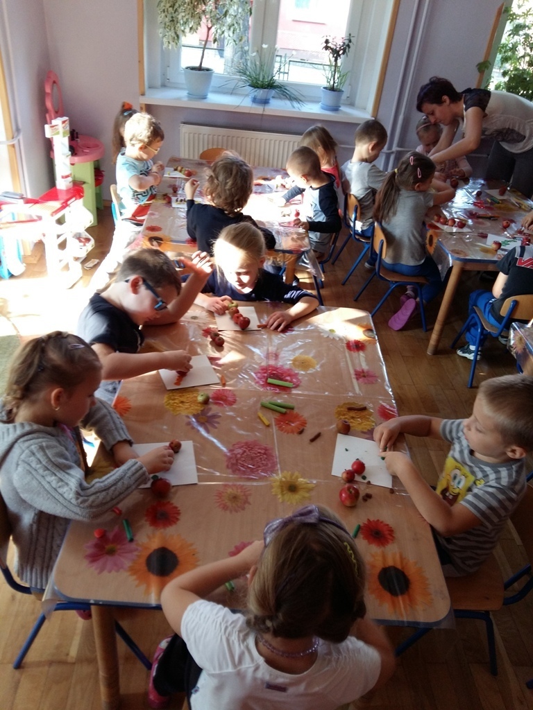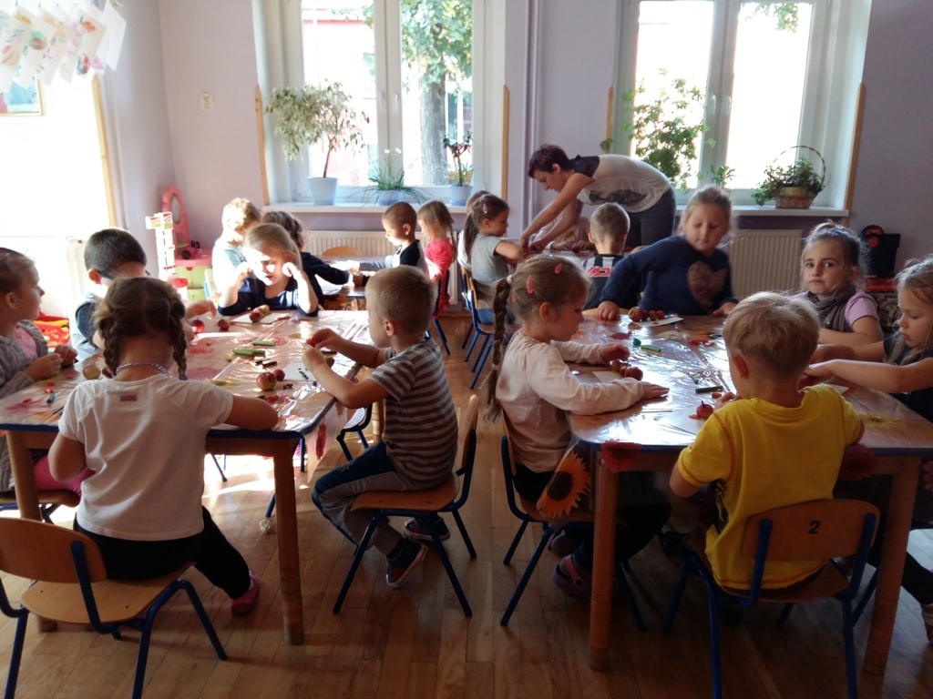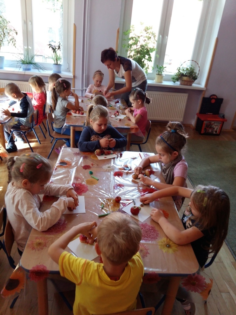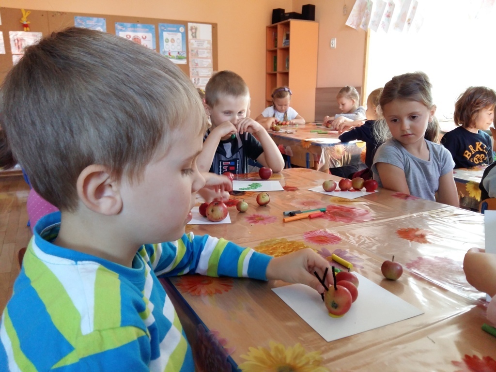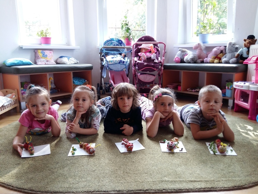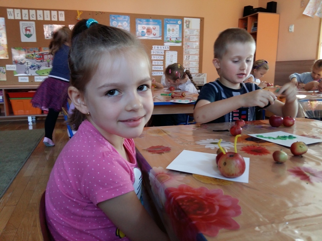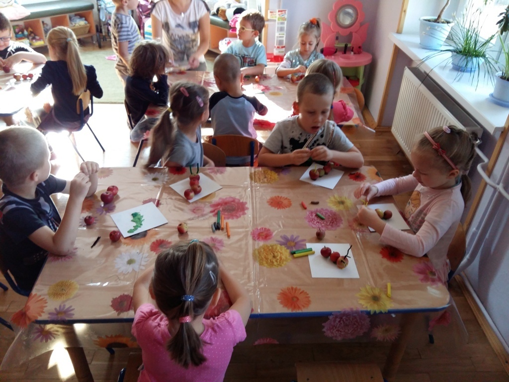 Dnia 25.09 odbyły się kolejne ciekawe zajęcia matematyczne. Tym razem przeliczaliśmy i porównywaliśmy wielkości przy użyciu liczmanów, którymi były małe jabłuszka. Przypomnieliśmy sobie znaczenie określeń: „najmniejszy", „największy", „średni", „duży" i „mały". Z tych porównań powstały matematyczne gąsienice. Starszaki stworzyły piękną rodzinę jabłuszkowych gąsienic. Kolejne ciekawe zajęcia przed nami.