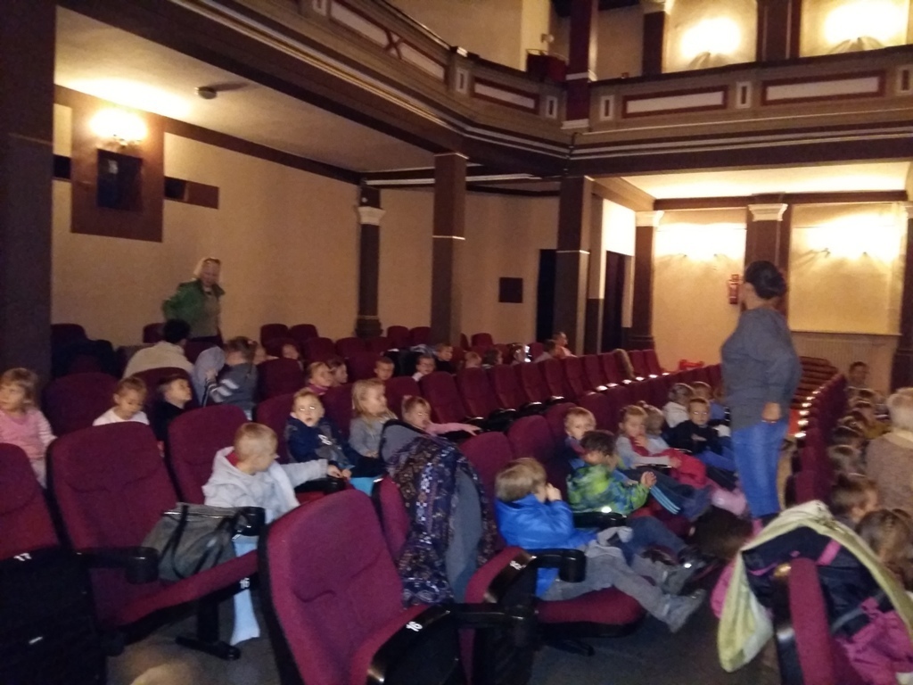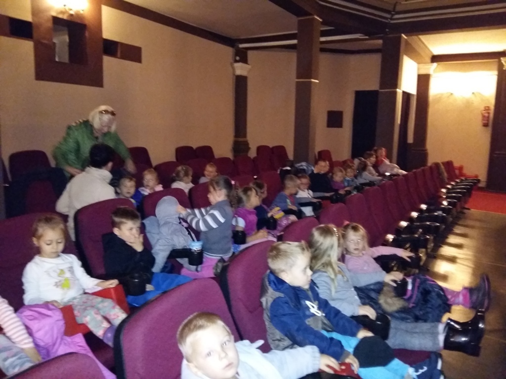 16.10.2015r. Przedszkolaki z Tuptusia wybrały się do zaprzyjaźnionego Kina Grand w Jeleniej Górze na bardzo interesujący film pt. " Hotel Transylwania II ". To wesoła komedia o losach rodziny. Wśród dziwolągów, strzyg, zombie i wilkołaków po gotyckich korytarzach hotelu przechadzają się ludzcy turyści ze swoimi ludzkimi wynalazkami. Nikt się niczemu nie dziwi i nikogo się nie boi. Tylko Dracula tęskni skrycie za starym ładem, gubi się w nowym porządku i wciąż nie umie obsłużyć telefonu. Jego ryżowłosy wnuczek od pająków na śniadanie woli telewizyjne bajki z Panem Ciasiem, który przestrzega, żeby nie zjeść za dużo ciastek. Wszystko komplikuje się jednak gdy młodzi planują wychować synka bez Dziadzia Drakuli w ludzkim świecie i tu zaczyna się wesoła przygoda Dziadzia, Wnusia i innych potworów. Ta wesoła opowieść niesie ze sobą bardzo ważne przesłanie, że akceptowanie tego co inne nie grozi utratą własnej tożsamości, a więzi rodzinne i przyjaźń są ważniejsze niż tysiącletnie przyzwyczajenia. Wszystkie dzieci odczytały morał pochodzący z bajki i już nie mogą doczekać się kolejnego wyjścia do kina.