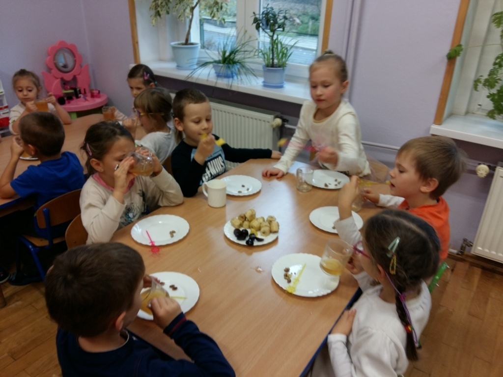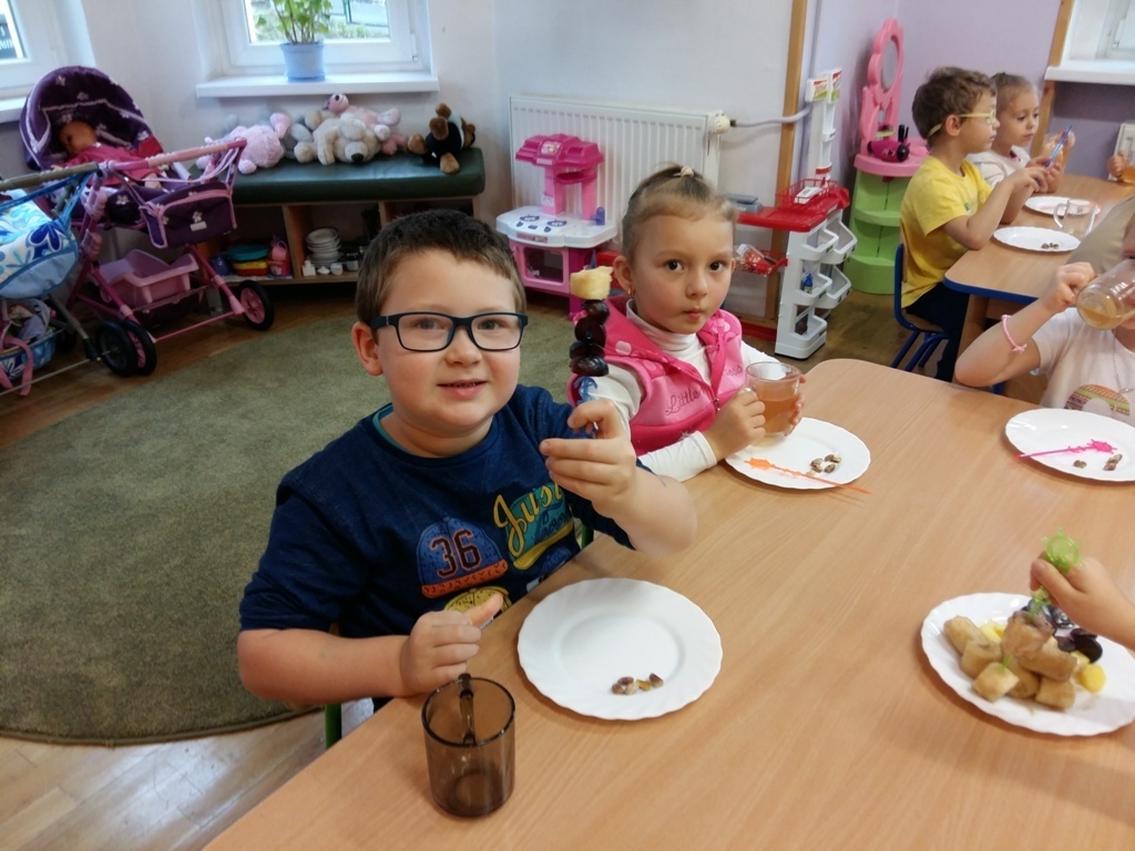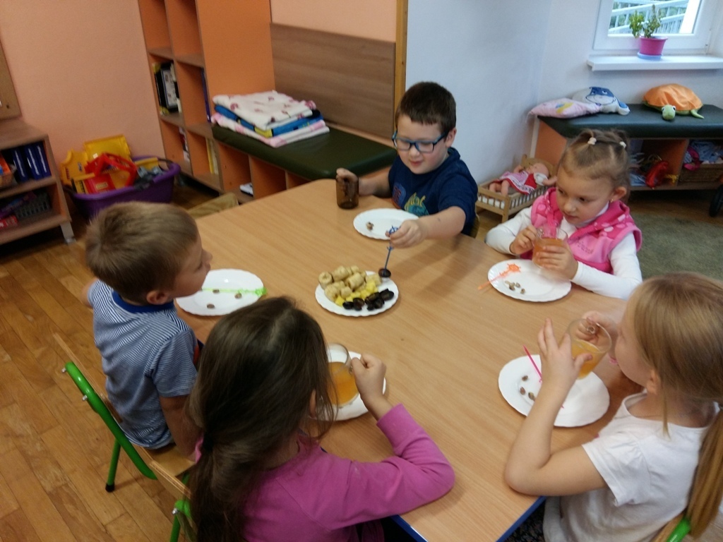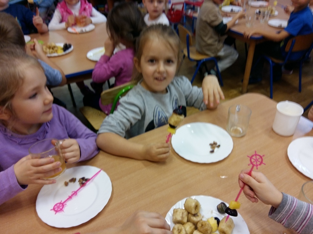 20.10.2015 r. choć bardzo pochmurny - w przedszkolu był radosnym dniem, poniewaź dzieci mogły czerpać satysfakcję z jedzenia. Tuptusie zostały zaskoczone mogąc same skomponować sobie II śniadanie. Dzieci miały do wyboru różne owoce, które dzielnie nakładały na patyczki i tworzyły przepiękne szaszłyki owocowe, do tego troszkę pistacji, przepyszny kisiel i wymarzony posiłek gotowy. Radości nie było końca tak jak i pomysłom dzieci na najróżniejsze przekąski.