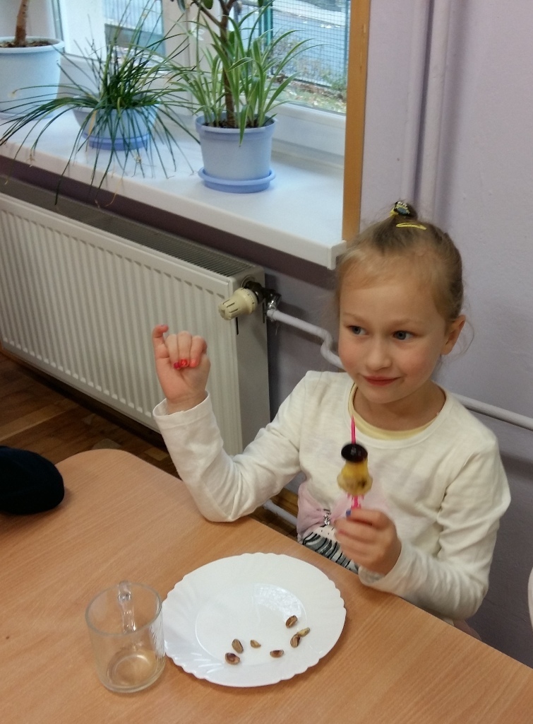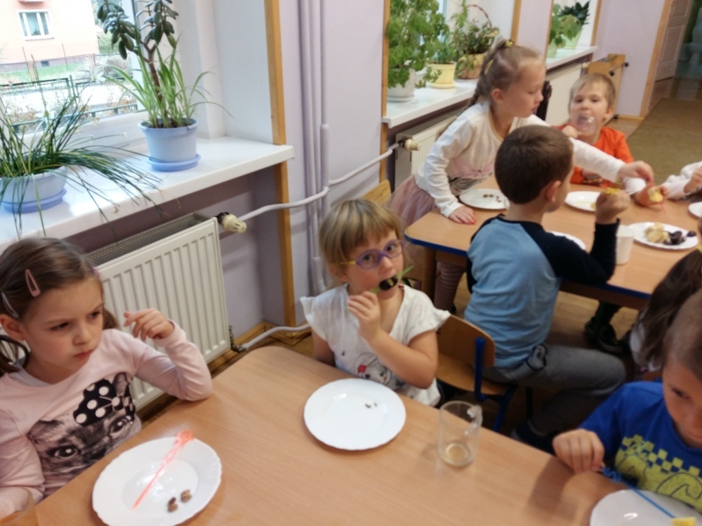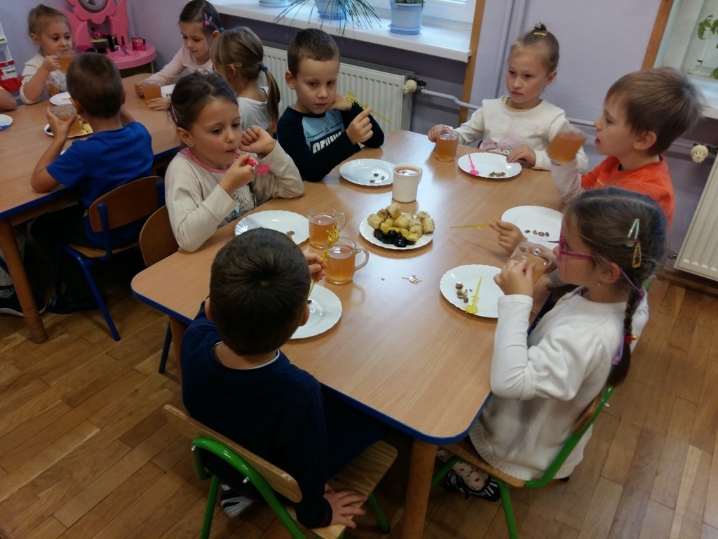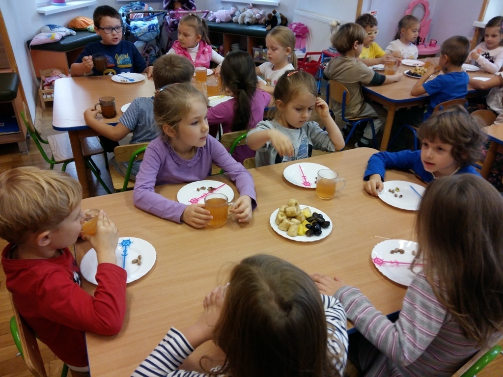 20.10.2015 r. choć bardzo pochmurny - w przedszkolu był radosnym dniem, poniewaź dzieci mogły czerpać satysfakcję z jedzenia. Tuptusie zostały zaskoczone mogąc same skomponować sobie II śniadanie. Dzieci miały do wyboru różne owoce, które dzielnie nakładały na patyczki i tworzyły przepiękne szaszłyki owocowe, do tego troszkę pistacji, przepyszny kisiel i wymarzony posiłek gotowy. Radości nie było końca tak jak i pomysłom dzieci na najróżniejsze przekąski.
