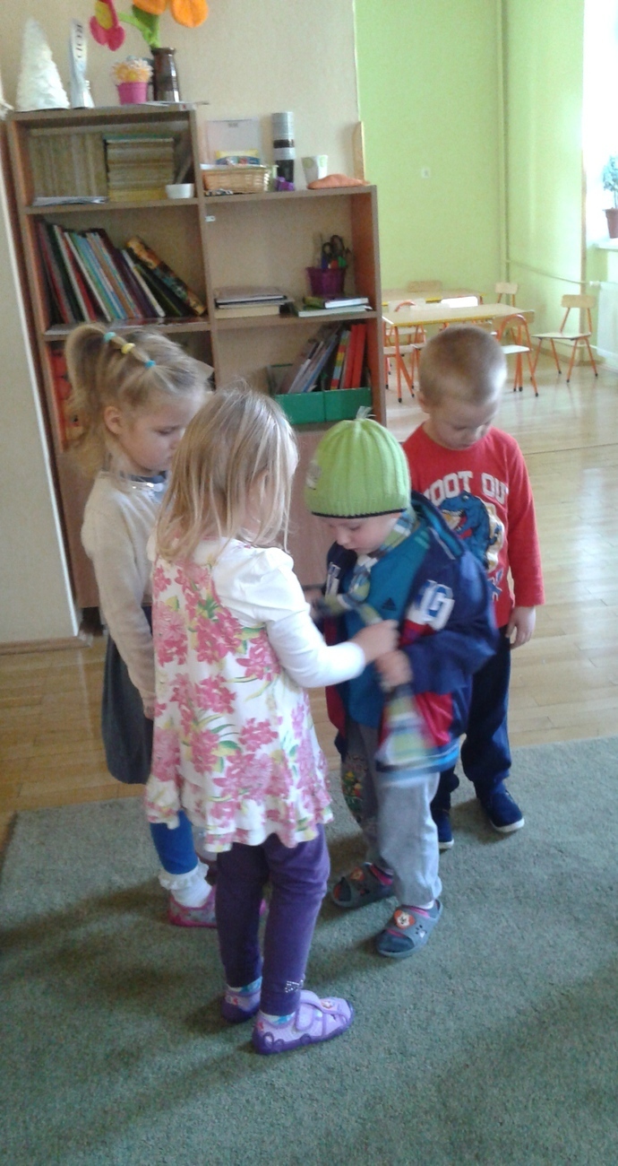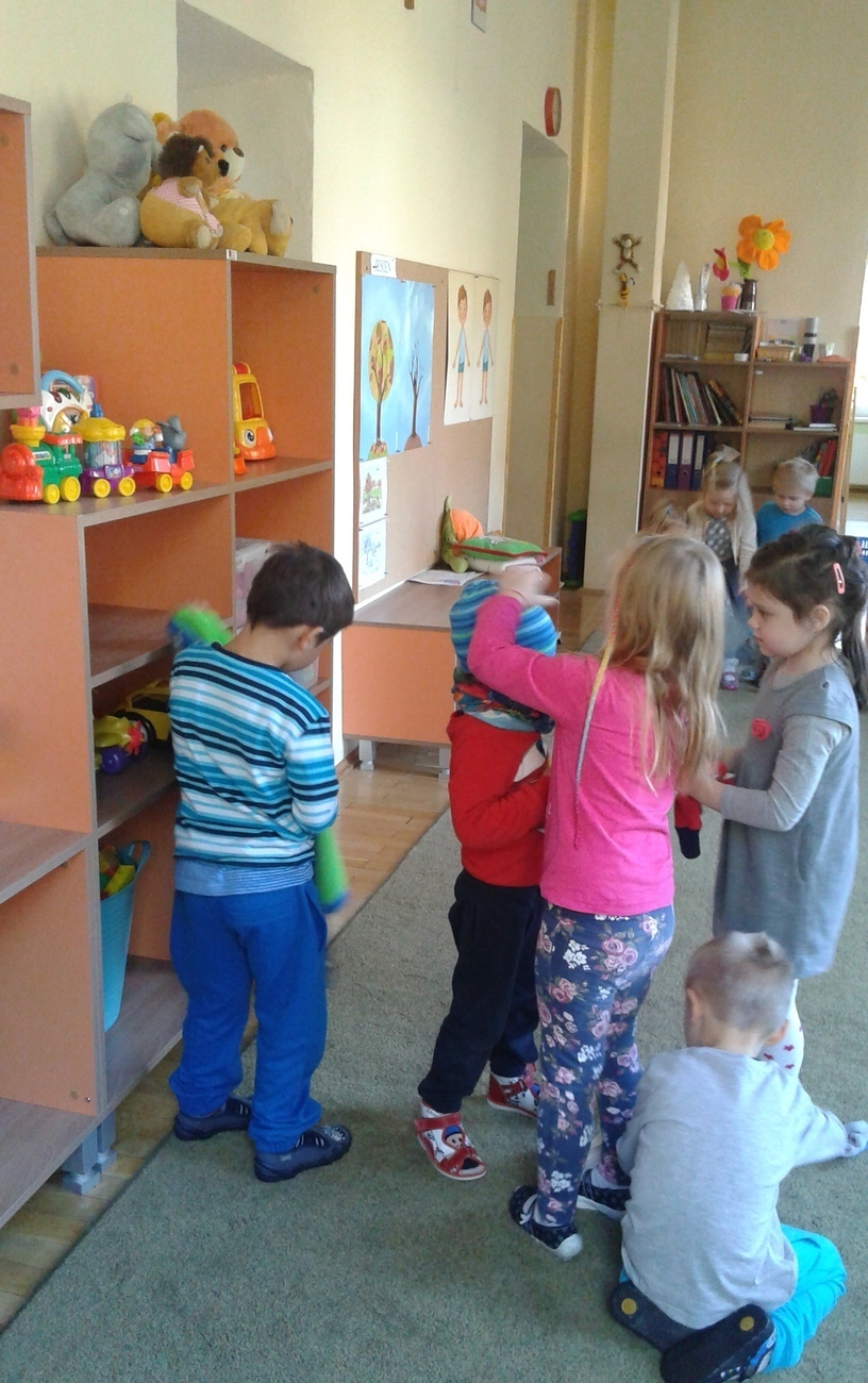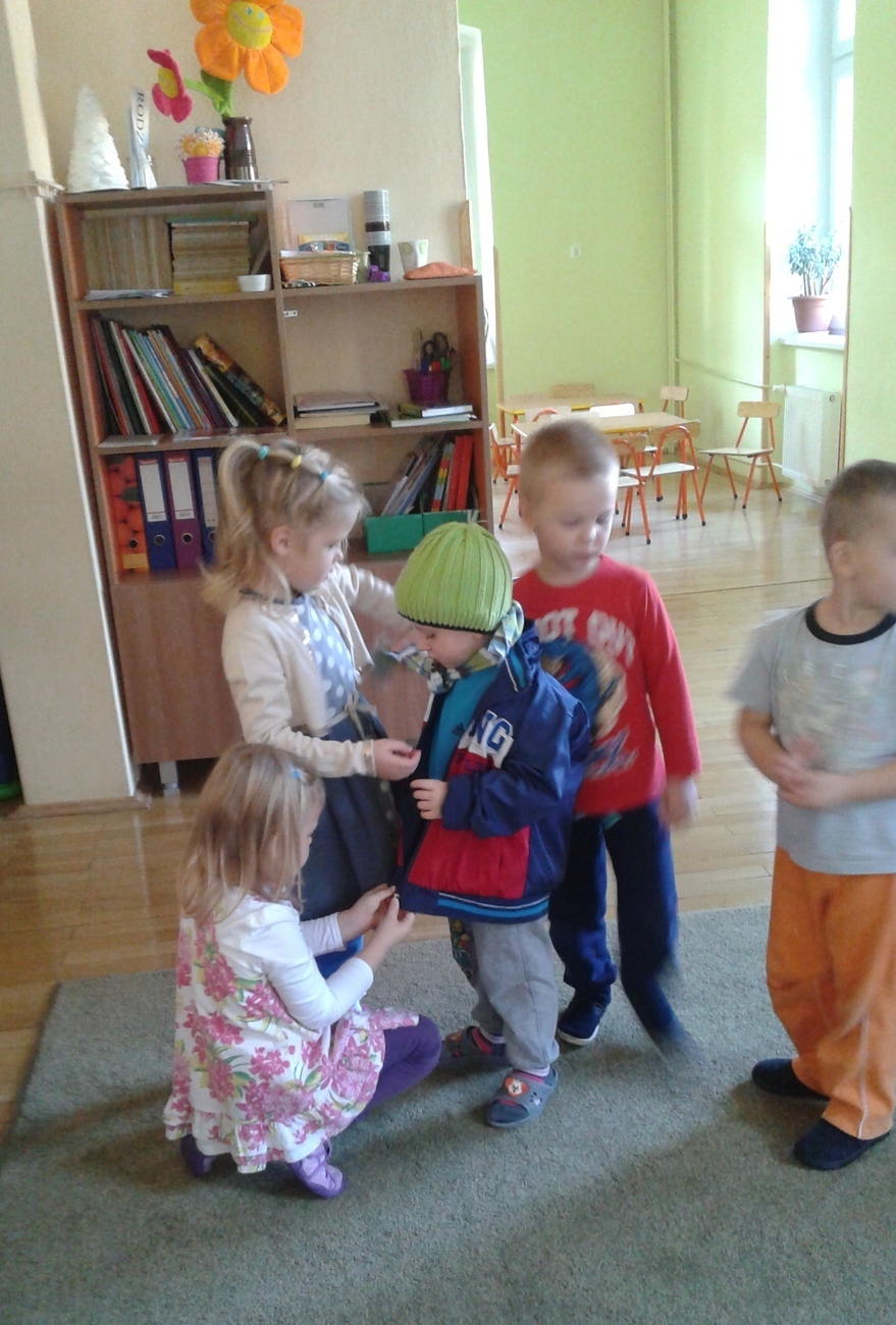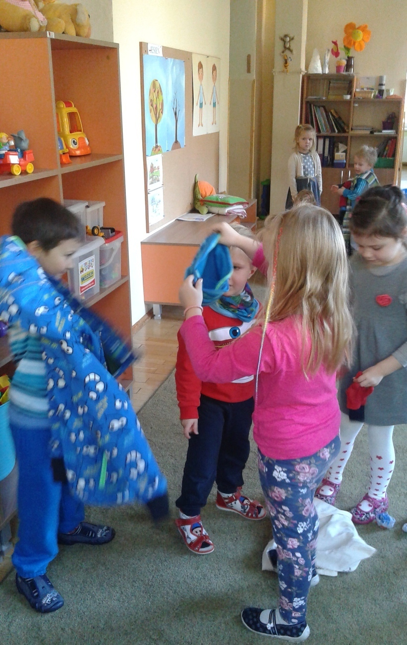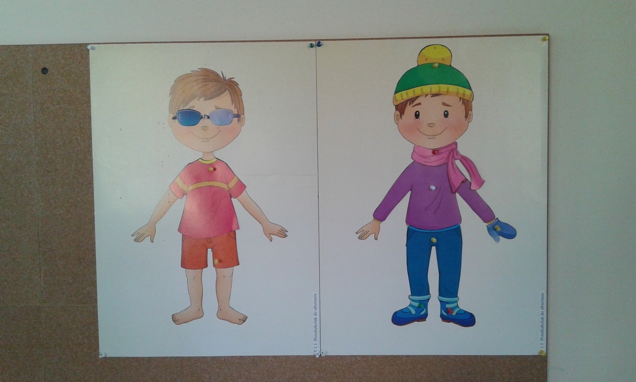 Dzisiejsze zajęcia były nie typowe. Chcieliśmy nauczyć się w jaki sposób należy ubrać się, kiedy mamy jesień, a za oknem wieje wiatr i jest okropna plucha. A jak kiedy jest wspaniałe gorące i upalne lato. Podzieliliśmy się na 4 grupy, w których wybraliśmy jednego ochotnika - manekina. Otrzymaliśmy komplet ubrań, z których mieliśmy wybrać ubrania na odpowiednią pogodę i ubrać w nie manekina.
