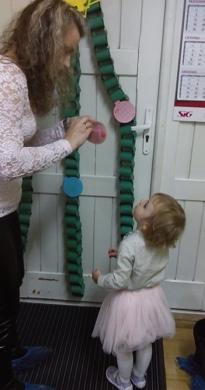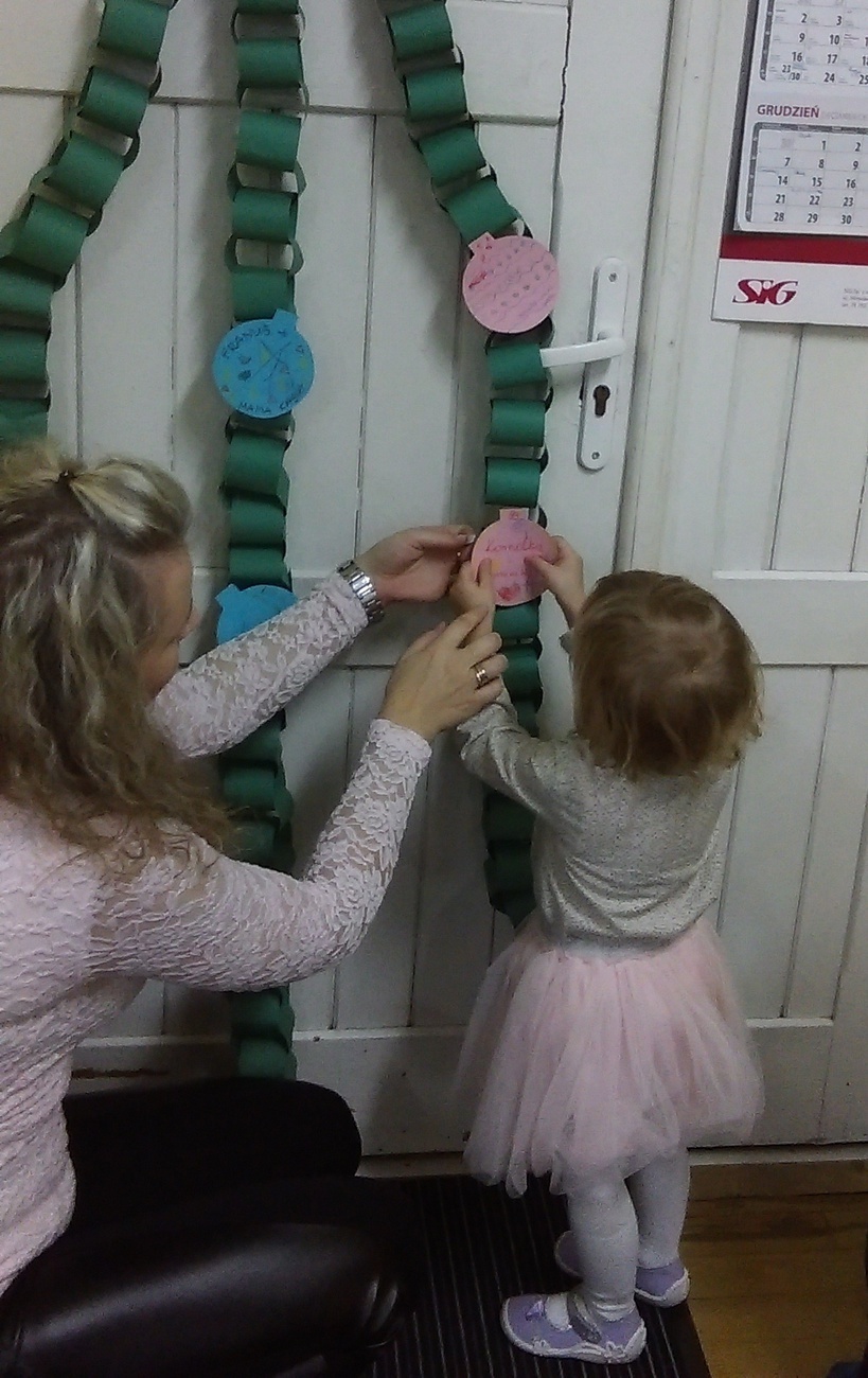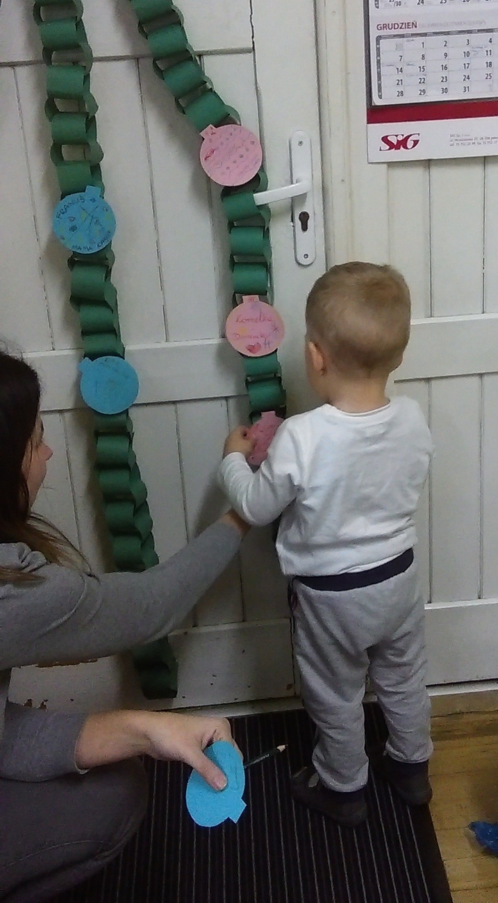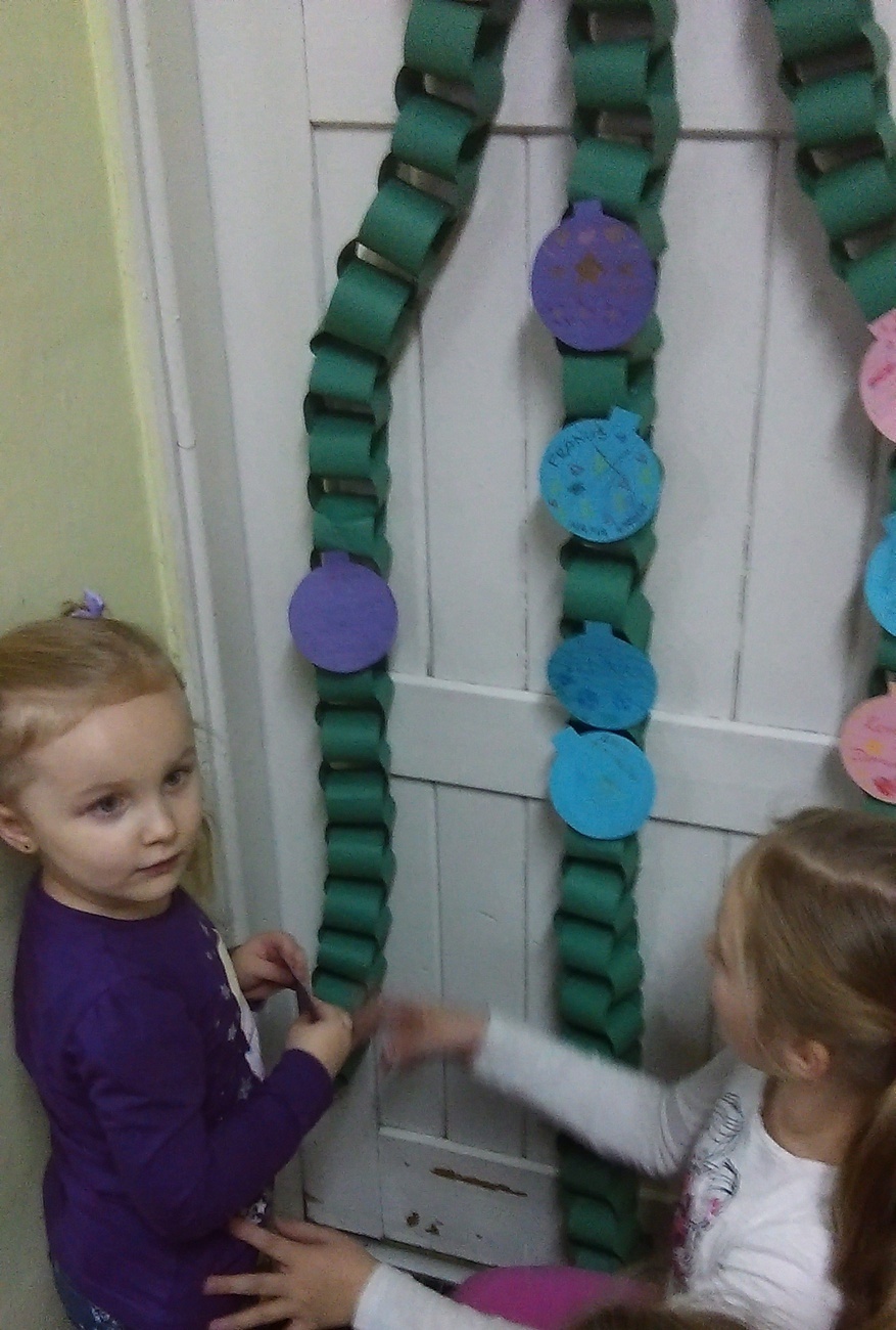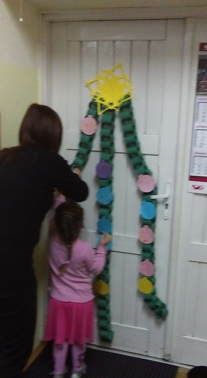 W dniu 11.12.2015 w naszej grupie odbyły się warsztaty świąteczne. Na samym początku podzieliśmy się na mniejsze grupy i każda miała za zadanie zrobienia łańcucha papierowego /całego zielonego/. Następnie te zielone łańcuchy przykleiliśmy do drzwi i tak powstała nam wielka choinka, bardzo ładna. Jednak czegoś jej brakowało, więc na zakończenie zajęć wykonaliśmy wspólnie z rodzicami kolorowe ozdoby, na których rodzice napisali nasze imiona. Tak ozdobiona choinka bardzo nam się spodobała, postanowiliśmy, że zostanie razem z nami w sali do nowego roku.