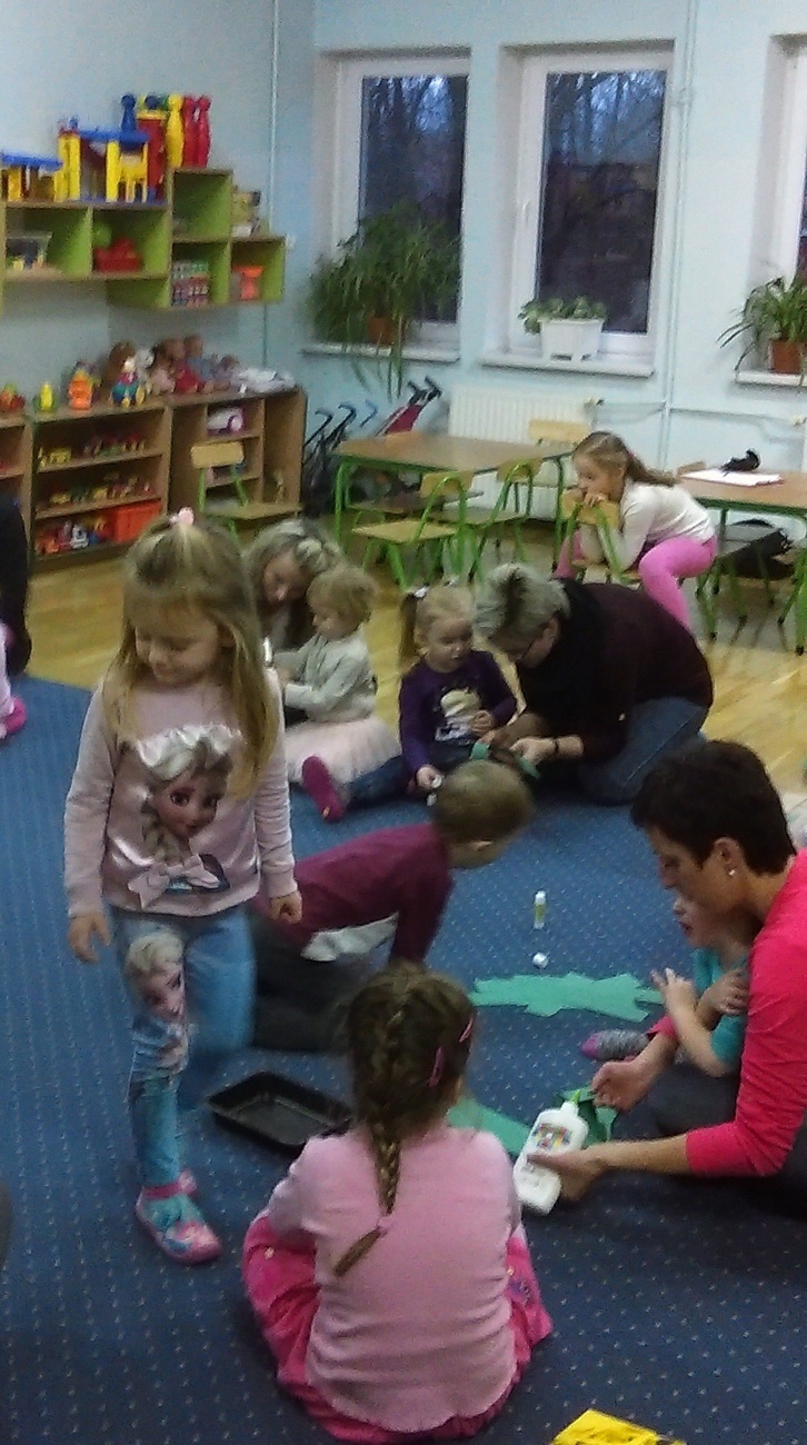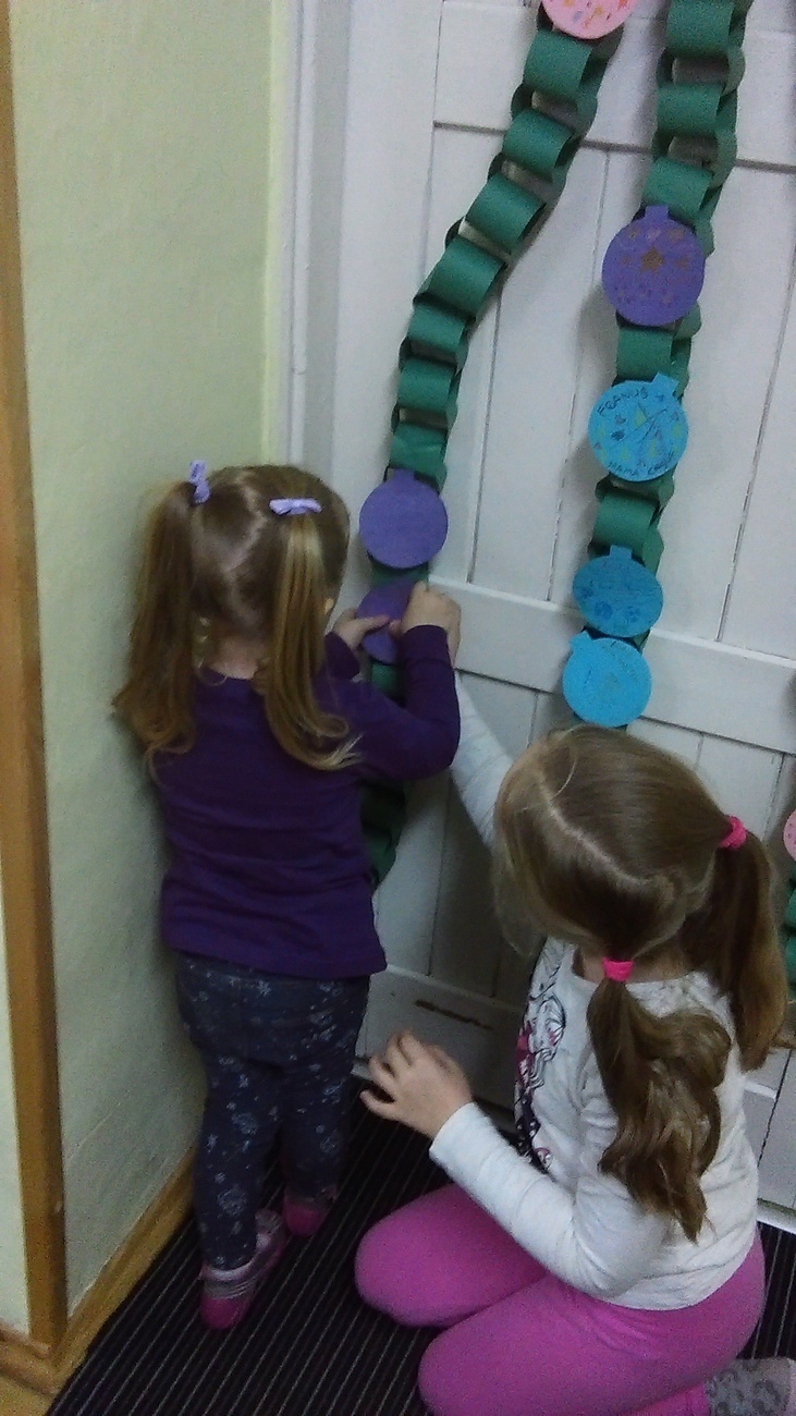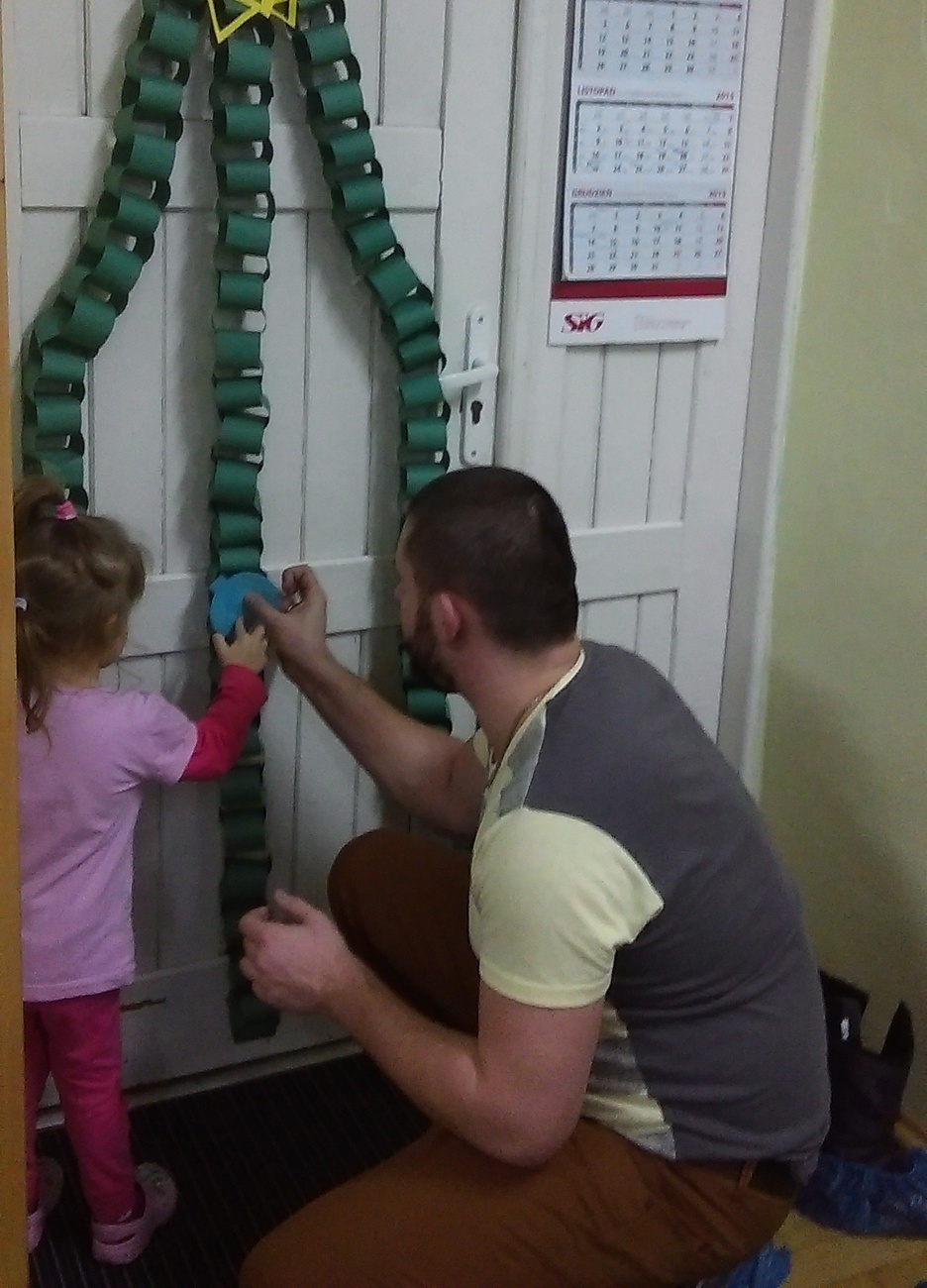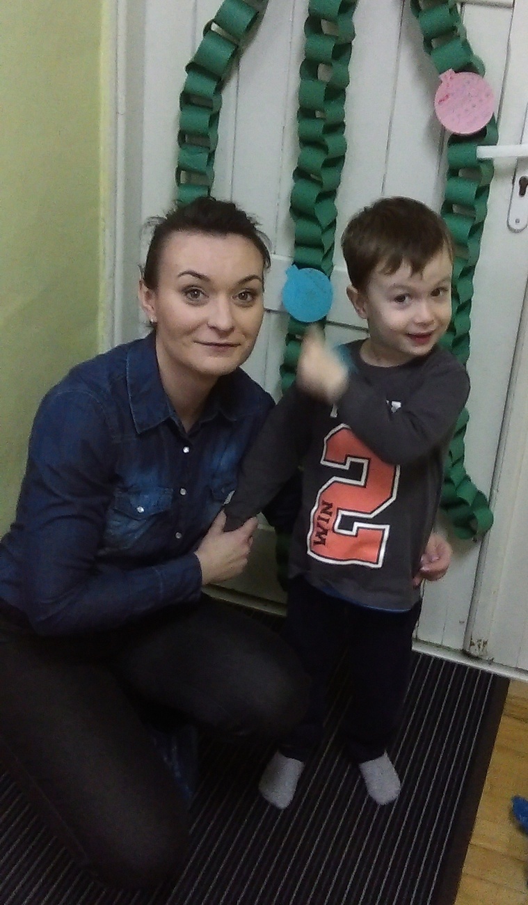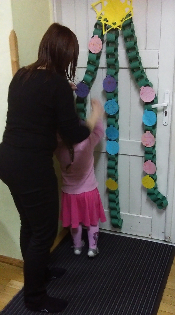 W dniu 11.12.2015 w naszej grupie odbyły się warsztaty świąteczne. Na samym początku podzieliśmy się na mniejsze grupy i każda miała za zadanie zrobienia łańcucha papierowego /całego zielonego/. Następnie te zielone łańcuchy przykleiliśmy do drzwi i tak powstała nam wielka choinka, bardzo ładna. Jednak czegoś jej brakowało, więc na zakończenie zajęć wykonaliśmy wspólnie z rodzicami kolorowe ozdoby, na których rodzice napisali nasze imiona. Tak ozdobiona choinka bardzo nam się spodobała, postanowiliśmy, że zostanie razem z nami w sali do nowego roku.