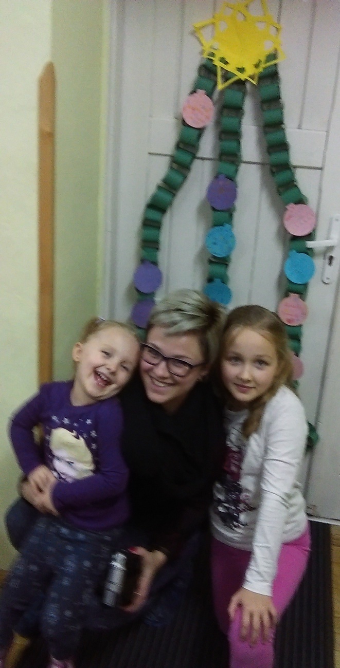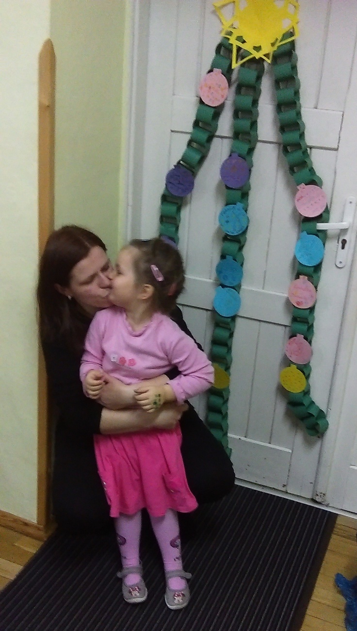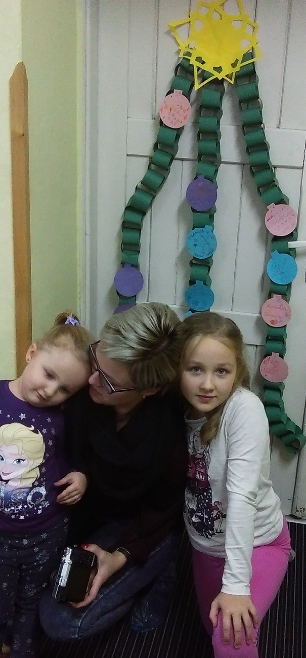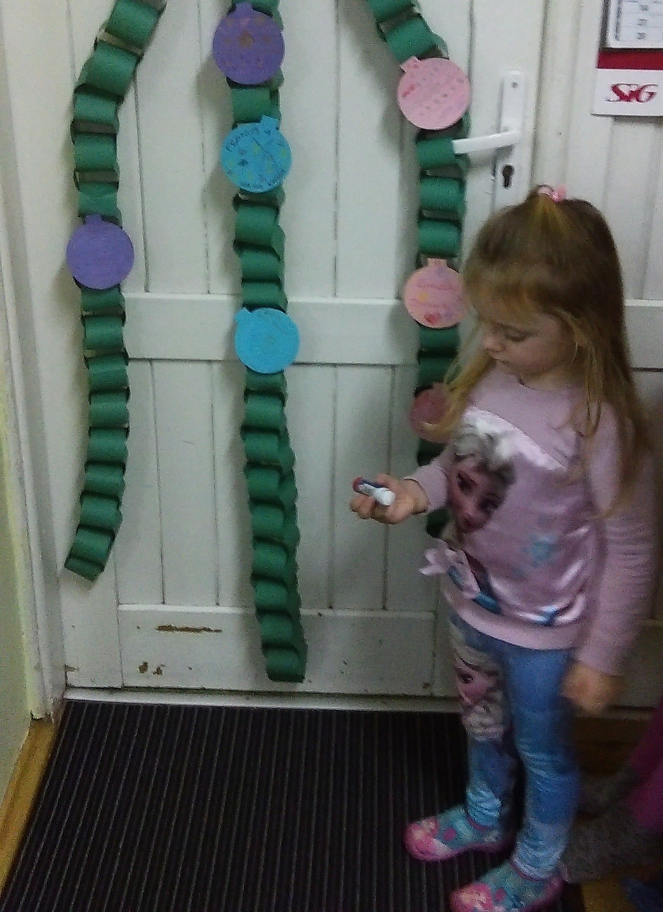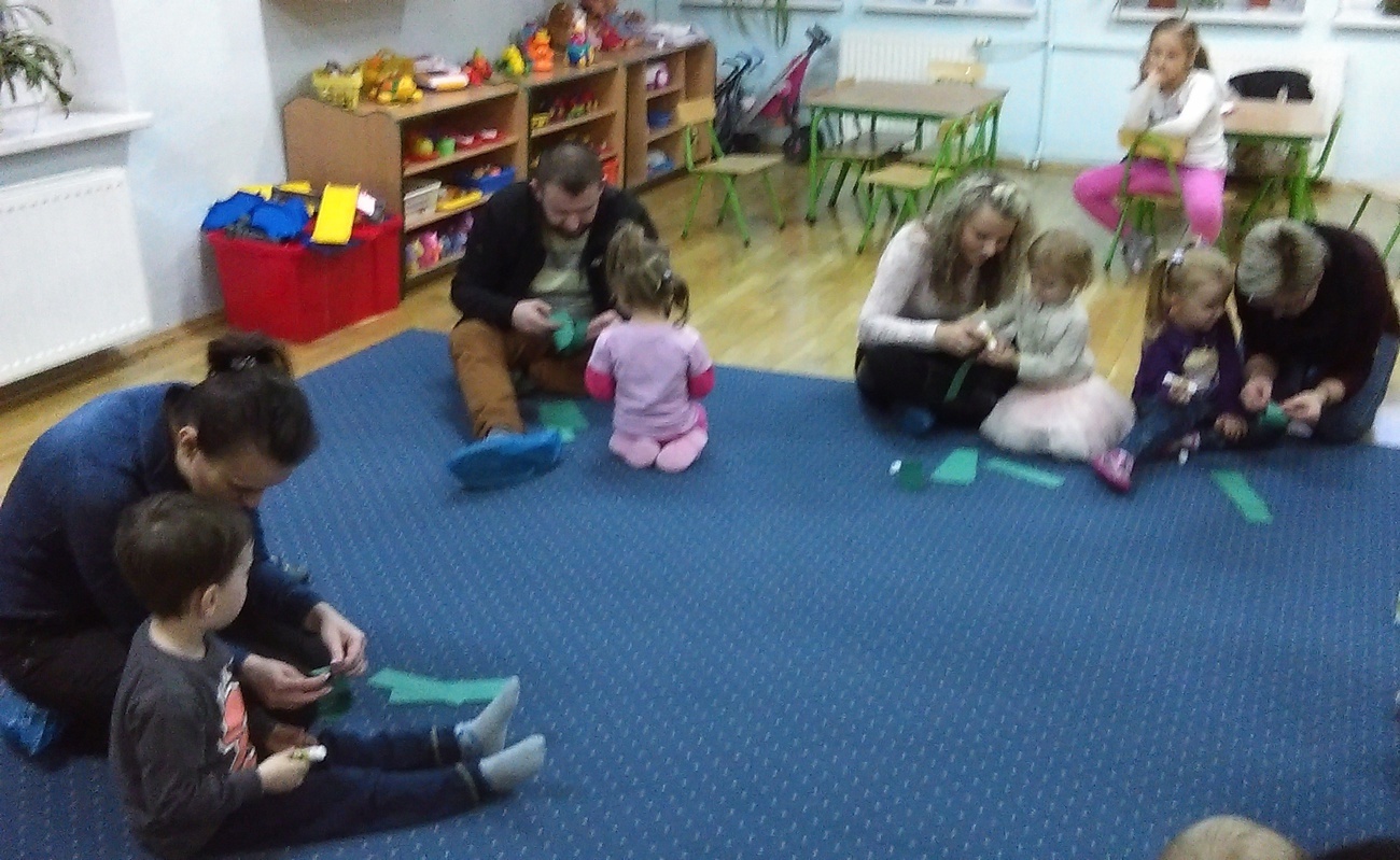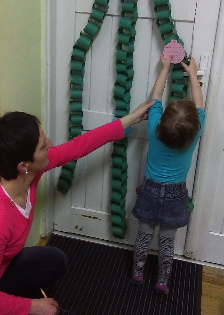 W dniu 11.12.2015 w naszej grupie odbyły się warsztaty świąteczne. Na samym początku podzieliśmy się na mniejsze grupy i każda miała za zadanie zrobienia łańcucha papierowego /całego zielonego/. Następnie te zielone łańcuchy przykleiliśmy do drzwi i tak powstała nam wielka choinka, bardzo ładna. Jednak czegoś jej brakowało, więc na zakończenie zajęć wykonaliśmy wspólnie z rodzicami kolorowe ozdoby, na których rodzice napisali nasze imiona. Tak ozdobiona choinka bardzo nam się spodobała, postanowiliśmy, że zostanie razem z nami w sali do nowego roku.