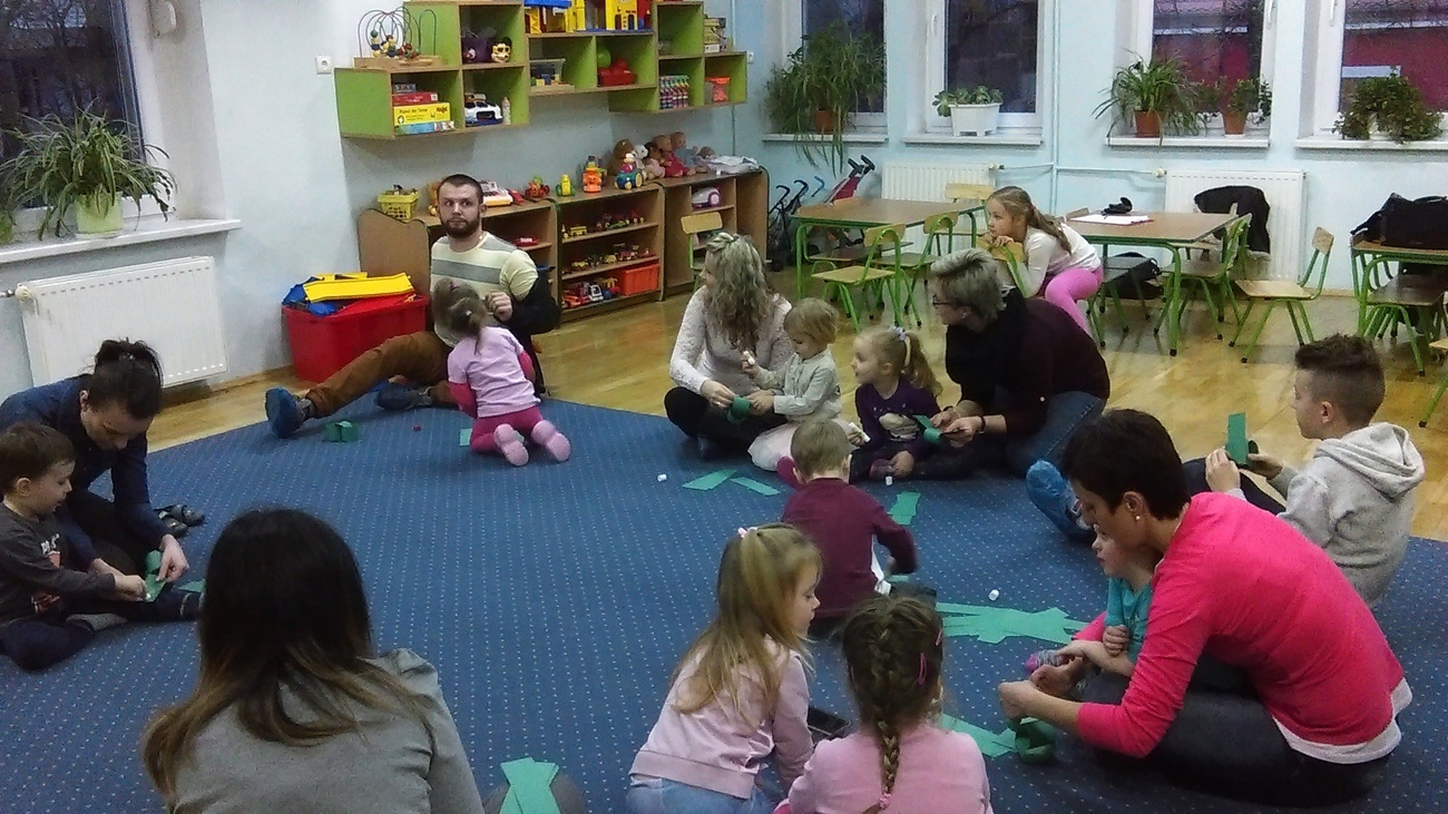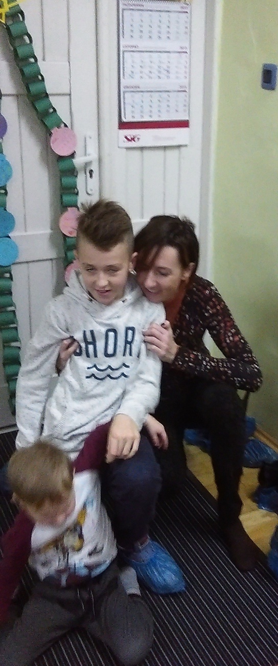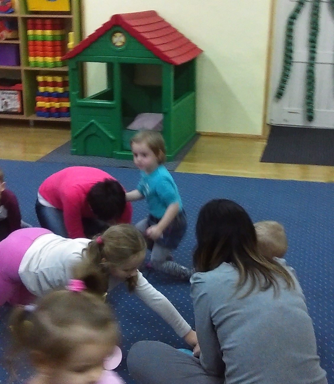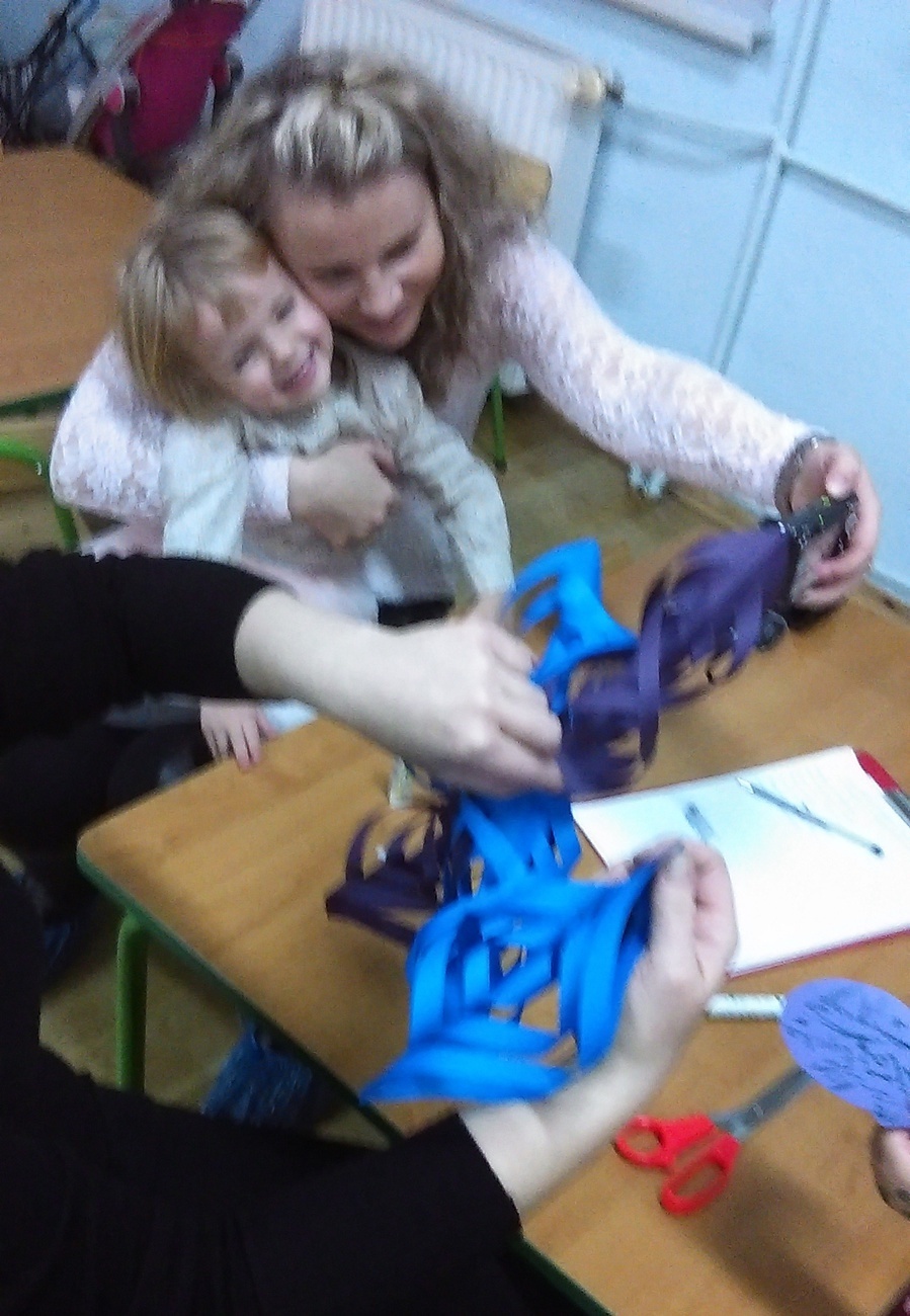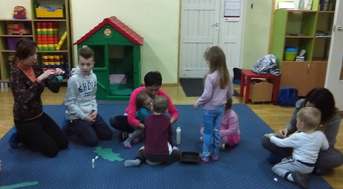 W dniu 11.12.2015 w naszej grupie odbyły się warsztaty świąteczne. Na samym początku podzieliśmy się na mniejsze grupy i każda miała za zadanie zrobienia łańcucha papierowego /całego zielonego/. Następnie te zielone łańcuchy przykleiliśmy do drzwi i tak powstała nam wielka choinka, bardzo ładna. Jednak czegoś jej brakowało, więc na zakończenie zajęć wykonaliśmy wspólnie z rodzicami kolorowe ozdoby, na których rodzice napisali nasze imiona. Tak ozdobiona choinka bardzo nam się spodobała, postanowiliśmy, że zostanie razem z nami w sali do nowego roku.