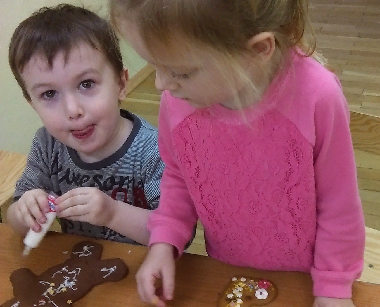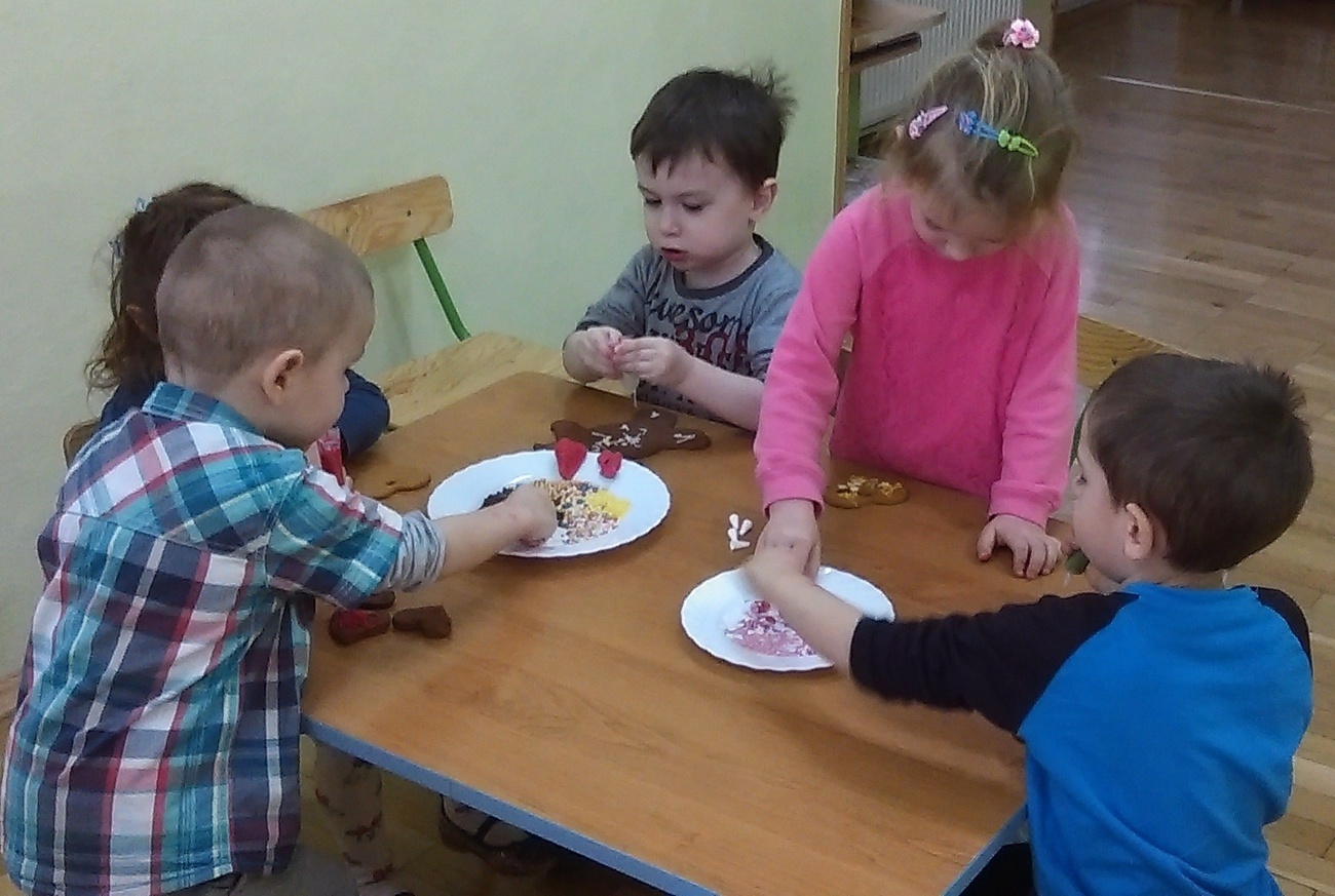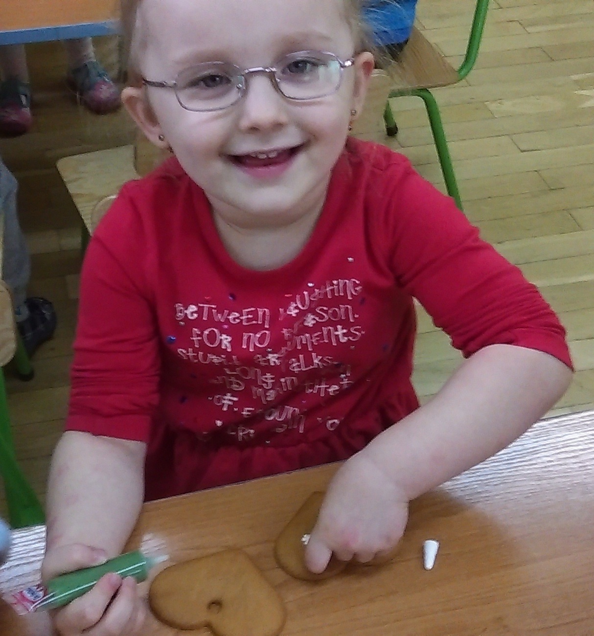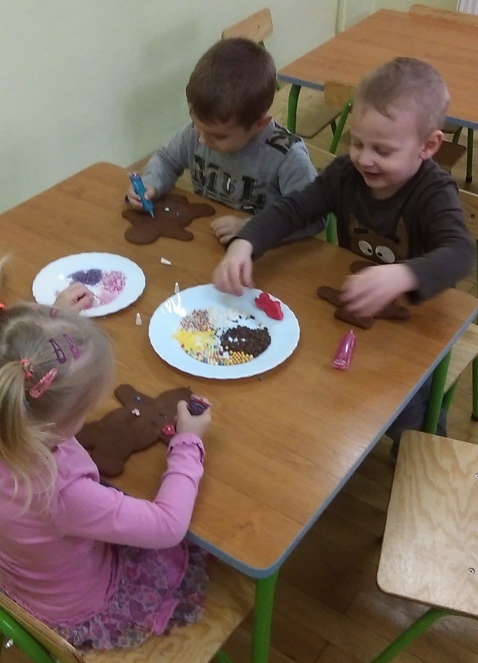 Kolejnym etapem było ozdobienie naszych pierniczków kolorowymi koralikami, gwiazdkami, śnieżynkami, kolorowym lukrem i czekoladą. Oczywiście musieliśmy sprawdzić, czy przyniesione przez nas dekoracje smakowały tak dobrze jak wyglądały.