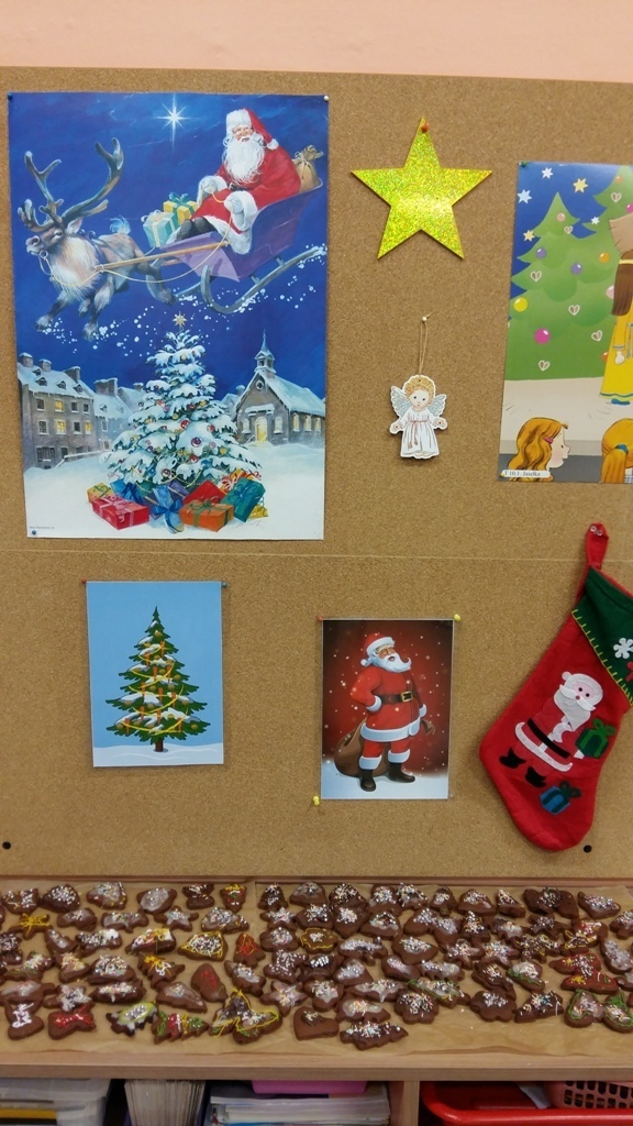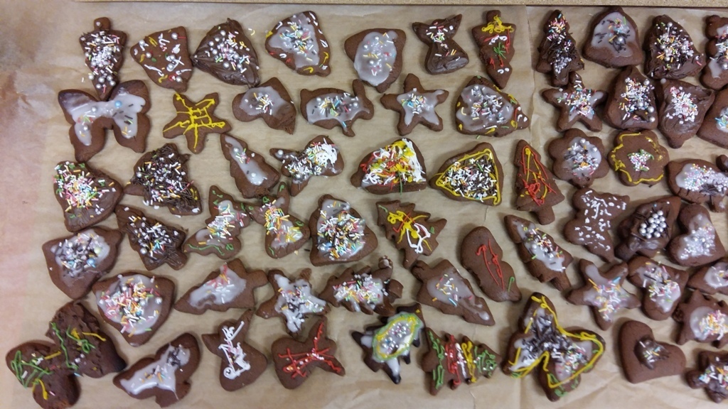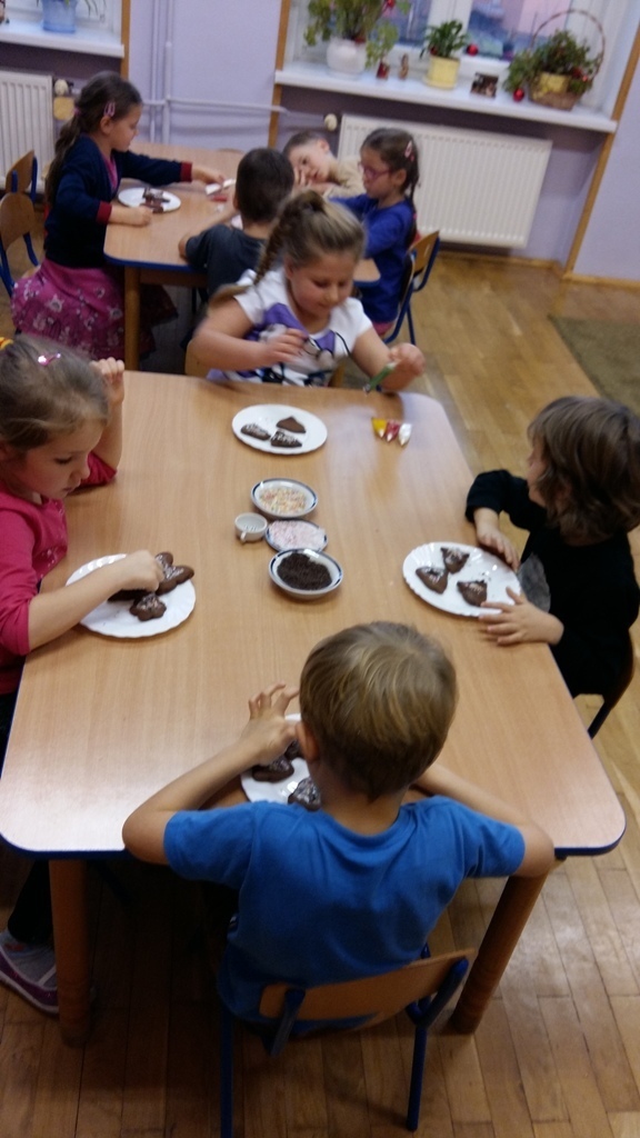 Zabraliśmy się więc do pracy - wałkowania ciasta na pierniczki. „Wyprodukowaliśmy” całe mnóstwo pierniczkowych ciasteczek o przeróżnych kształtach. Były dzwoneczki, choinki, aniołki i wiele innych. Kiedy pierniczki wystygły i zmiękły zabraliśmy się do zdobienia przeróżnymi kolorowymi cukierkami i cukrowymi posypkami. Ech jakie piękne te nasze pierniczki! A jakie smakowite, mniam...