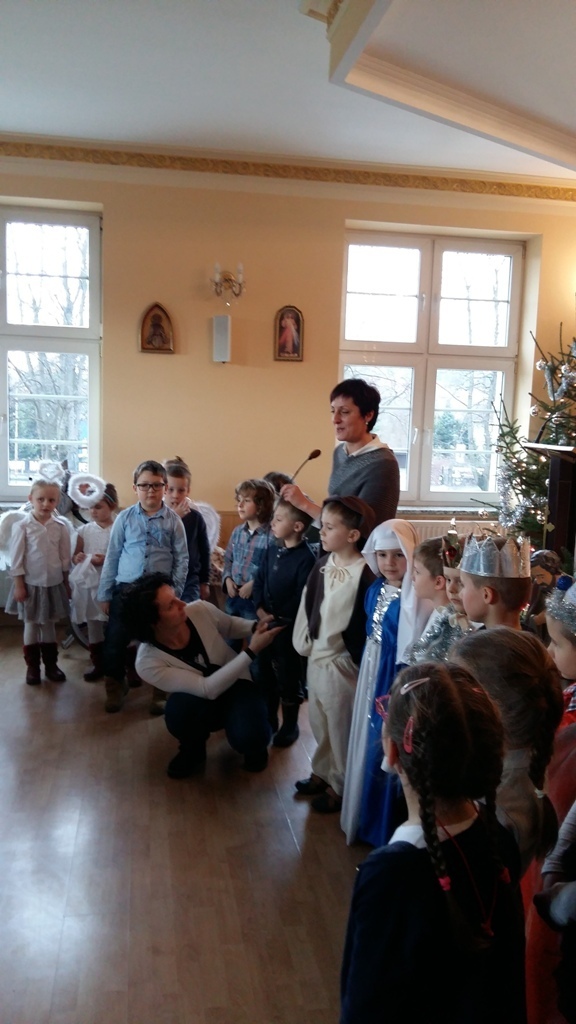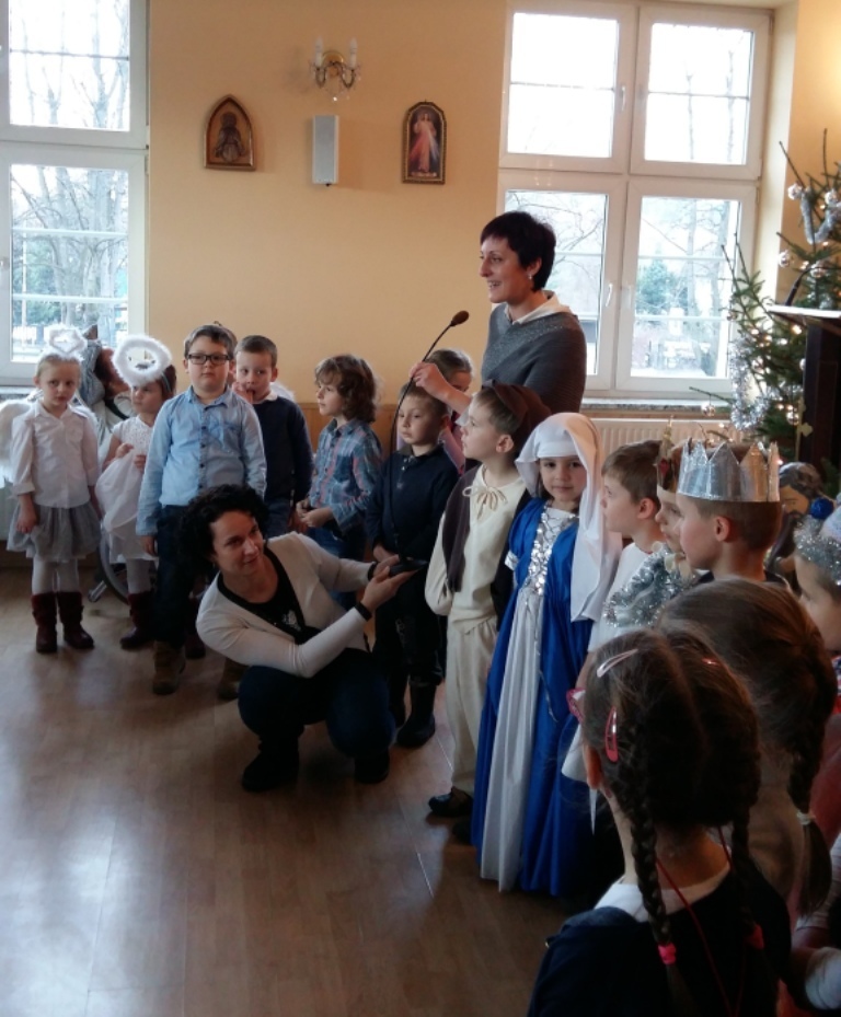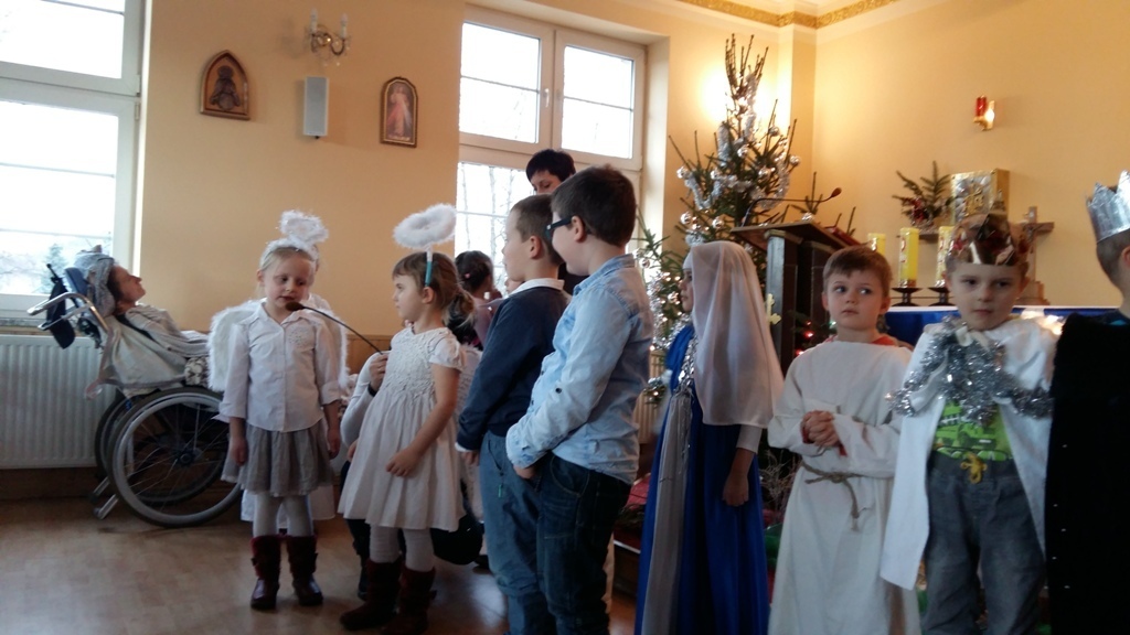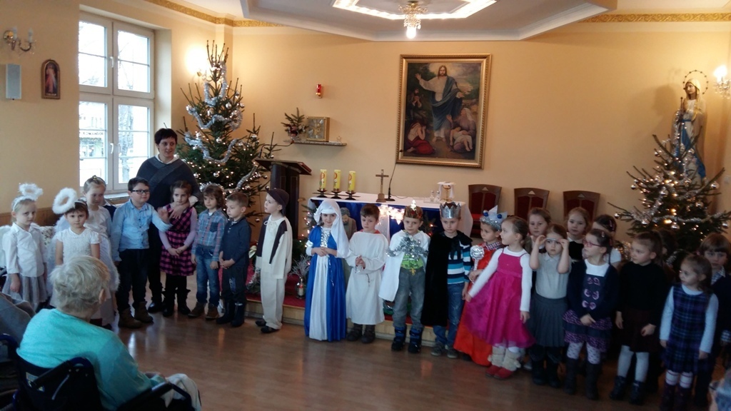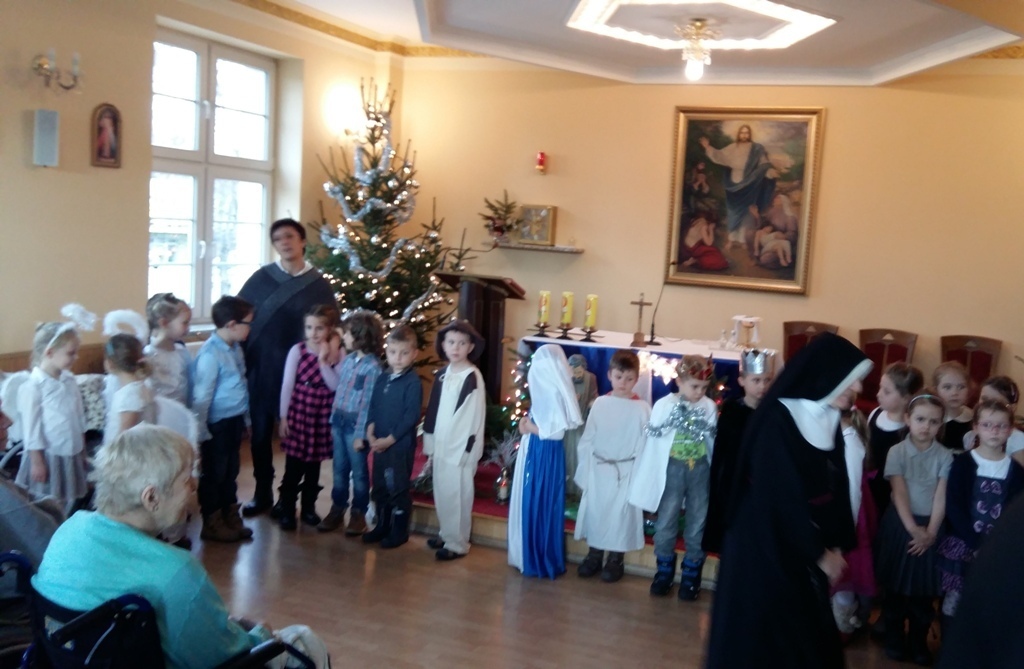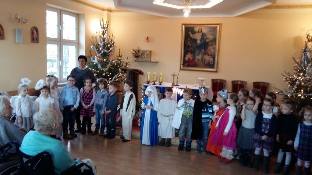 Dziś postanowiliśmy zrobić niespodziankę osobom chorym mieszkającym w Zakładzie Opiekuńczo-Leczniczym przy ul. Żeromskiego. Zabraliśmy stroje jasełkowe i poszliśmy zaprezentować nasze bardzo długo przygotowywane przedstawienie. Pięknie przebrani z uroczystą miną i lekko zdenerwowani stanęliśmy przed licznie zgromadzoną publicznością.Gdy zaczęliśmy śpiewać kolędy i recytować role, niektórym słuchaczom zakręciła się łezka w oku. Po zakończeniu występu otrzymaliśmy gromkie brawa.