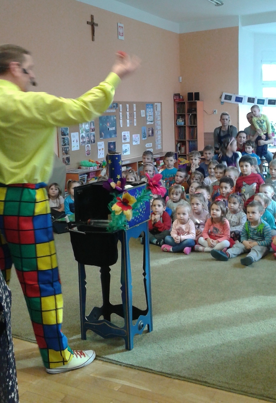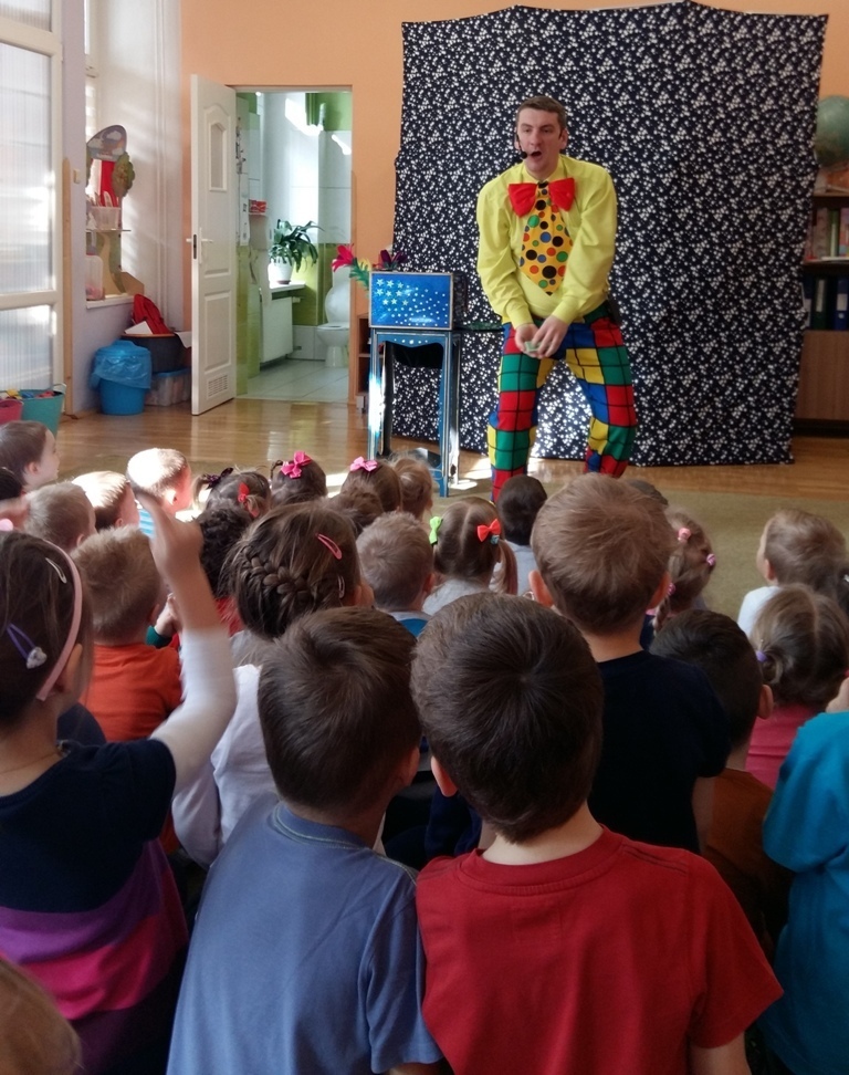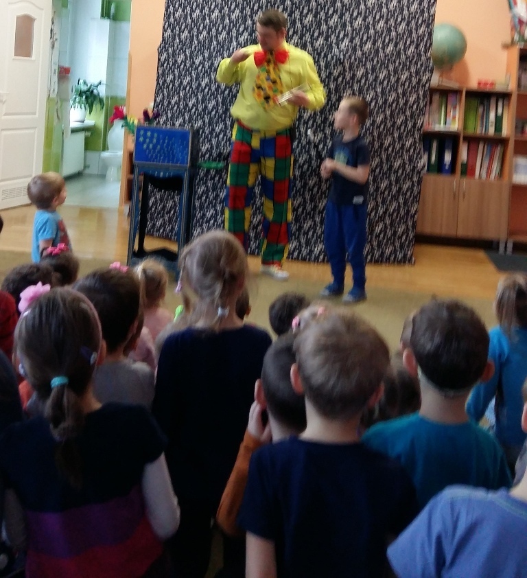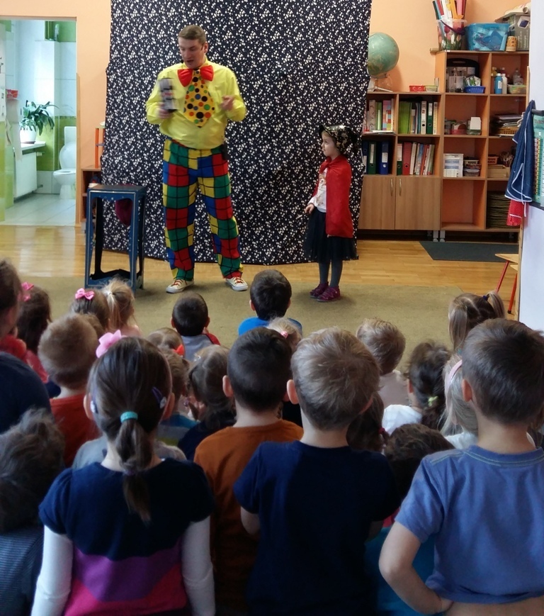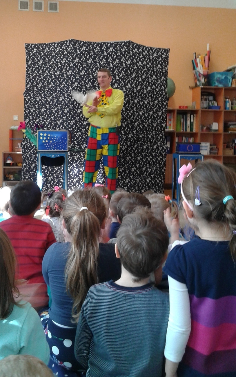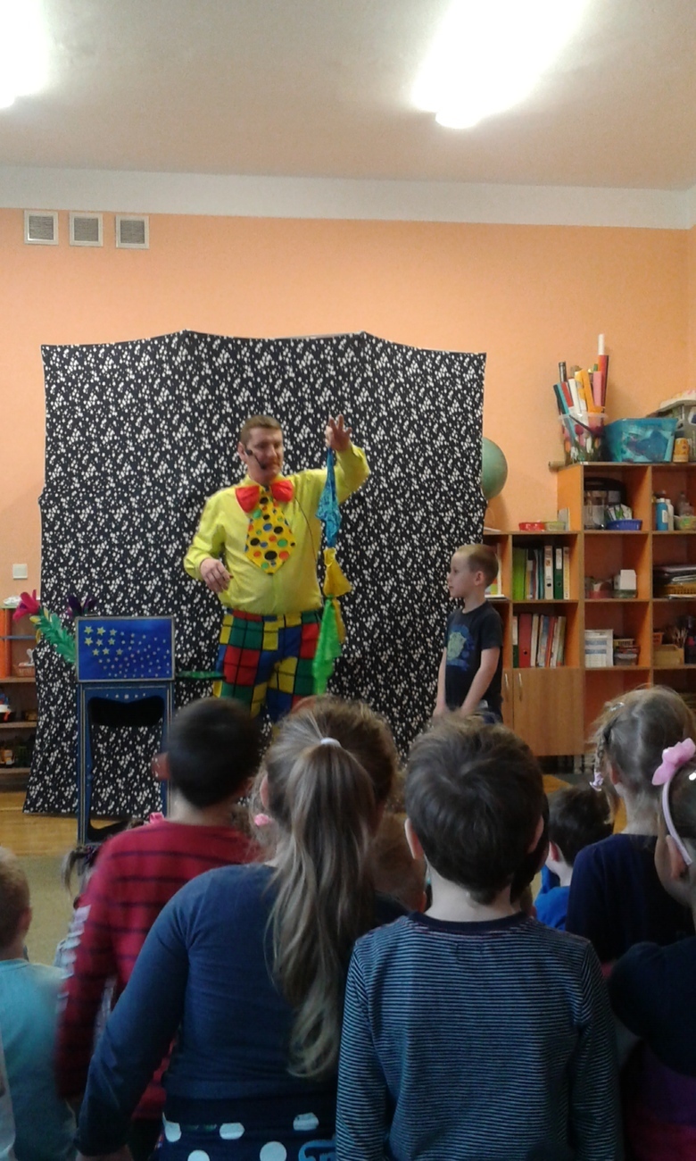 Dziś odwiedził nas nietypowy gość. Okazało się, że jest magikiem. Najpierw naszym oczom ukazał się gołąb Tomek, potem wyczarował nam kwiaty i kolorowe chustki.