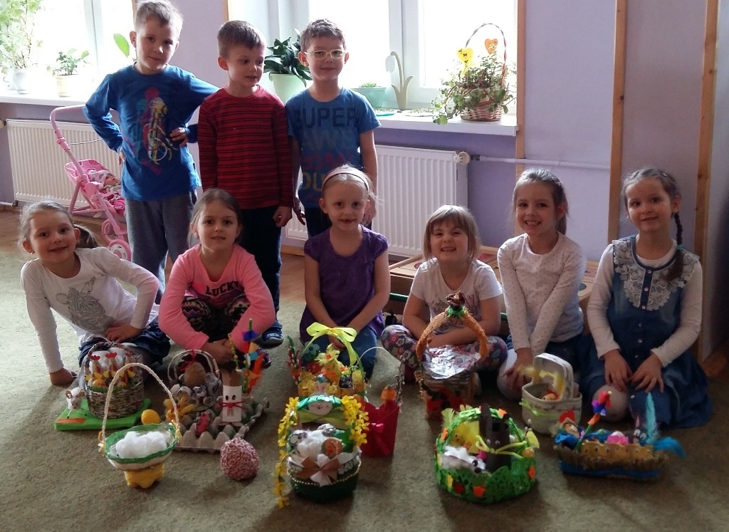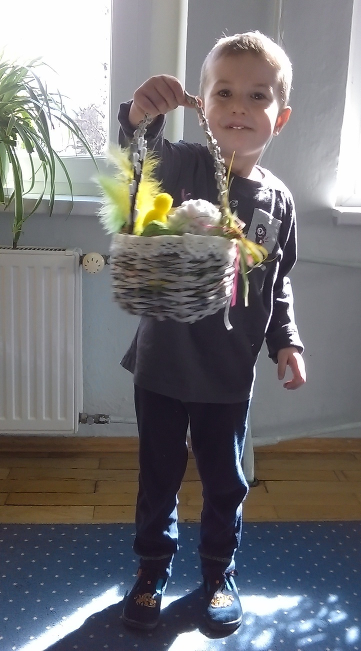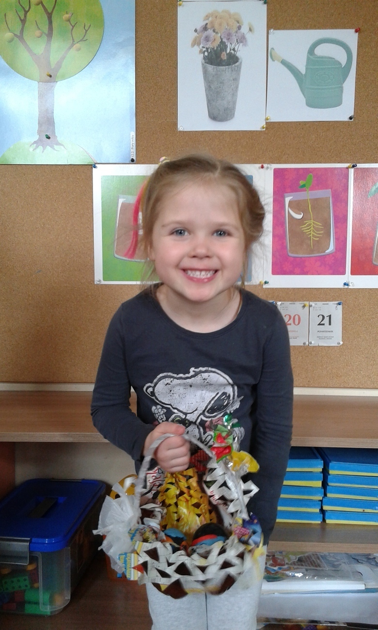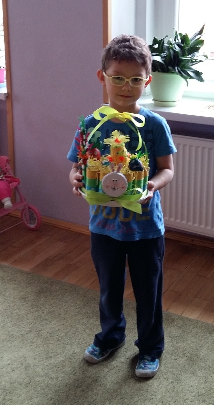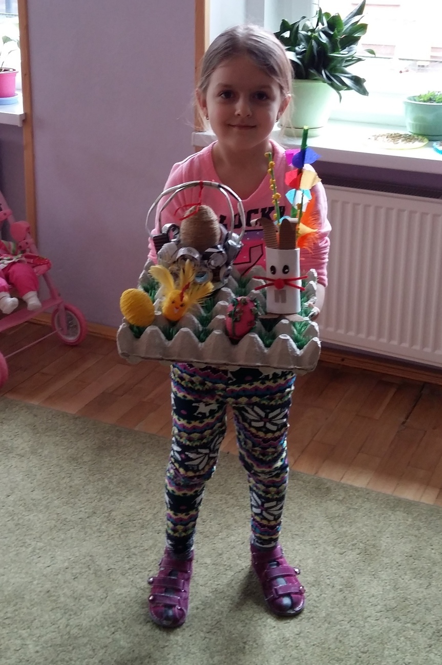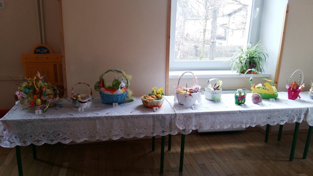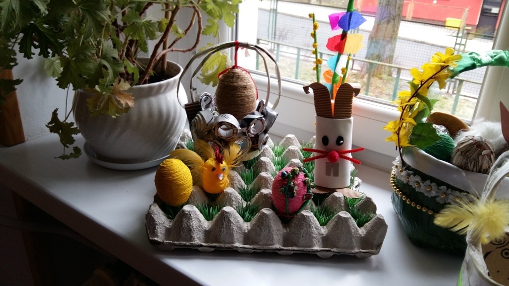 Dnia 22.03.2016r. zakończył się kolejny przedszkolny już V, Konkurs Wielkanocny pt. „Recyklingowy koszyczek wielkanocny". Dzieci w raz z rodzicami tak jak co roku prześcigają się w wymyślaniu najwspanialszych ozdób świątecznych. Ten rok obfitował w przeróżne pomysły powtórnego wykorzystania przedmiotów, które mogliśmy znaleźć w domu. Tak więc mogliśmy zobaczyć koszyczki wykonane z kolorowych gazet, plastikowych kubeczków oraz butelek po wodzie mineralnej. Niekonwencjonalnymi pomysłami było również wykonanie koszyczka z abażuru po starej lampie, tudzież styropianu potrzebnego do bezpiecznego transportu komputera. Dzieci wykazały się ogromną wyobraźnią tworząc pisanki, które wyczarowywane były z różnych produktów m.in. jajek niespodzianek oraz wielkanocnego baranka i zająca z rolek po papierze toaletowym. Wszystkie Tuptusie długo opowiadały historie powstawania wszystkich koszyczków i daję słowo każdy był oszałamiająco piękny. Wszyscy z niecierpliwością nie możemy się już doczekać następnego konkursu.