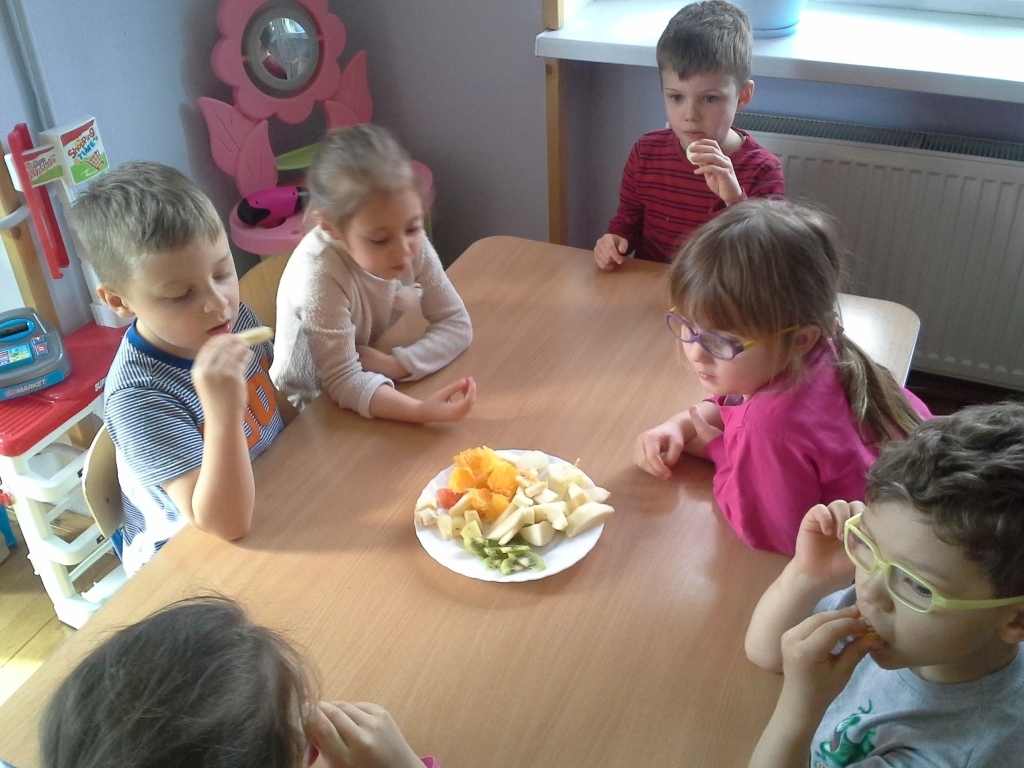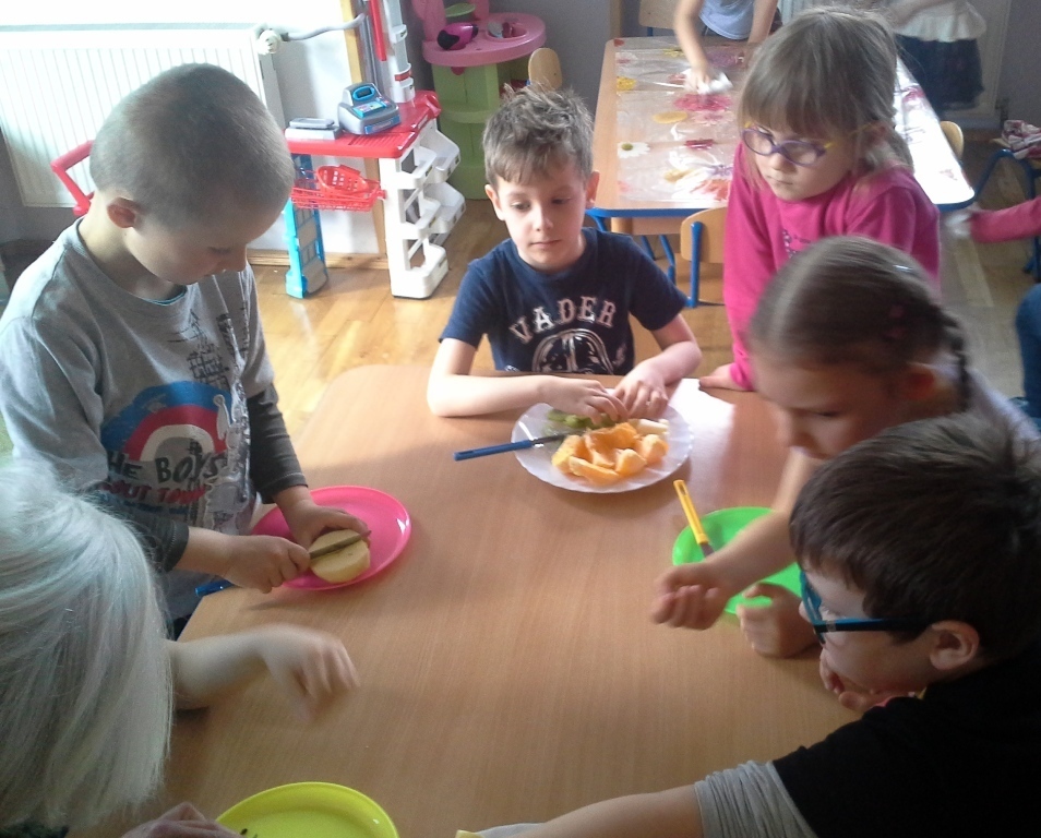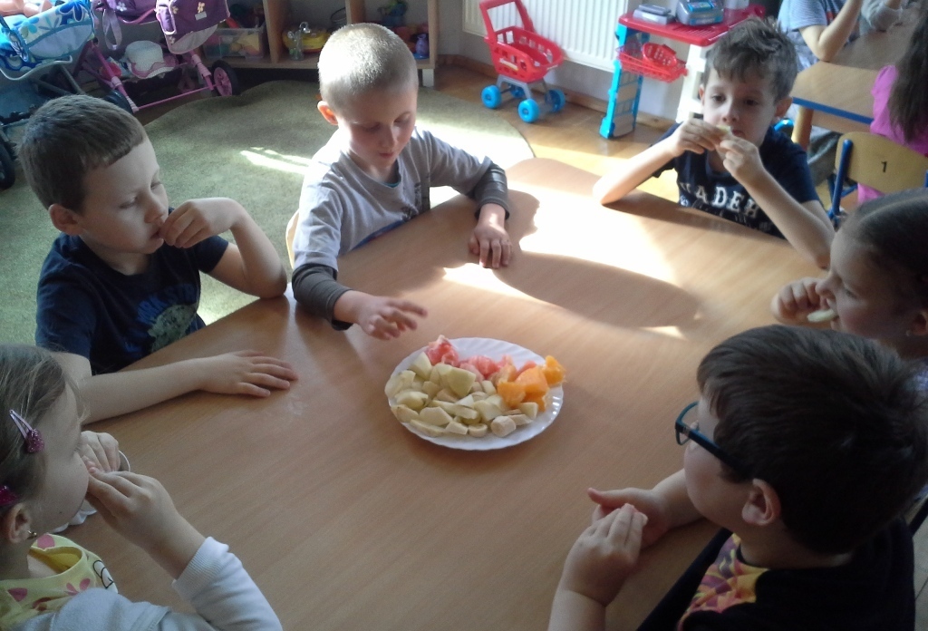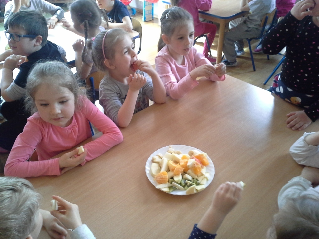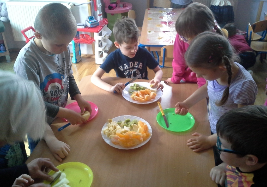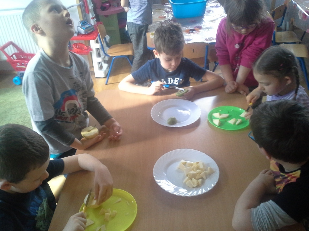 Dziś jest Światowy Dzień Zdrowia. Postanowiliśmy dowiedzieć się i ustalić, czym jest zdrowie oraz co należny robić, aby być zdrowym. Okazało się, że cała grupa doskonale wie, jak dbać o siebie, żeby być zdrowym i dobrze się czuć. Ustaliliśmy, że człowiek potrzebuje jeść owoce i warzywa, pić dużo wody, uprawiać sport, oraz musi czuć się kochany.To wszystko sprawi, że będziemy zdrowi. Nasze dbanie o zdrowie zaczęliśmy dziś od umycia, obrania i pokrojenia owoców, po czym zjedliśmy je ze smakiem. Następnie pobiegliśmy na przedszkolny plac zabaw, bo przecież ruch to zdrowie, a nas długo nie trzeba namawiać.