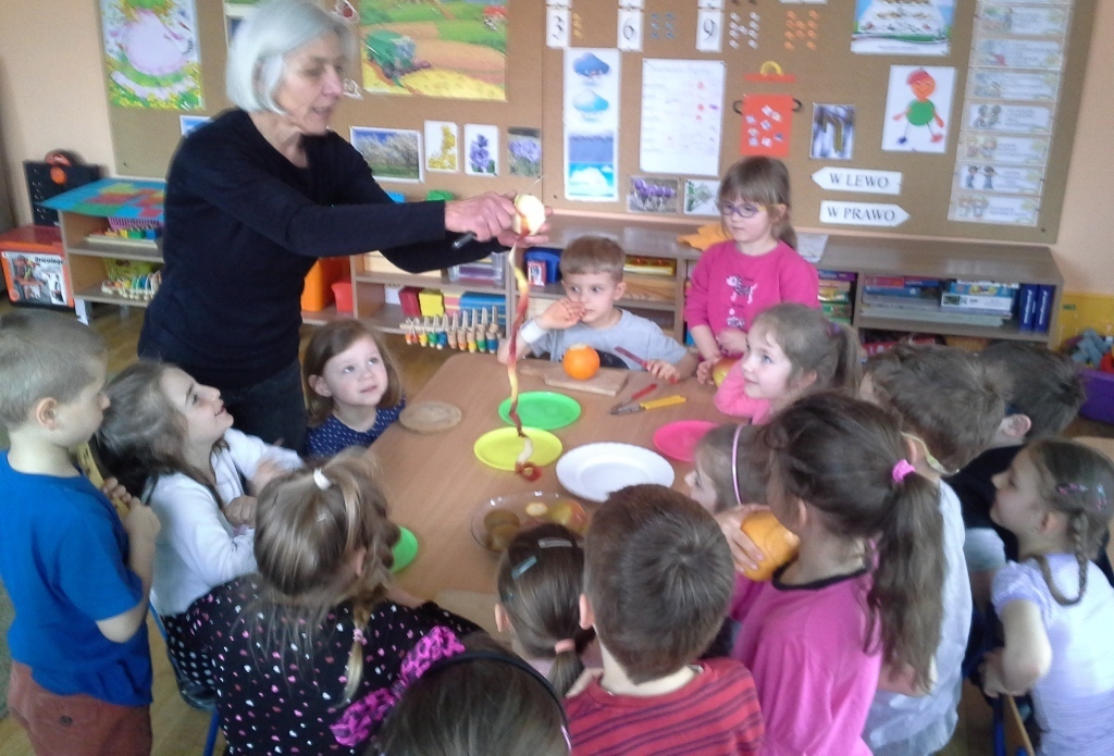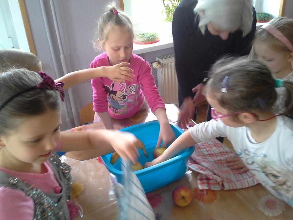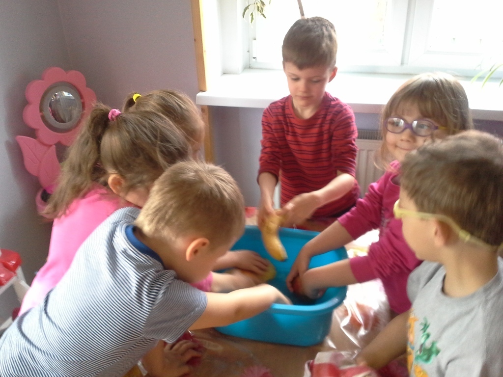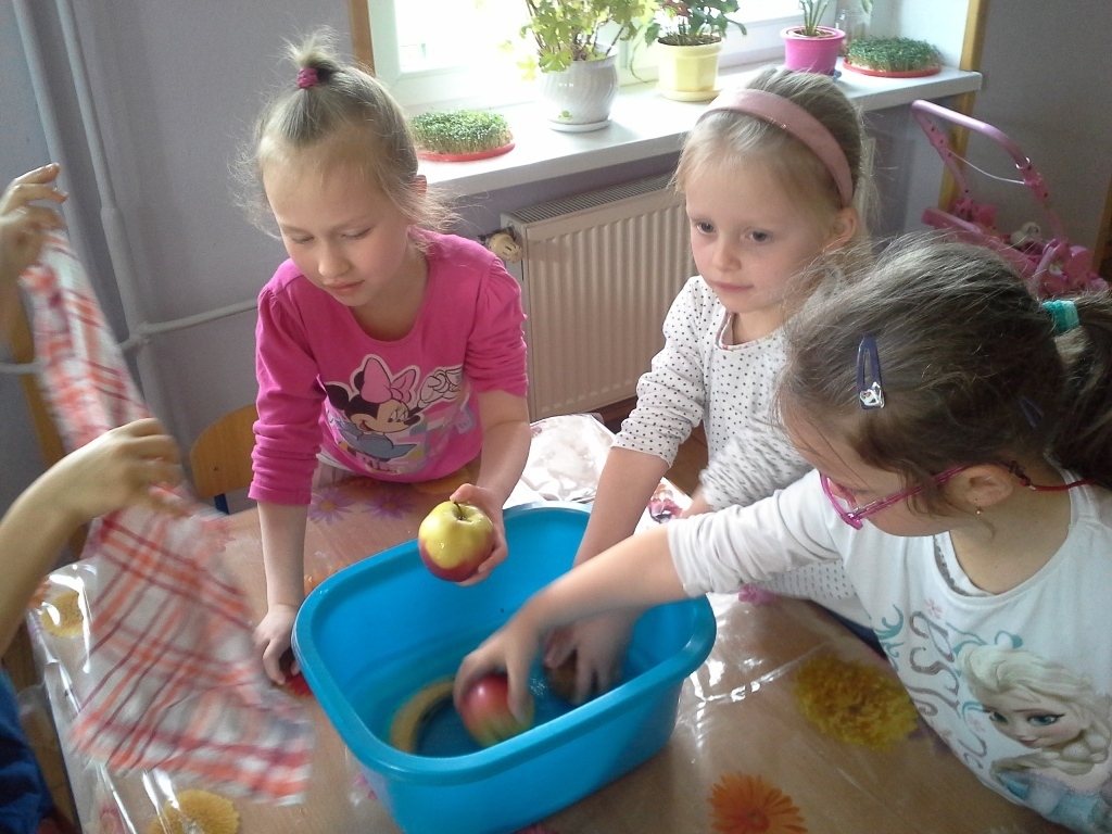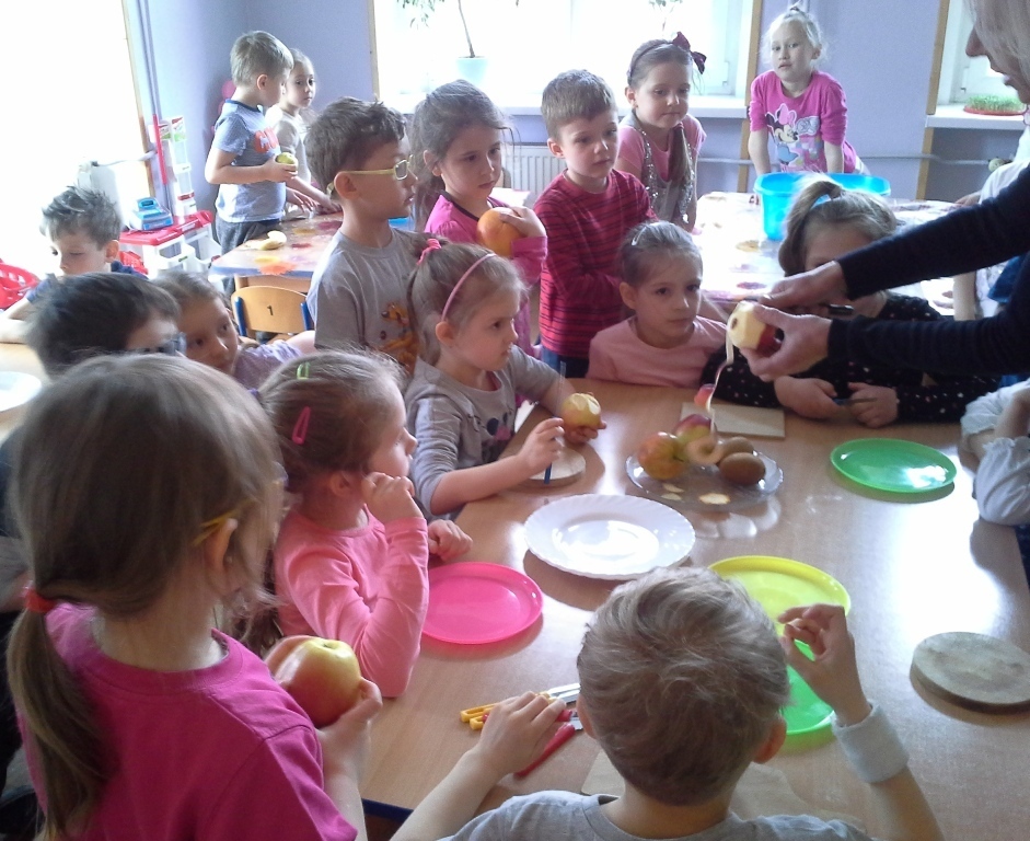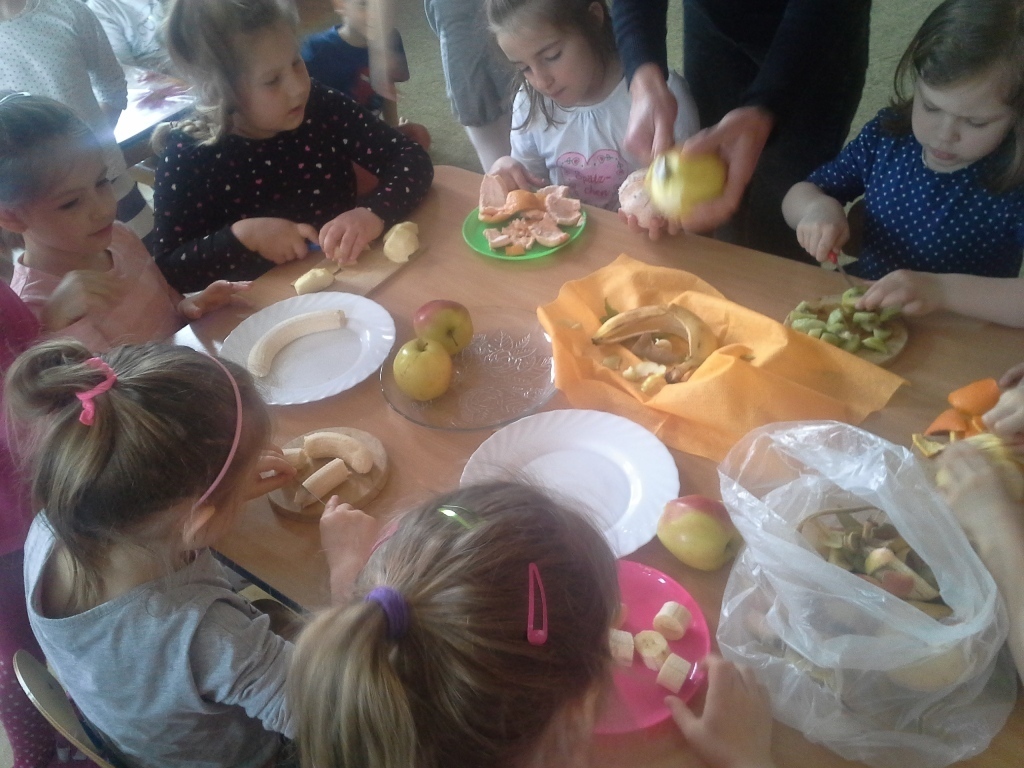Dziś jest Światowy Dzień Zdrowia. Postanowiliśmy dowiedzieć się i ustalić, czym jest zdrowie oraz co należny robić, aby być zdrowym. Okazało się, że cała grupa doskonale wie, jak dbać o siebie, żeby być zdrowym i dobrze się czuć. Ustaliliśmy, że człowiek potrzebuje jeść owoce i warzywa, pić dużo wody, uprawiać sport, oraz musi czuć się kochany.To wszystko sprawi, że będziemy zdrowi. Nasze dbanie o zdrowie zaczęliśmy dziś od umycia, obrania i pokrojenia owoców, po czym zjedliśmy je ze smakiem. Następnie pobiegliśmy na przedszkolny plac zabaw, bo przecież ruch to zdrowie, a nas długo nie trzeba namawiać.