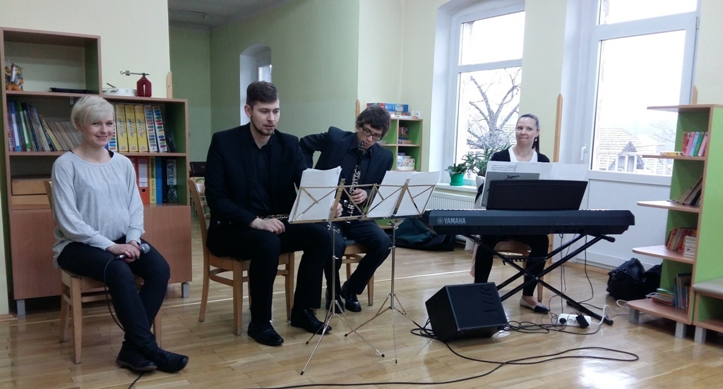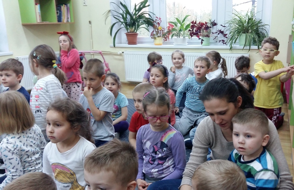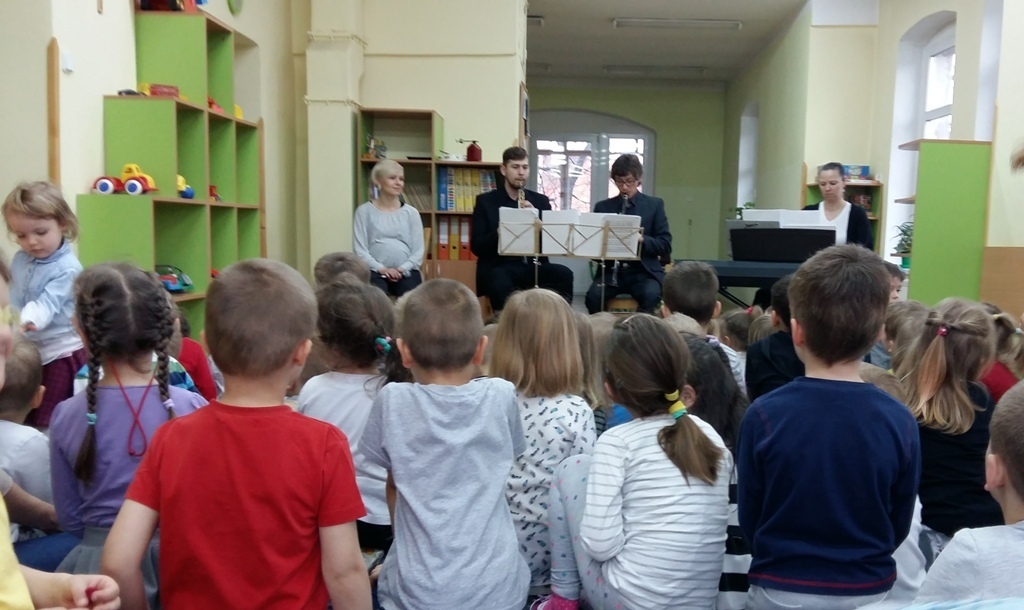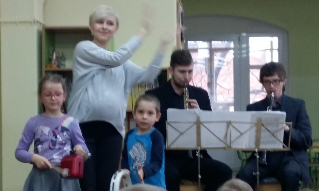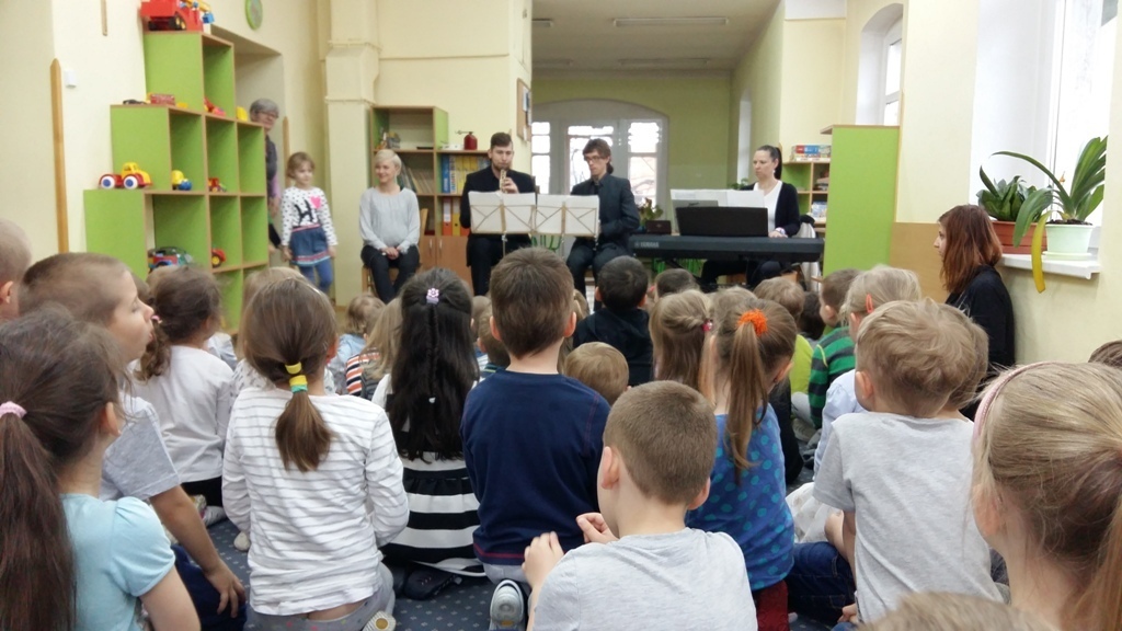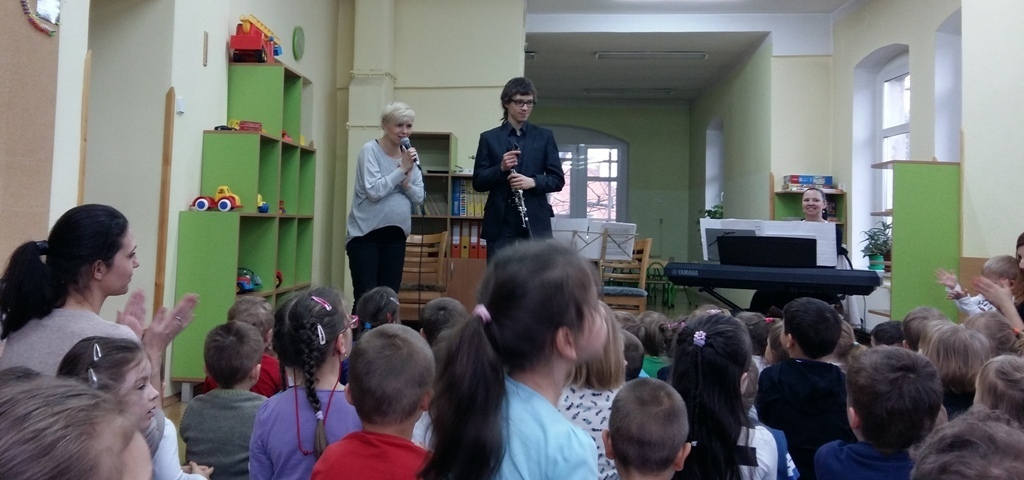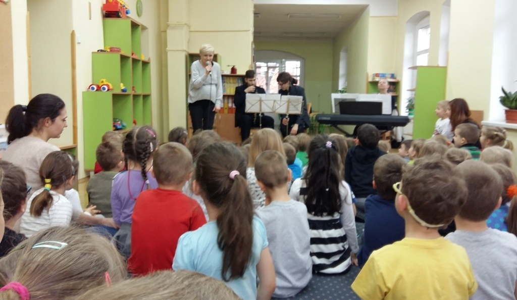 Dnia 14.04.2016 spotkaliśmy się w naszej przedszkolnej „sali koncertowej”, ponieważ przyjechali do nas muzycy z Filharmonii Dolnośląskiej z koncertem pt „Podwórkowa symfonia".