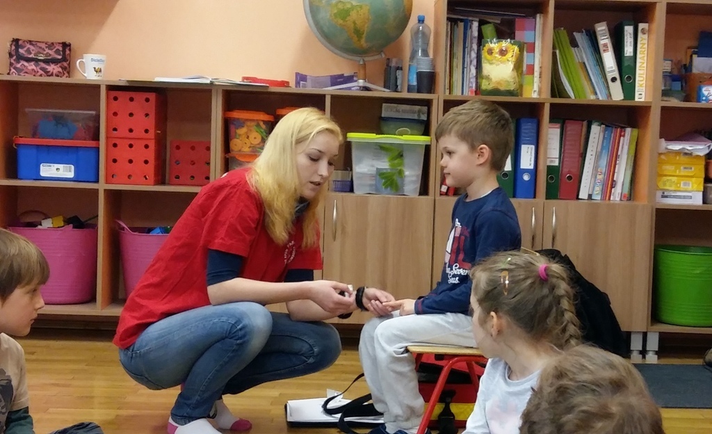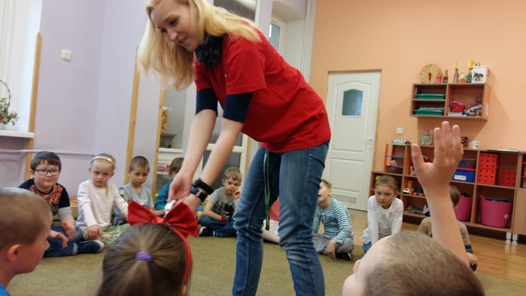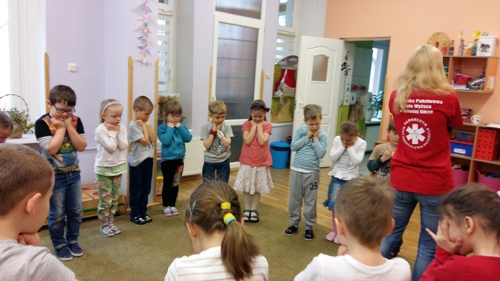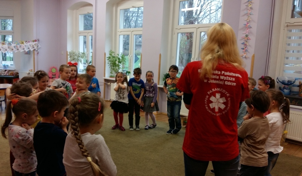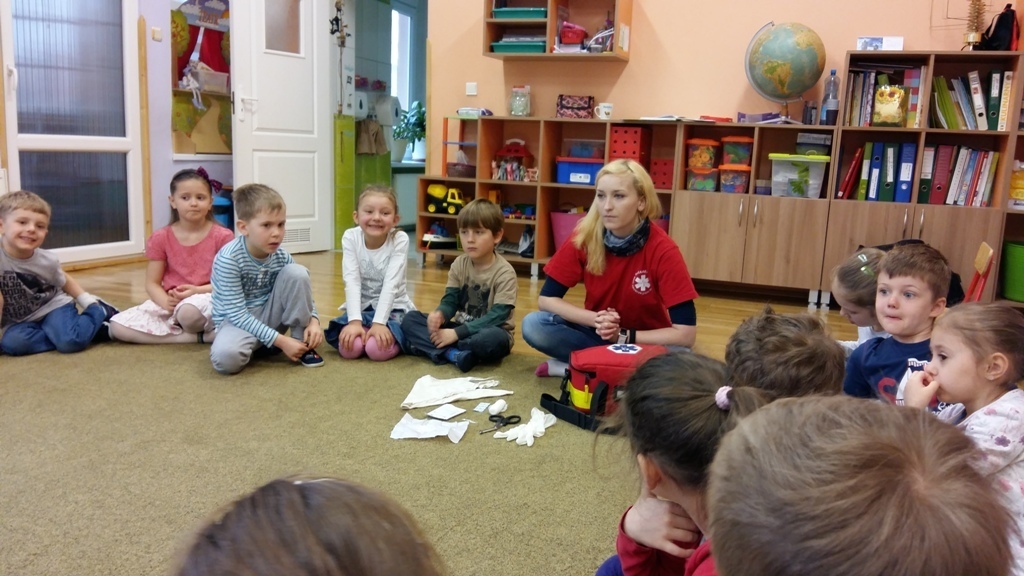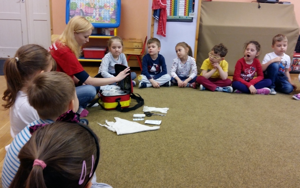 Dnia 14.04.2016 r. grupę III odwiedziła pani Magda studentka ostatniego roku Karkonoskiej Szkoły Wyższej w Jeleniej Górze. Ku uciesze dzieci przyniosła nam najróżniejsze rekwizyty by dzieci mogły zobaczyć co należy przechowywać w każdym domu w apteczce. Były oczywiście kolorowe plasterki i bandaże. Każde z dzieci chciało być wybrane do asystowania pani Magdzie, aby udzielić pierwszej pomocy rannemu koledze. Pod koniec zajęć wszystkie dzieci otrzymały obrazki, gdzie mogły domalować swoje plasterki. Czekamy z utęsknieniem na kolejne odwiedziny.