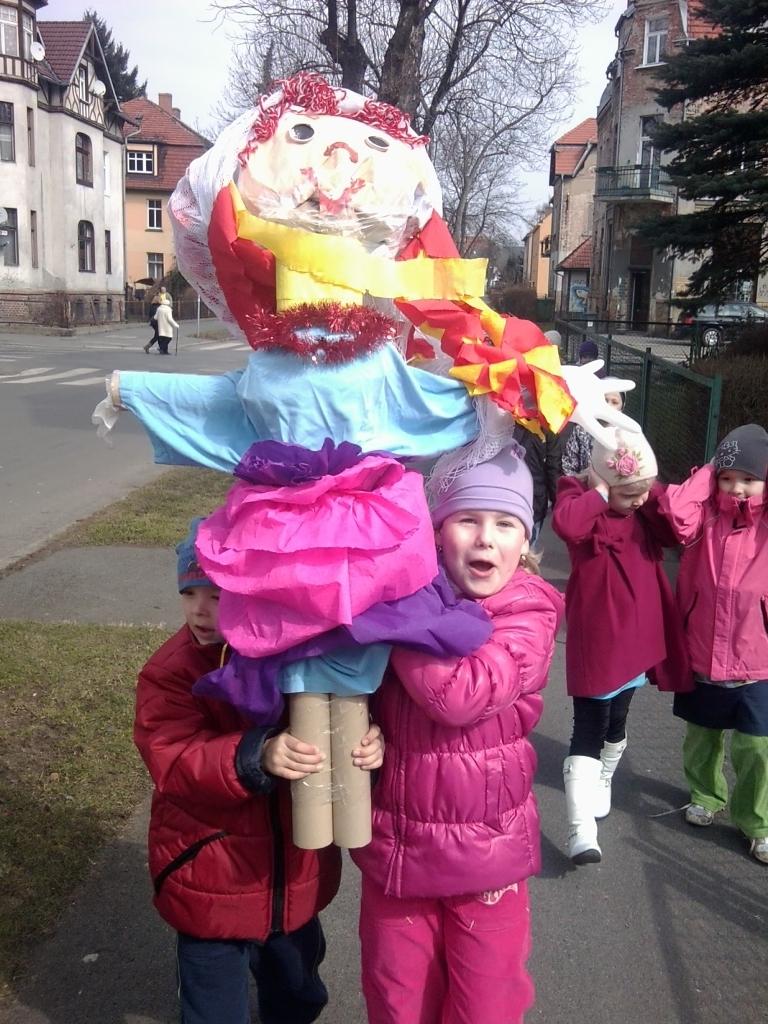 W pierwszym dniu kalendarzowej wiosny, starszaki z grupy V wybrały się na wiosenny pochód. Radośnie śpiewając i głośno grając na instrumentach ogłosiliśmy całemu światu nadejście nowej pory roku. Z samodzielnie zrobioną Marzanną wędrowaliśmy po ulicach w pobliżu naszego przedszkola. W tak wesołych nastrojach dotarliśmy do Zakładu Pielęgnacyjno - Opiekuńczego przy ulicy Żeromskiego, gdzie na dobre pożegnaliśmy Marzannę. W tym miejscu za każdym razem jesteśmy serdecznie witani ,dlatego tak chętnie je odwiedzamy. Odśpiewaliśmy wiosenne piosenki i z obietnicą powrotu z Wielkanocnym występem opuściliśmy zakład i wróciliśmy do przedszkola.