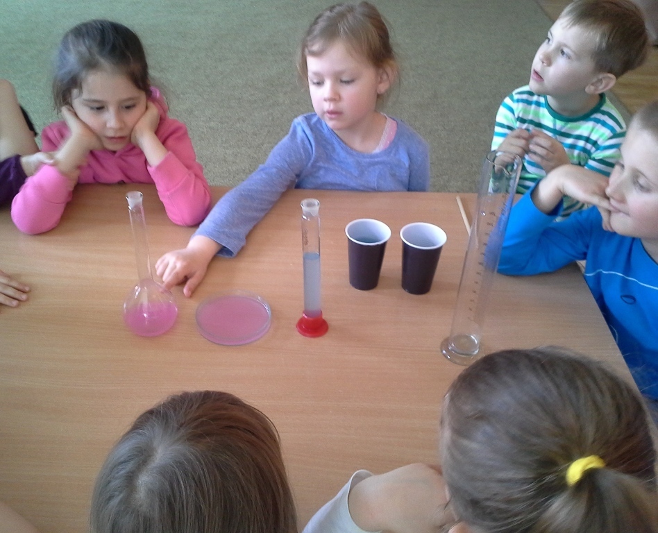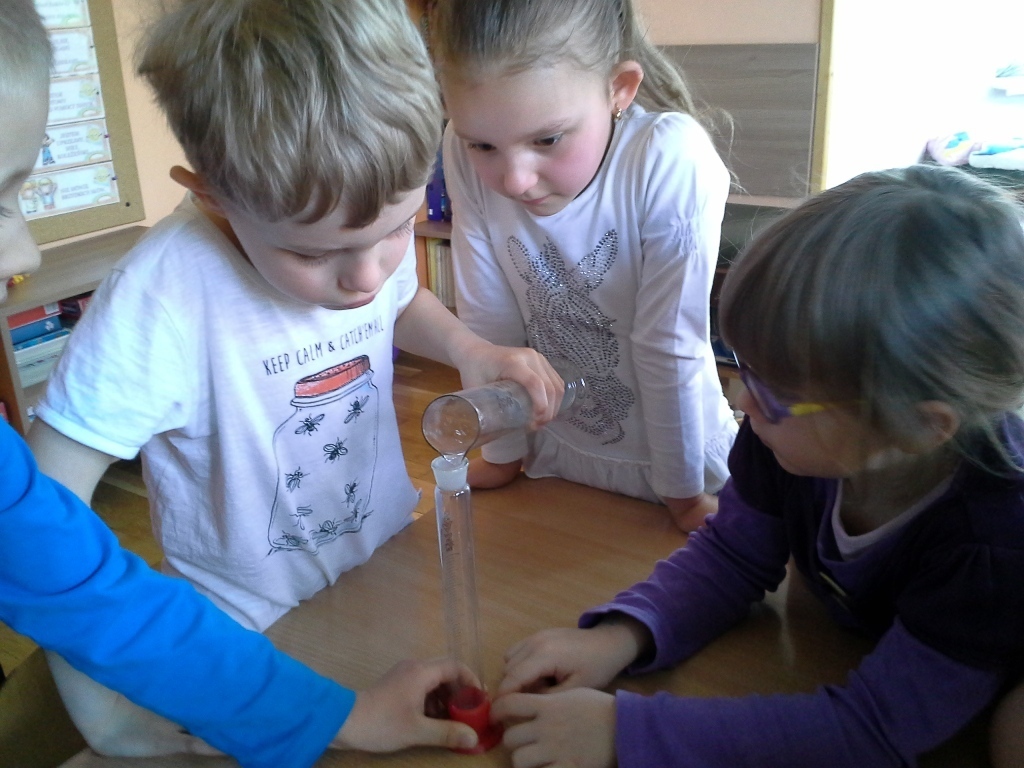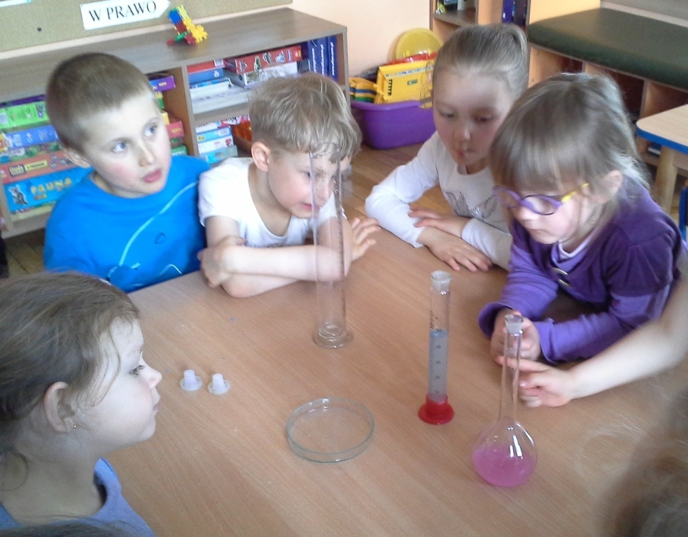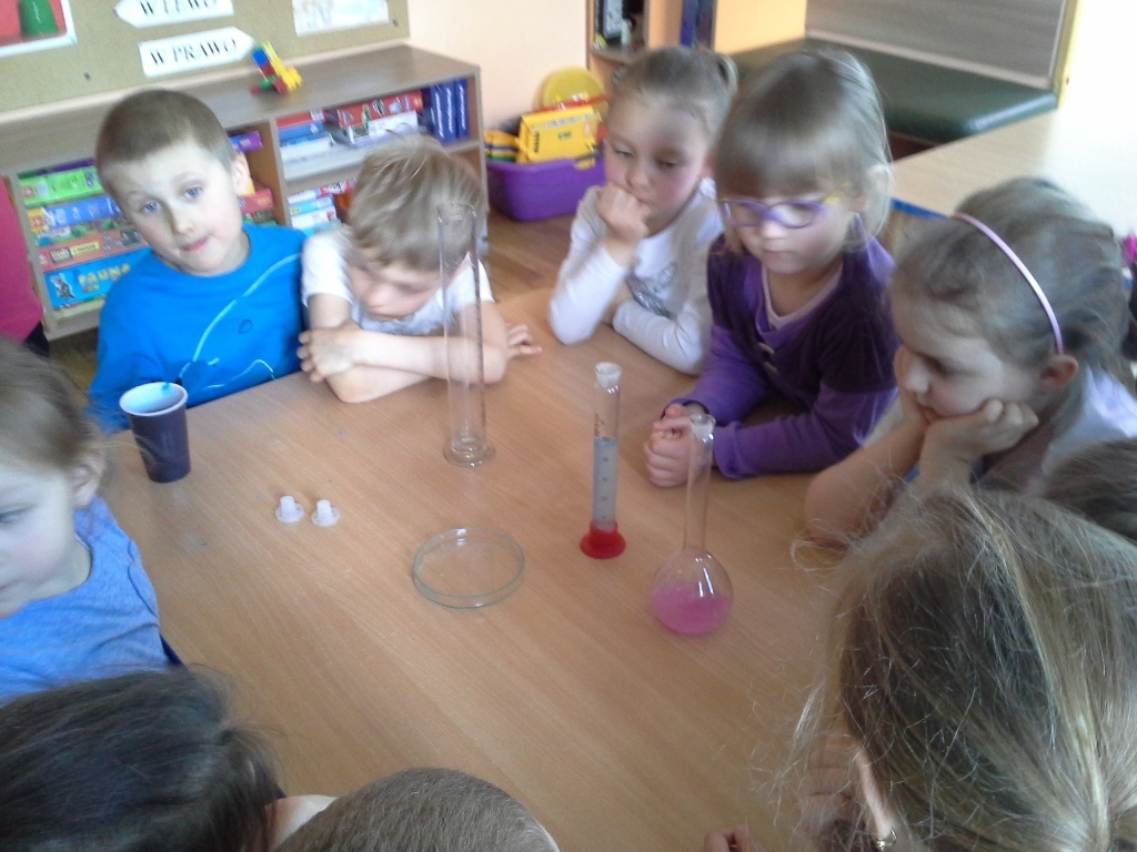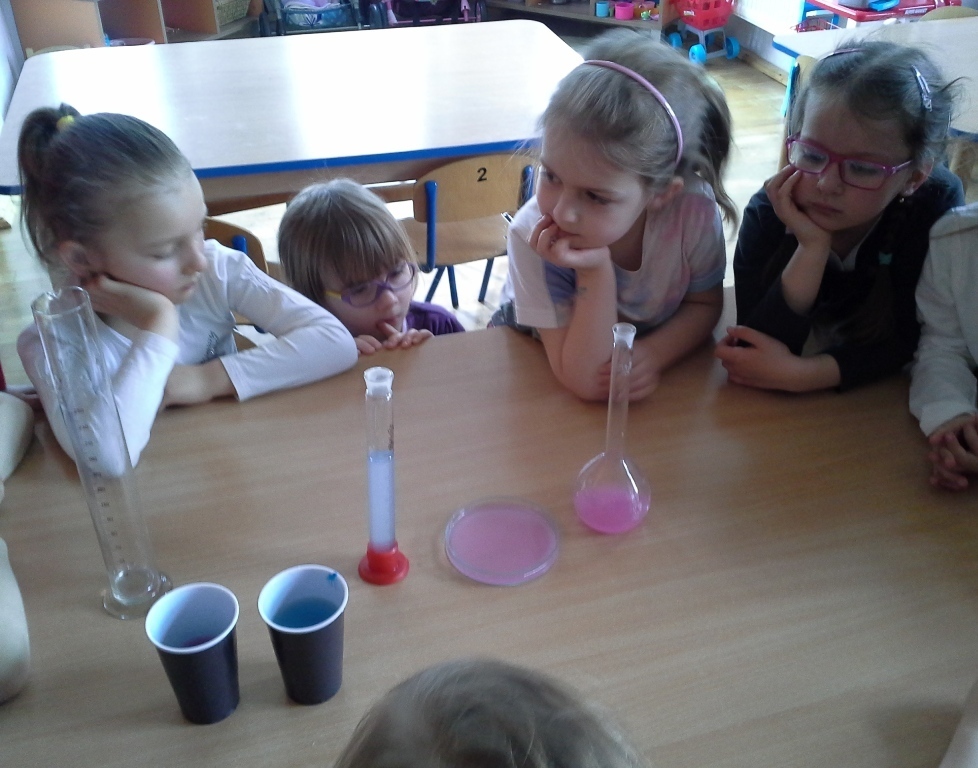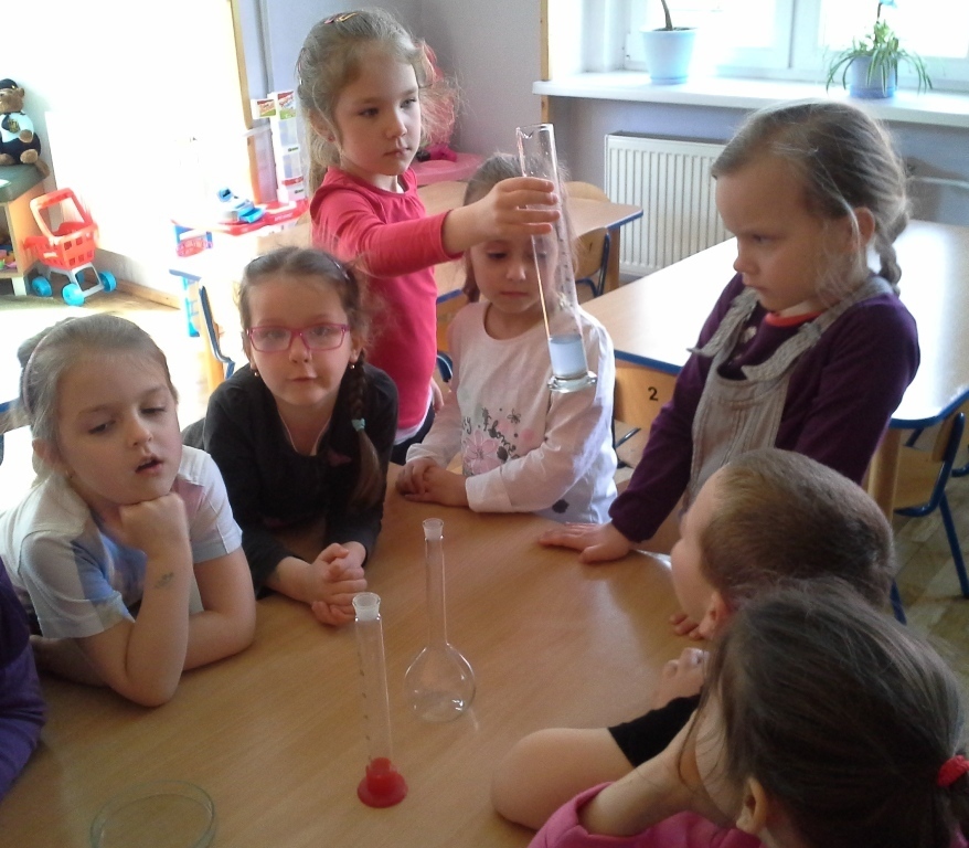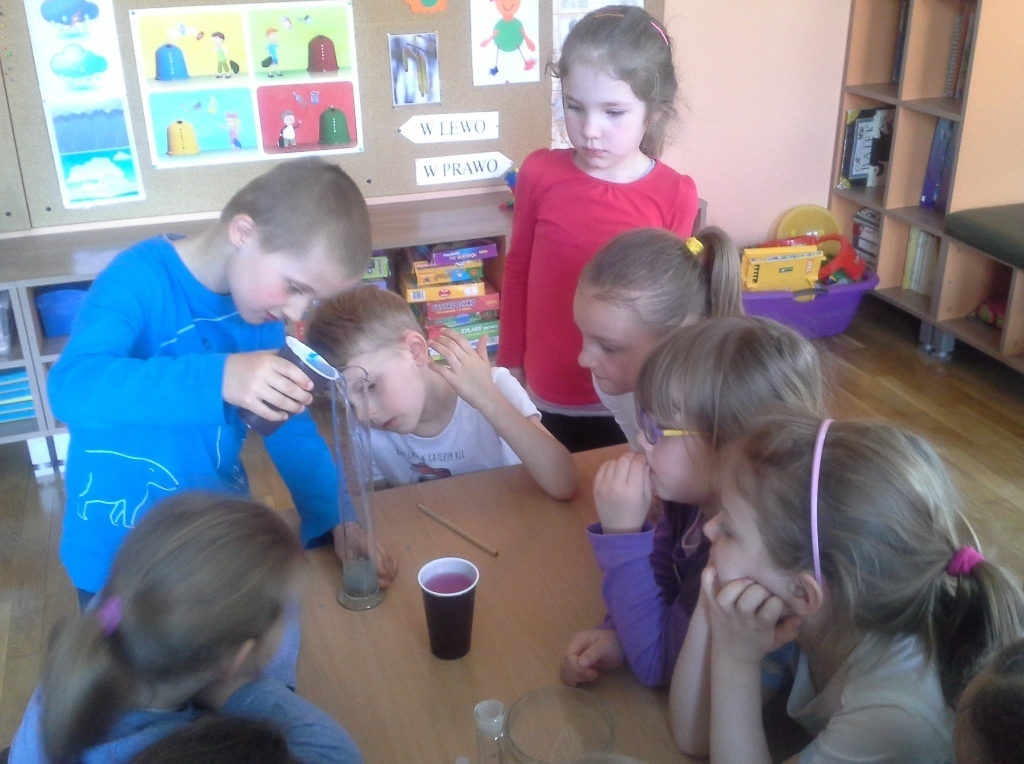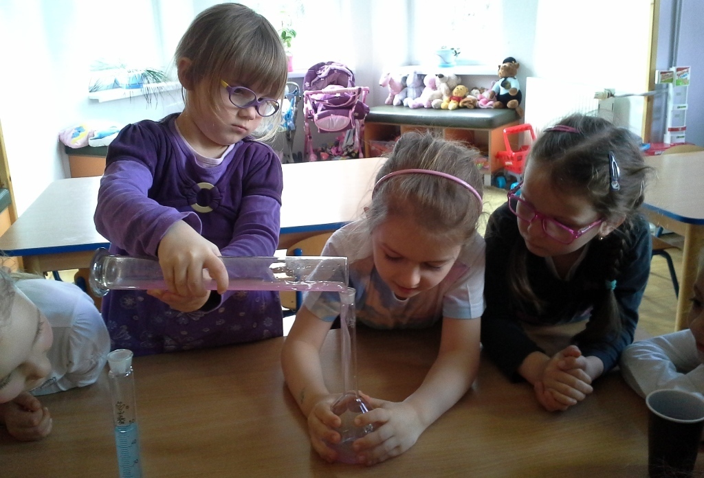 Dziś na zajęciach w przedszkolu zastanawialiśmy się skąd bierze się woda w kranie, gdzie ma swój początek oraz jak można wodę zmierzyć ? Następnie odmierzaliśmy wodę przy użyciu menzurek ze skalą. Najpierw jednak wodę zabarwiliśmy, żeby dokładnie można było zmierzyć jej ilość i porównać. Dzieci dowiedziały się, że jednostką miary wody i wszystkich cieczy jest litr i mililitr. Potem badaliśmy problem: Czy, jak wlejemy do wąskiego i wysokiego naczynia tyle samo wody co do szerokiego, to nadal będzie jej tyle samo? To było trudne zadanie, a zdania były podzielone, ale doszliśmy do wniosku, że przecież wlaliśmy po równo, tylko do różnych naczyń. Przelewanie wody to była świetna zabawa!