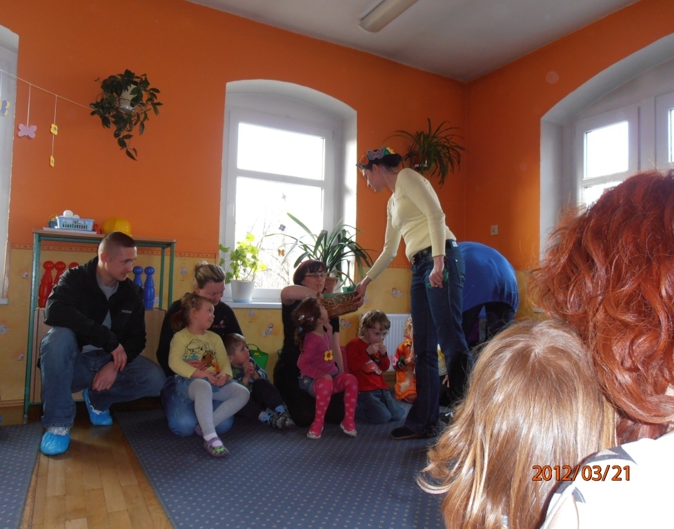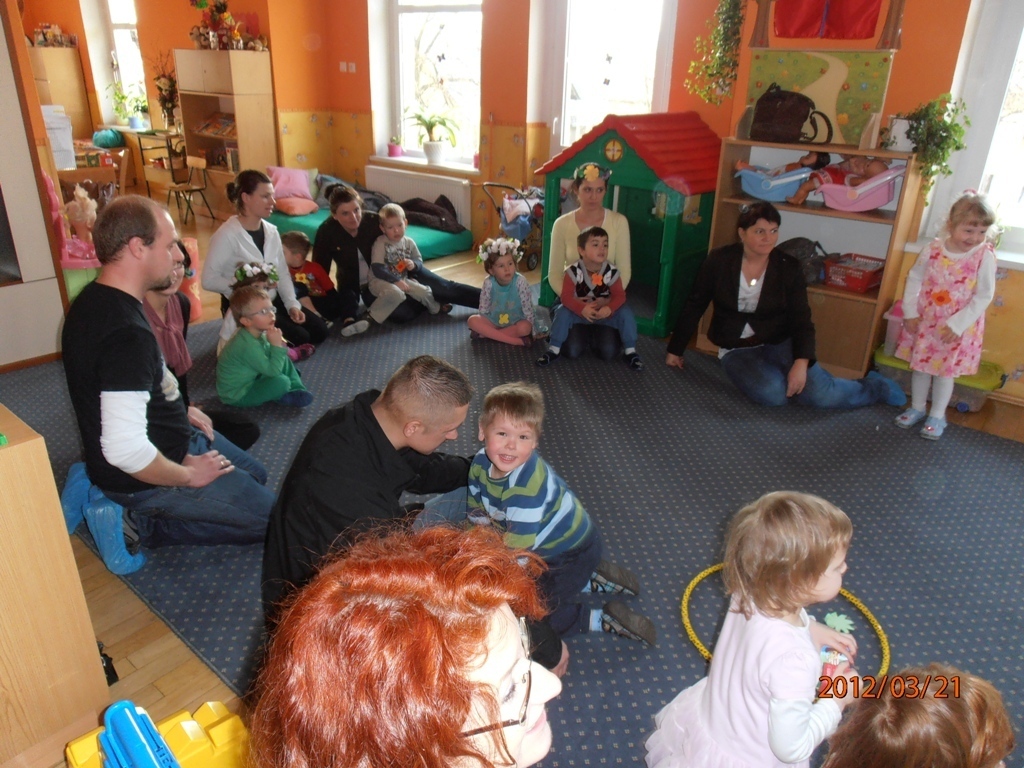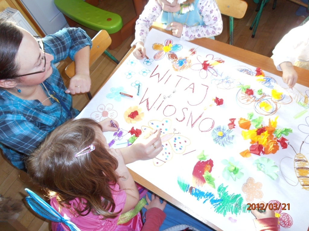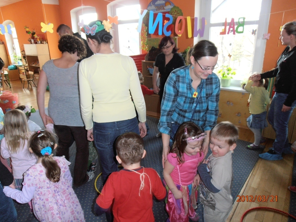 W naszej sali zebrały sie dzieci z rodzicami. Wspólnie pokonywaliśmy zadania postawione przed nami. Dużą dawkę humoru dostarczyły nam zagadki słuchowe pani Wiosny (komar zaskoczył wszystkich). Wiele zaangażowania wymagało od nas ostatnie zadanie: przygotowanie w grupach flag wiosennych, jednak wszyscy poradzili sobie z pracą. Tym wiosennym akcentem zakończyliśmy bal. Teraz z niecierpliwością oczekujemy lata.