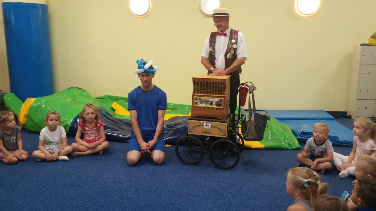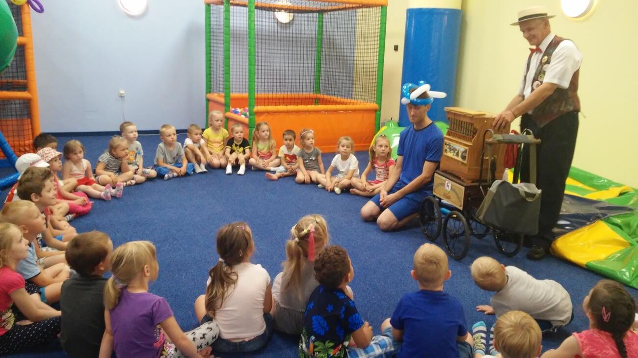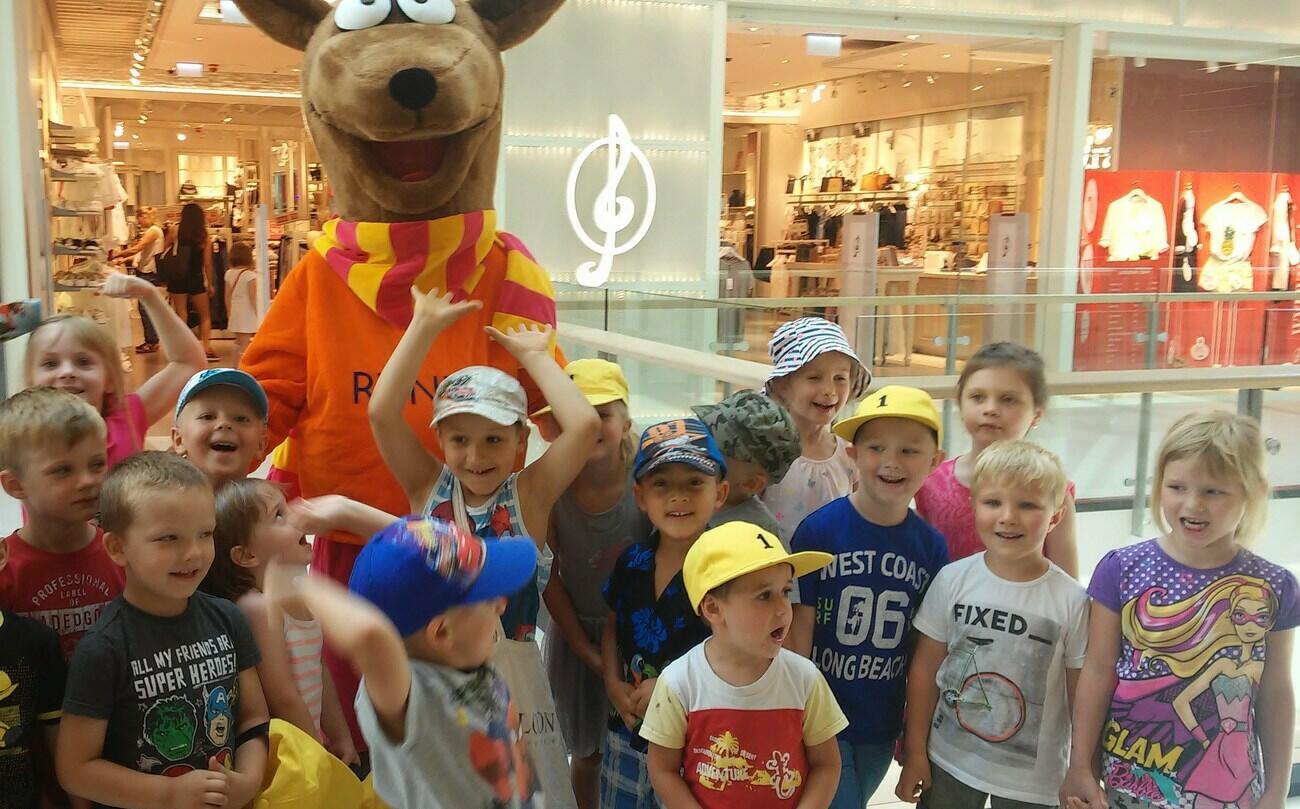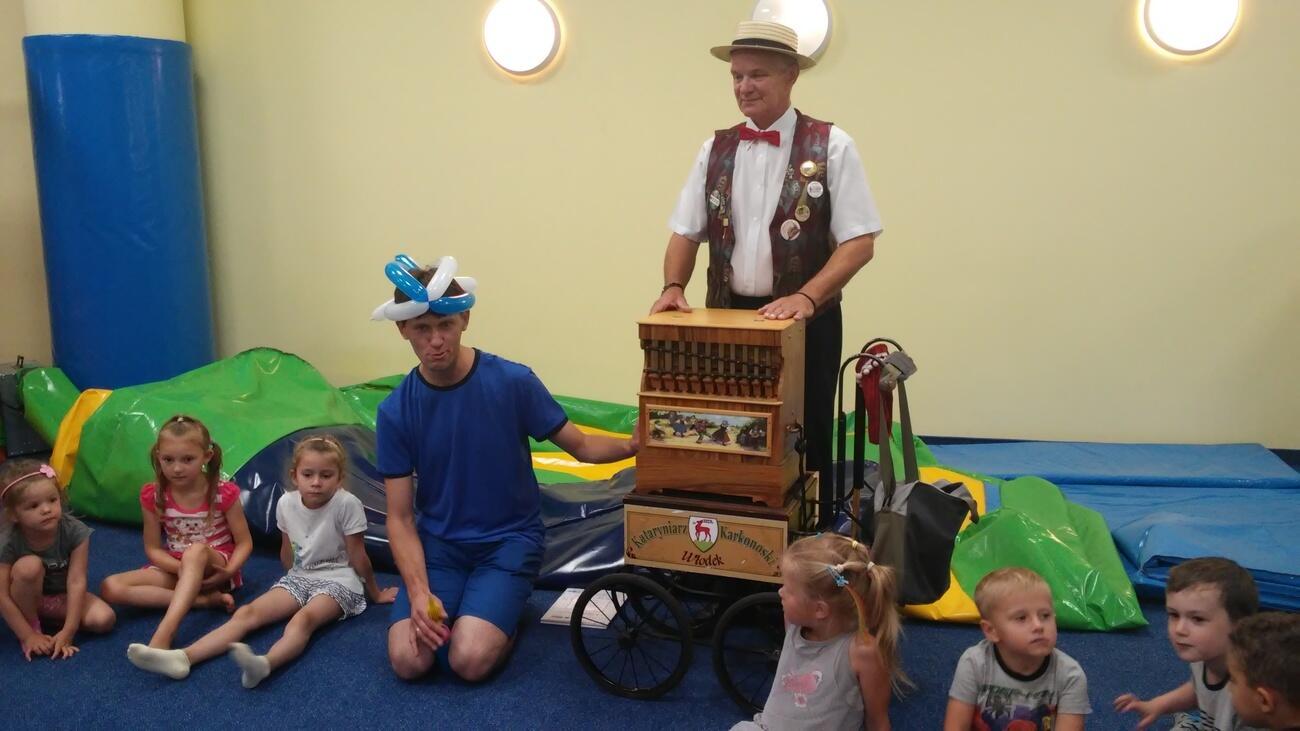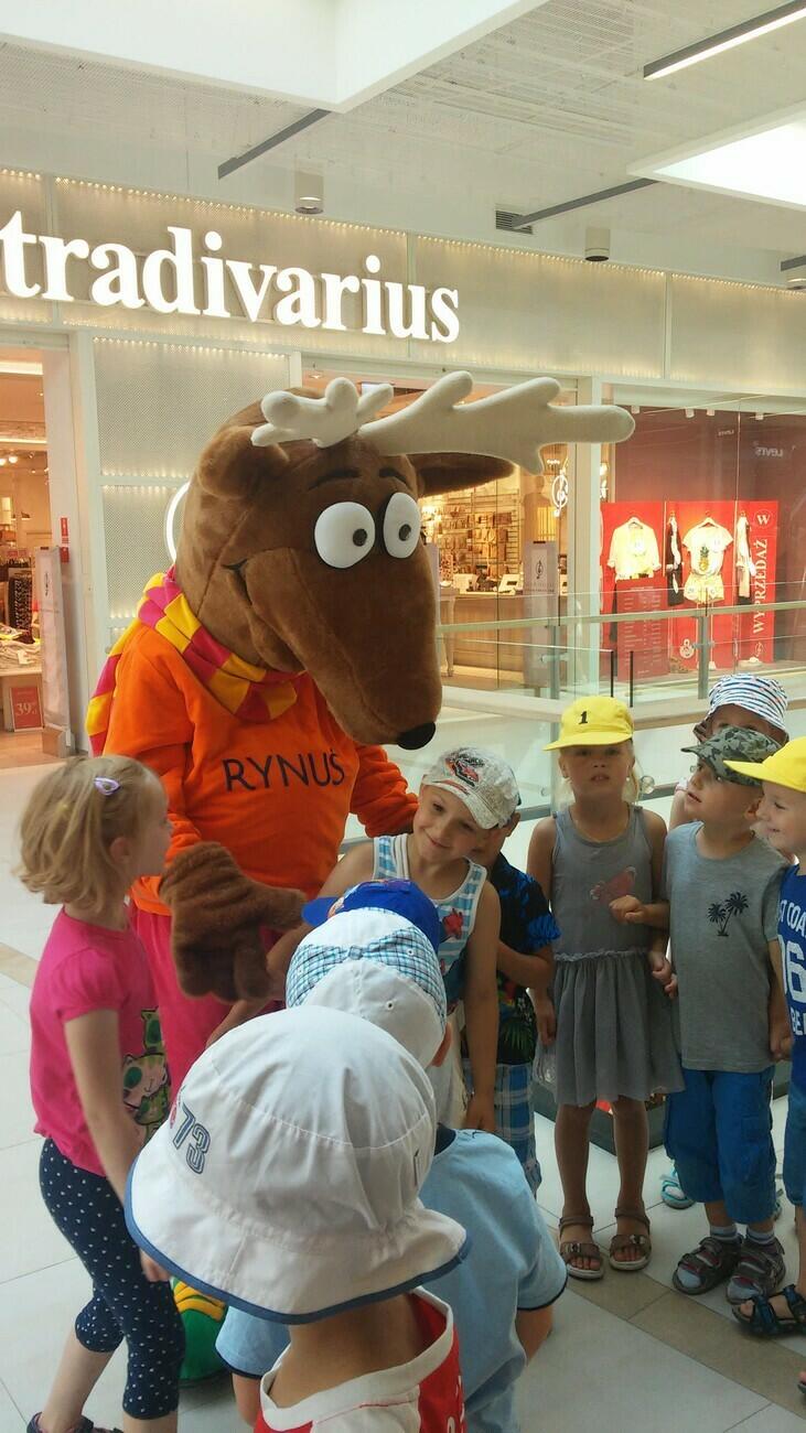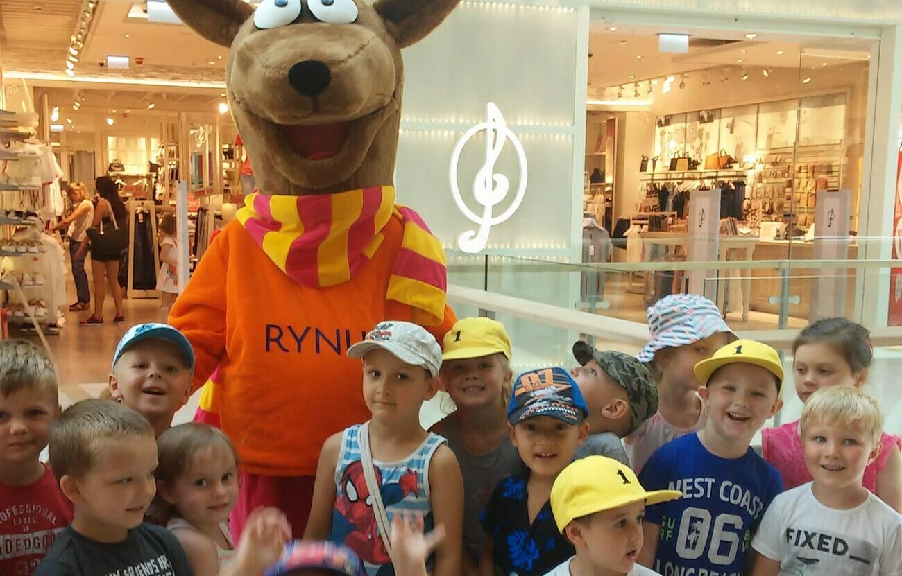 26.07. Tuptusiowe przedszkolaki wybrały się do Galerii Nowy Rynek na wakacyjne warsztaty. Po krótkiej przejażdżce autobusem, udaliśmy się na pierwsze piętro galerii, gdzie przywitał nas Rynuś – uśmiechnięty jelonek, który towarzyszył nam przez cały czas trwania zajęć. Na początku spotkania poznaliśmy pana Kataryniarza, który od lat gra na ulicach naszego miasta. Z przyjemnością wysłuchaliśmy wesołych dźwięków płynących z katarynki a także opowieści o tym, na czym polega praca kataryniarza. Najciekawsze było to, że mogliśmy zobaczyć z bliska jak zbudowany jest instrument a niektórzy mogli nawet zagrać na katarynce. Następnie Pan Rafał, prowadzący całe spotkanie, przeczytał nam książkę pt.: „Książka bez obrazków”, a dzieci co chwilę wybuchały śmiechem. Na koniec spotkania chętne przedszkolaki mogły uczestniczyć w warsztatach plastycznych lub pobawić się w fun parku. Uśmiechnięci i zadowoleni wracaliśmy do przedszkola, by po dniu pełnym wrażeń odpocząć w sali.