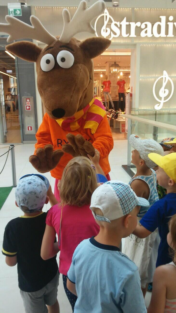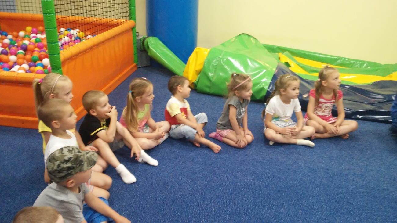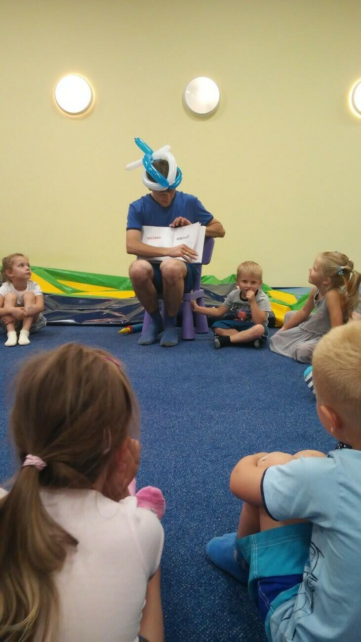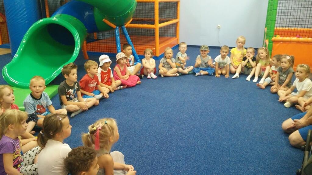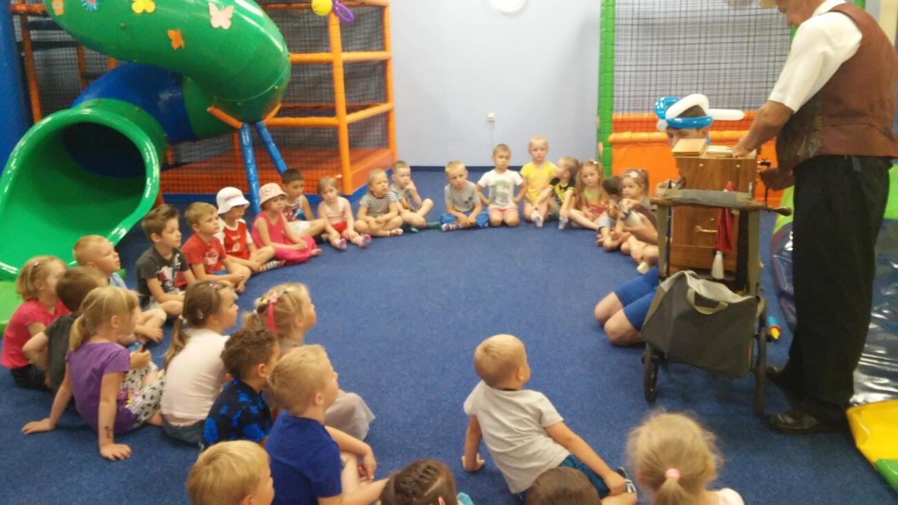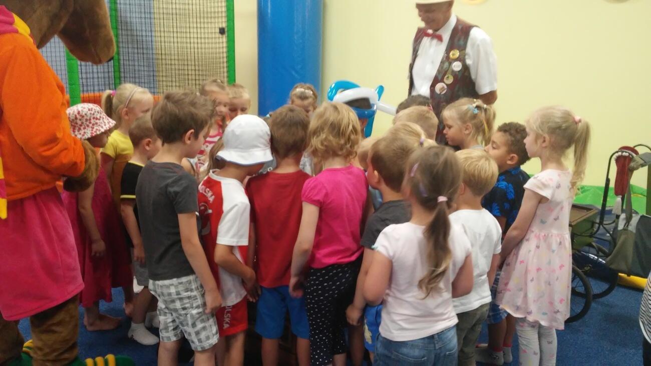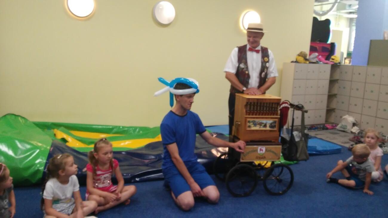 26.07. Tuptusiowe przedszkolaki wybrały się do Galerii Nowy Rynek na wakacyjne warsztaty. Po krótkiej przejażdżce autobusem, udaliśmy się na pierwsze piętro galerii, gdzie przywitał nas Rynuś – uśmiechnięty jelonek, który towarzyszył nam przez cały czas trwania zajęć. Na początku spotkania poznaliśmy pana Kataryniarza, który od lat gra na ulicach naszego miasta. Z przyjemnością wysłuchaliśmy wesołych dźwięków płynących z katarynki a także opowieści o tym, na czym polega praca kataryniarza. Najciekawsze było to, że mogliśmy zobaczyć z bliska jak zbudowany jest instrument a niektórzy mogli nawet zagrać na katarynce. Następnie Pan Rafał, prowadzący całe spotkanie, przeczytał nam książkę pt.: „Książka bez obrazków”, a dzieci co chwilę wybuchały śmiechem. Na koniec spotkania chętne przedszkolaki mogły uczestniczyć w warsztatach plastycznych lub pobawić się w fun parku. Uśmiechnięci i zadowoleni wracaliśmy do przedszkola, by po dniu pełnym wrażeń odpocząć w sali.