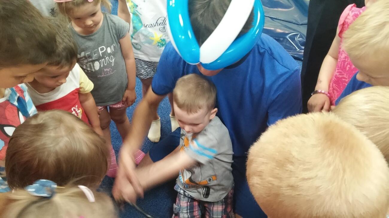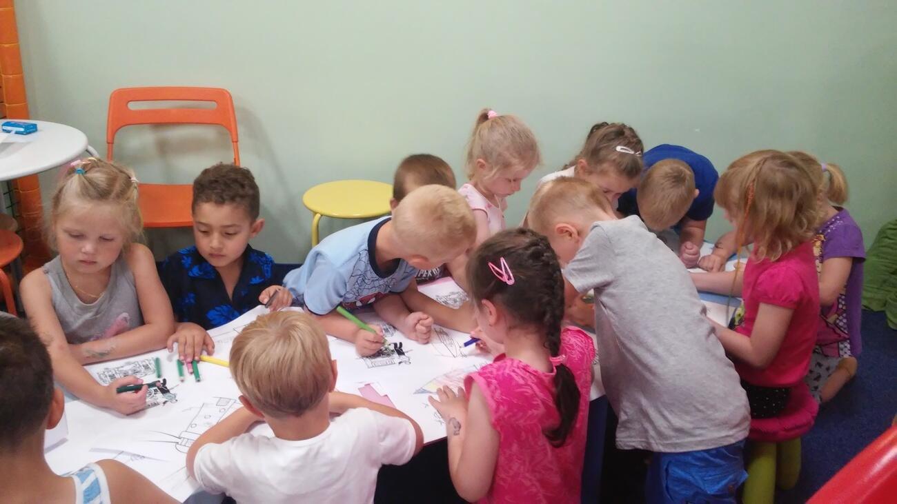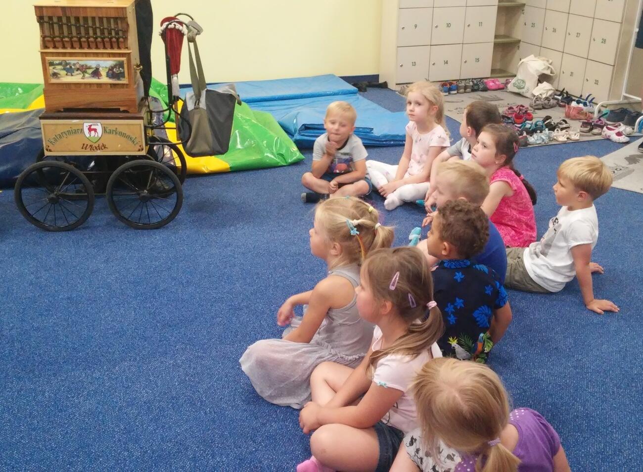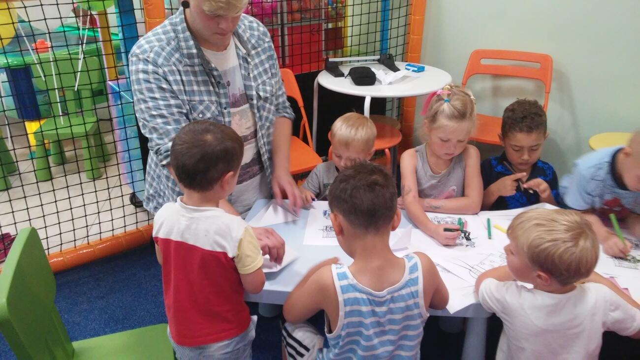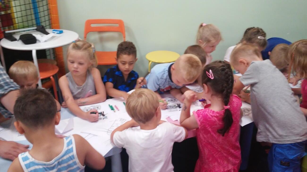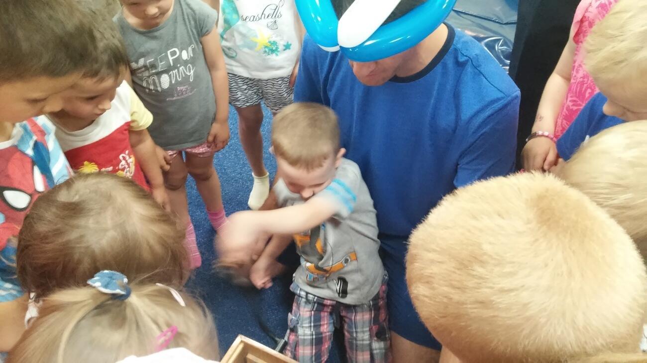 26.07. Tuptusiowe przedszkolaki wybrały się do Galerii Nowy Rynek na wakacyjne warsztaty. Po krótkiej przejażdżce autobusem, udaliśmy się na pierwsze piętro galerii, gdzie przywitał nas Rynuś – uśmiechnięty jelonek, który towarzyszył nam przez cały czas trwania zajęć. Na początku spotkania poznaliśmy pana Kataryniarza, który od lat gra na ulicach naszego miasta. Z przyjemnością wysłuchaliśmy wesołych dźwięków płynących z katarynki a także opowieści o tym, na czym polega praca kataryniarza. Najciekawsze było to, że mogliśmy zobaczyć z bliska jak zbudowany jest instrument a niektórzy mogli nawet zagrać na katarynce. Następnie Pan Rafał, prowadzący całe spotkanie, przeczytał nam książkę pt.: „Książka bez obrazków”, a dzieci co chwilę wybuchały śmiechem. Na koniec spotkania chętne przedszkolaki mogły uczestniczyć w warsztatach plastycznych lub pobawić się w fun parku. Uśmiechnięci i zadowoleni wracaliśmy do przedszkola, by po dniu pełnym wrażeń odpocząć w sali.