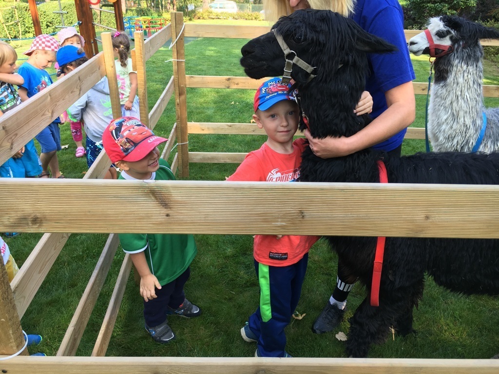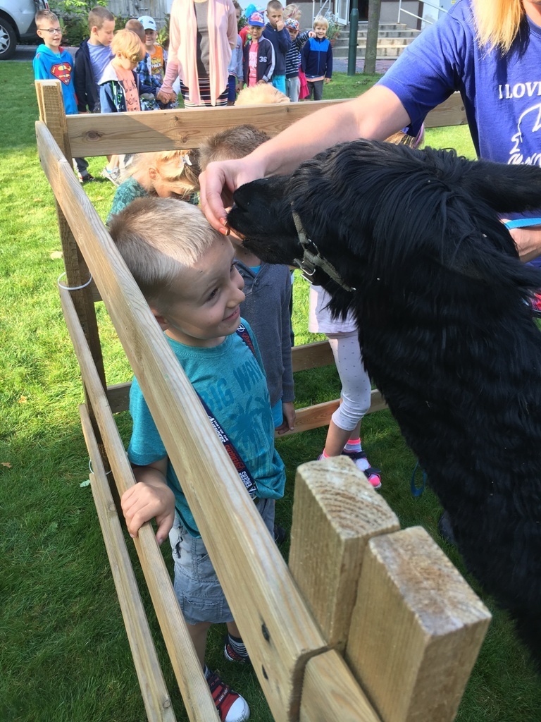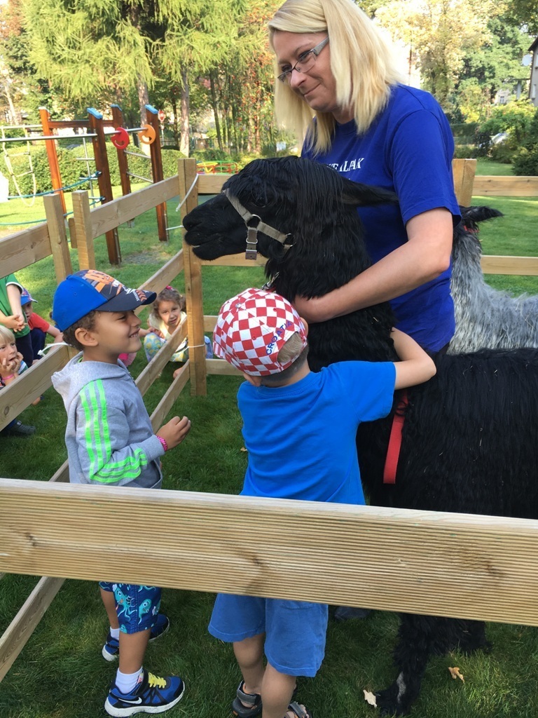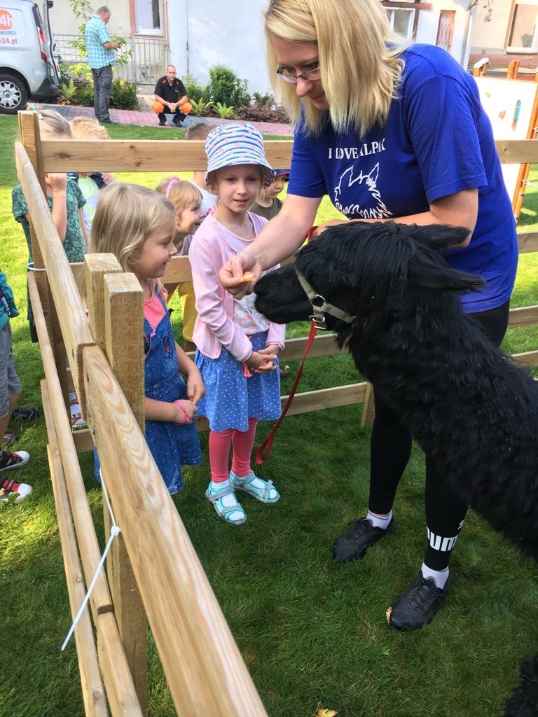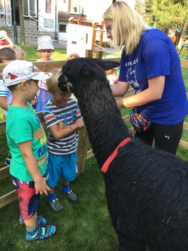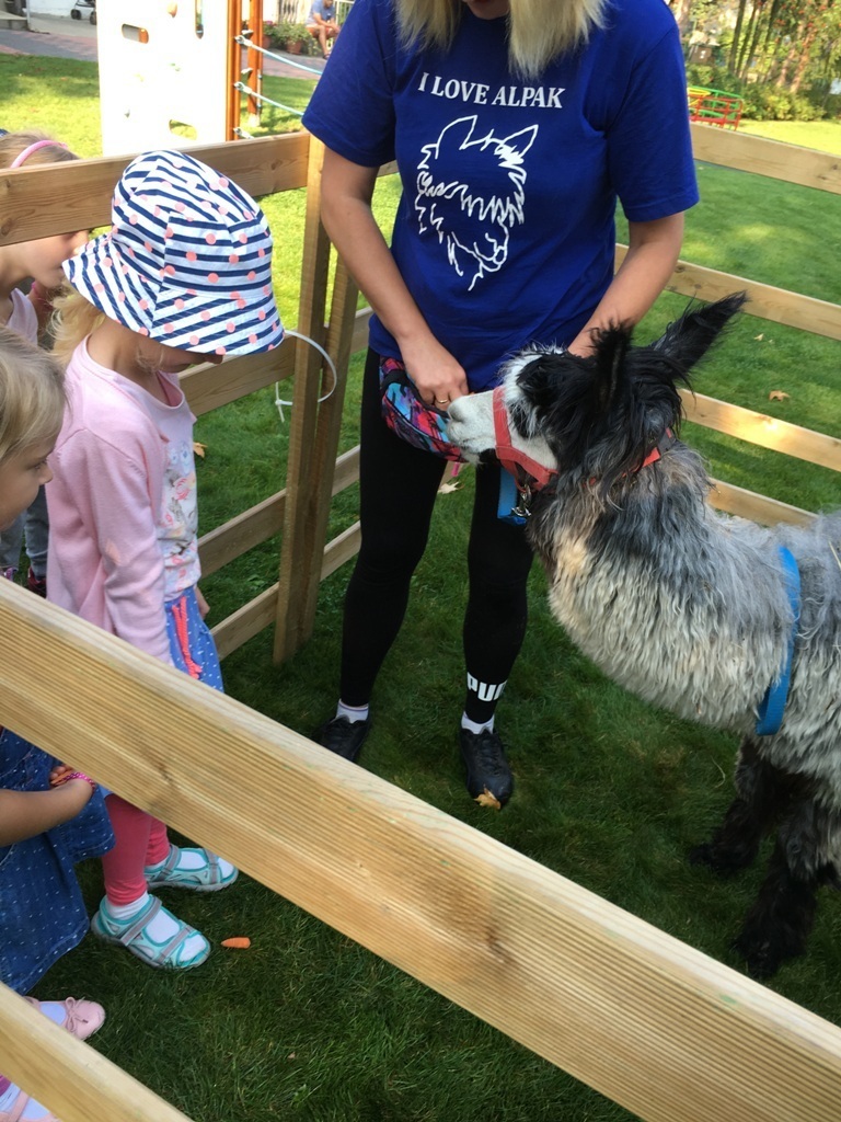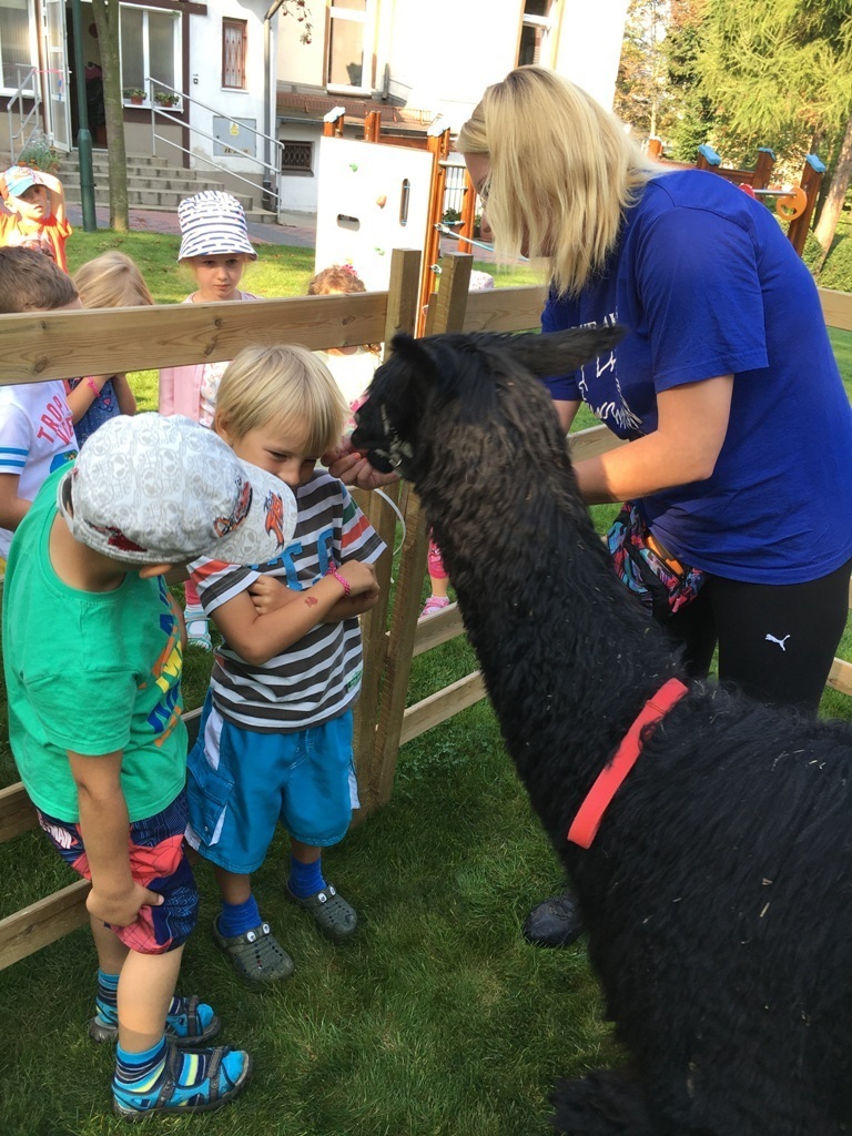 W dniu dzisiejszym nasze przedszkole odwiedziły żywe alpaki. Przed spotkaniem ich opiekunka opowiedziała nam w jaki sposób bezpiecznie powinniśmy się zachować w kontakcie z tymi zwierzętami. Szafirek i Klakson zrobiły na dzieciach ogromne wrażenie. Każdy przedszkolaka miał możliwość krótkiej zabawy i nakarmienia zwierząt. Okazało się , ze alpaki są ogromnymi fanami marchewek i trawy. Ze smakiem zajadały przygotowane przekąski z rak dzieci, a nawet "czapek". Była to dla nas wspaniała zabawa.