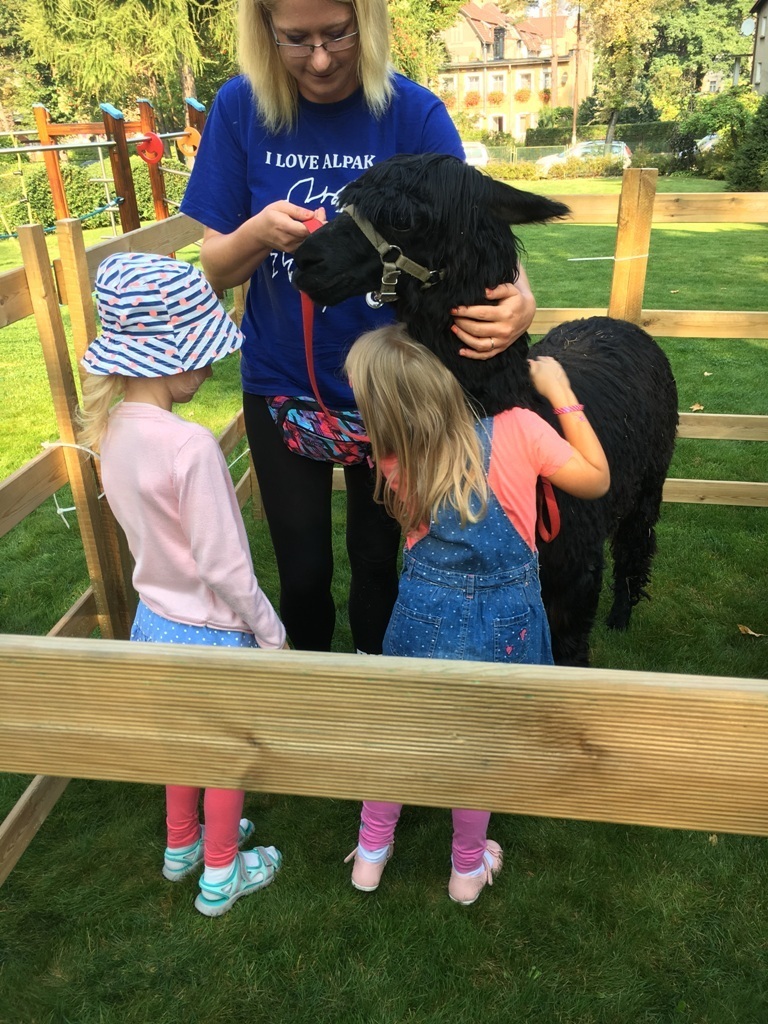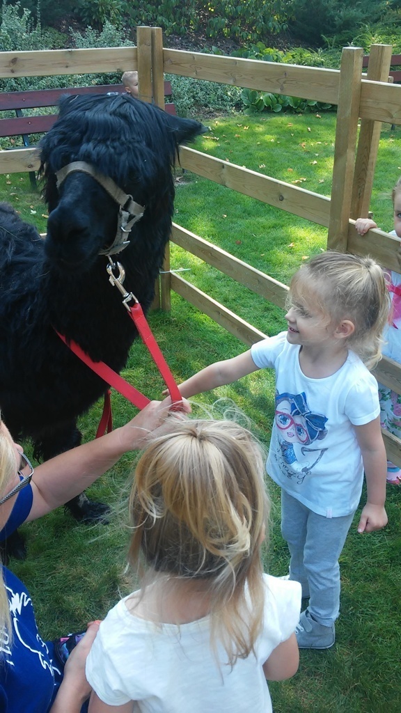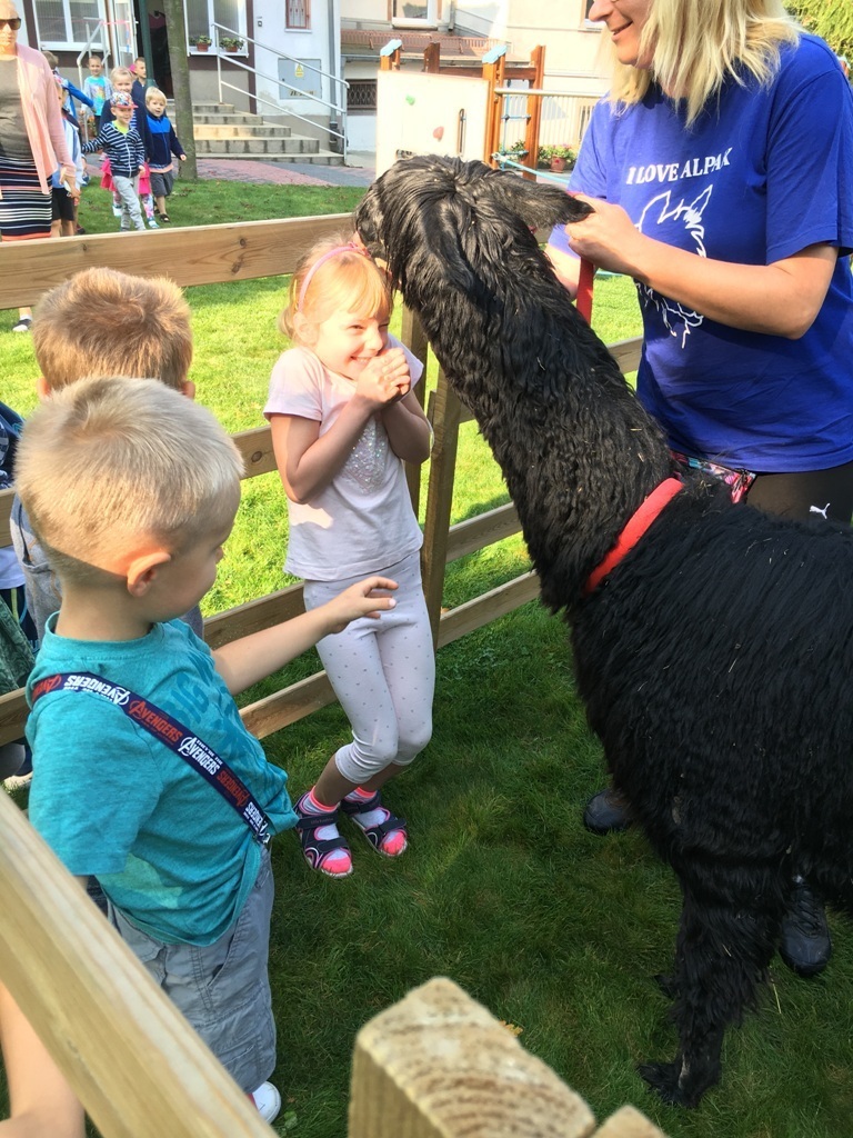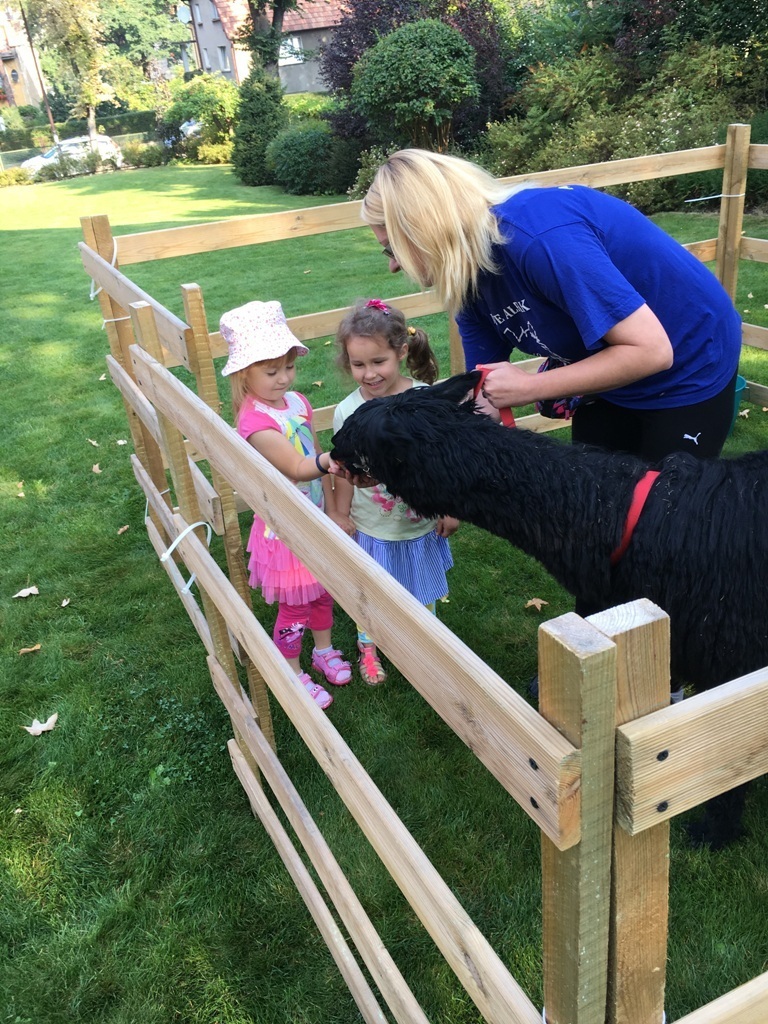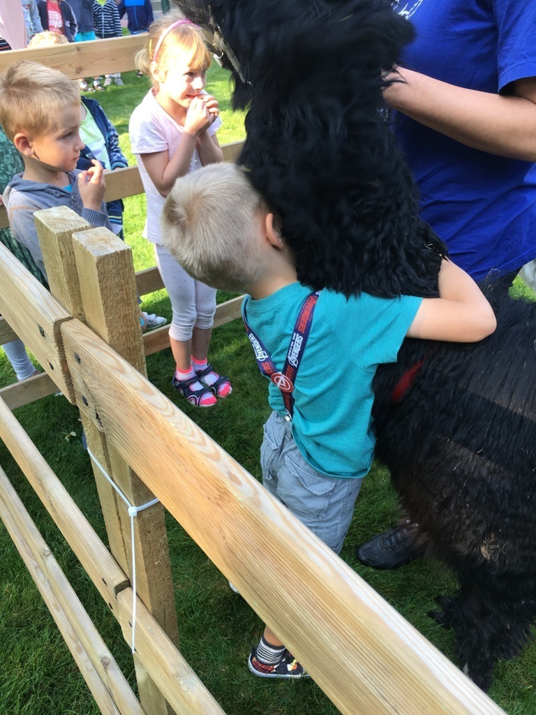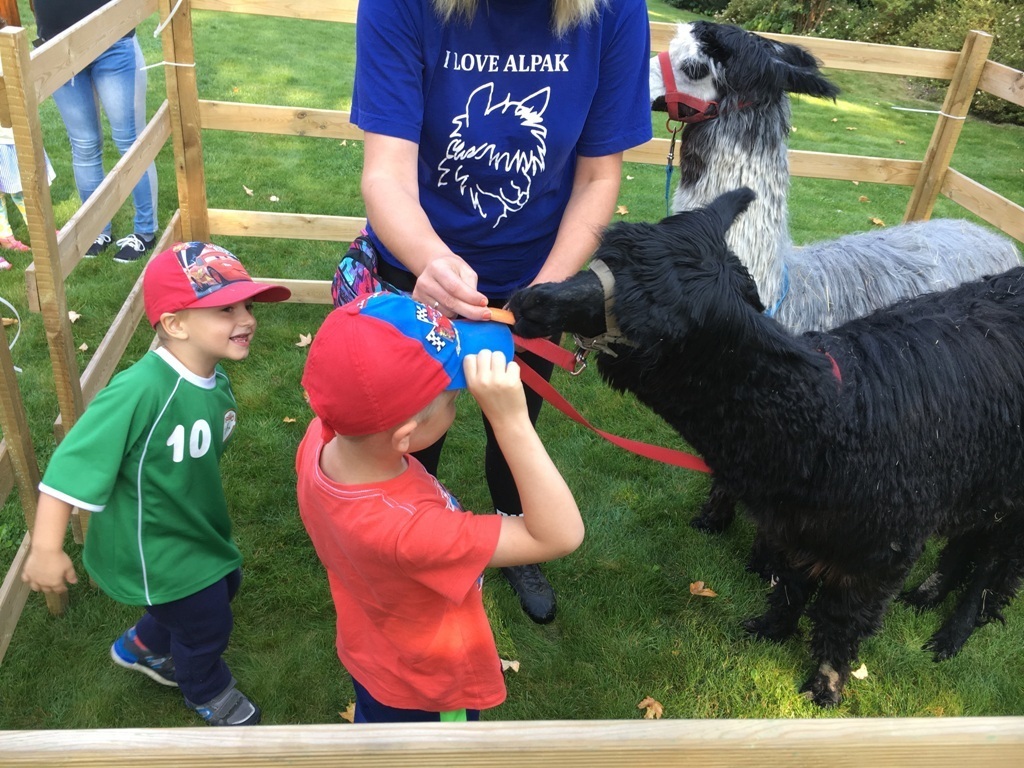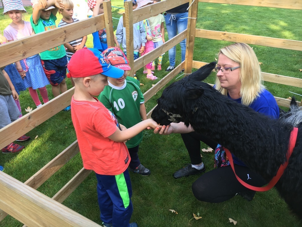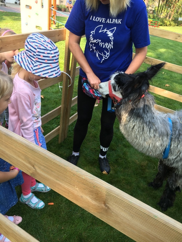 W dniu dzisiejszym nasze przedszkole odwiedziły żywe alpaki. Przed spotkaniem ich opiekunka opowiedziała nam w jaki sposób bezpiecznie powinniśmy się zachować w kontakcie z tymi zwierzętami. Szafirek i Klakson zrobiły na dzieciach ogromne wrażenie. Każdy przedszkolaka miał możliwość krótkiej zabawy i nakarmienia zwierząt. Okazało się , ze alpaki są ogromnymi fanami marchewek i trawy. Ze smakiem zajadały przygotowane przekąski z rak dzieci, a nawet "czapek". Była to dla nas wspaniała zabawa.
