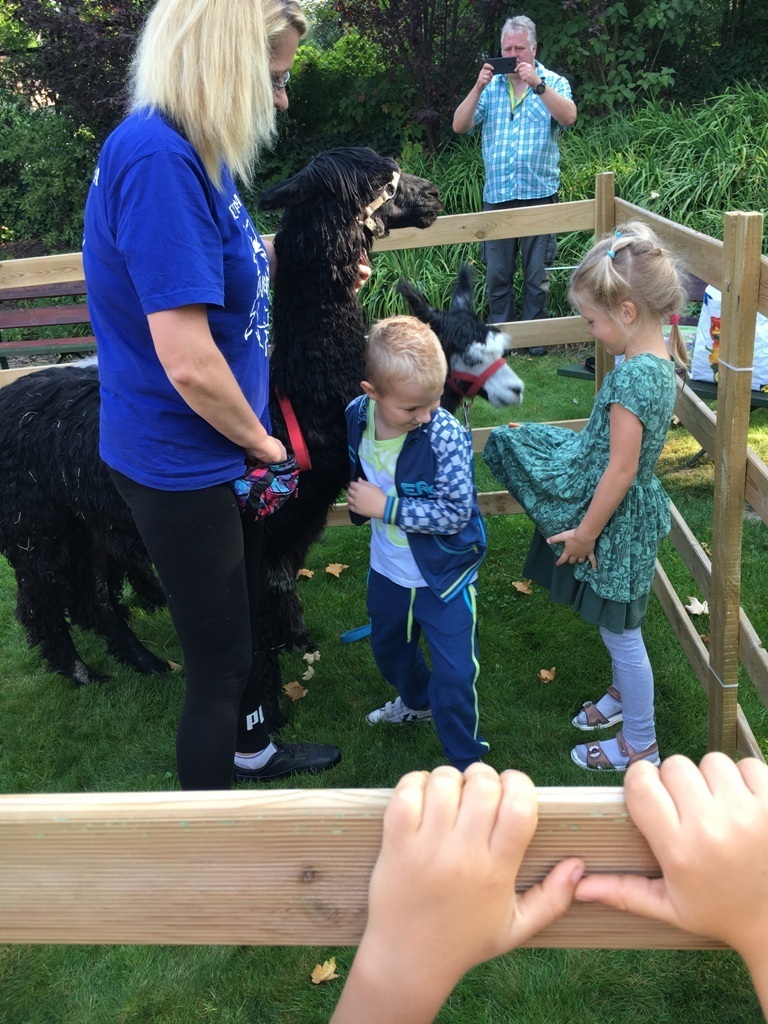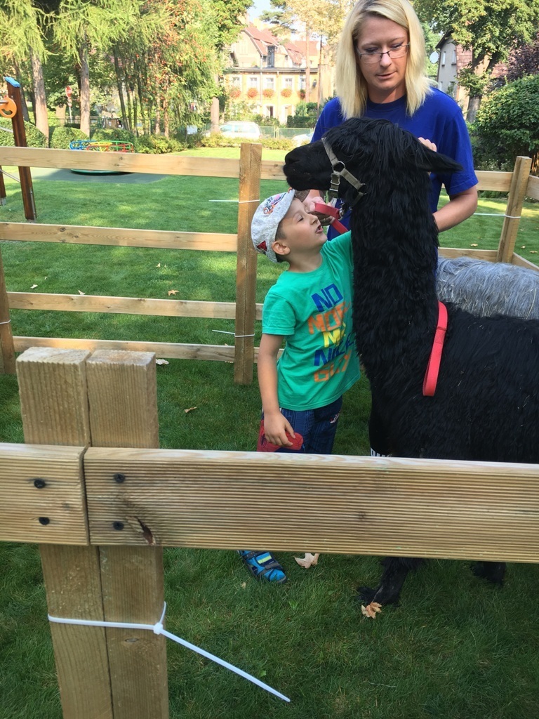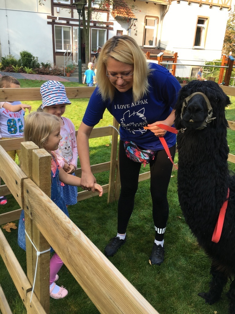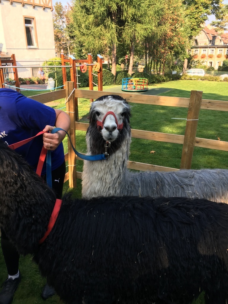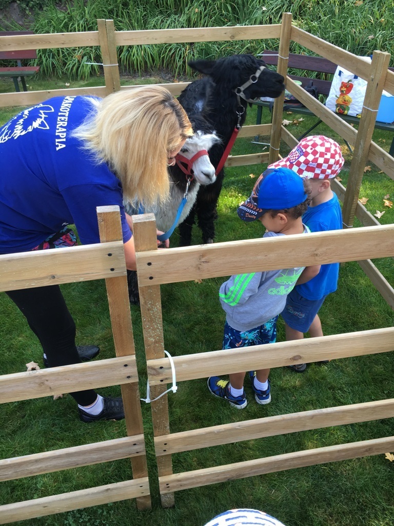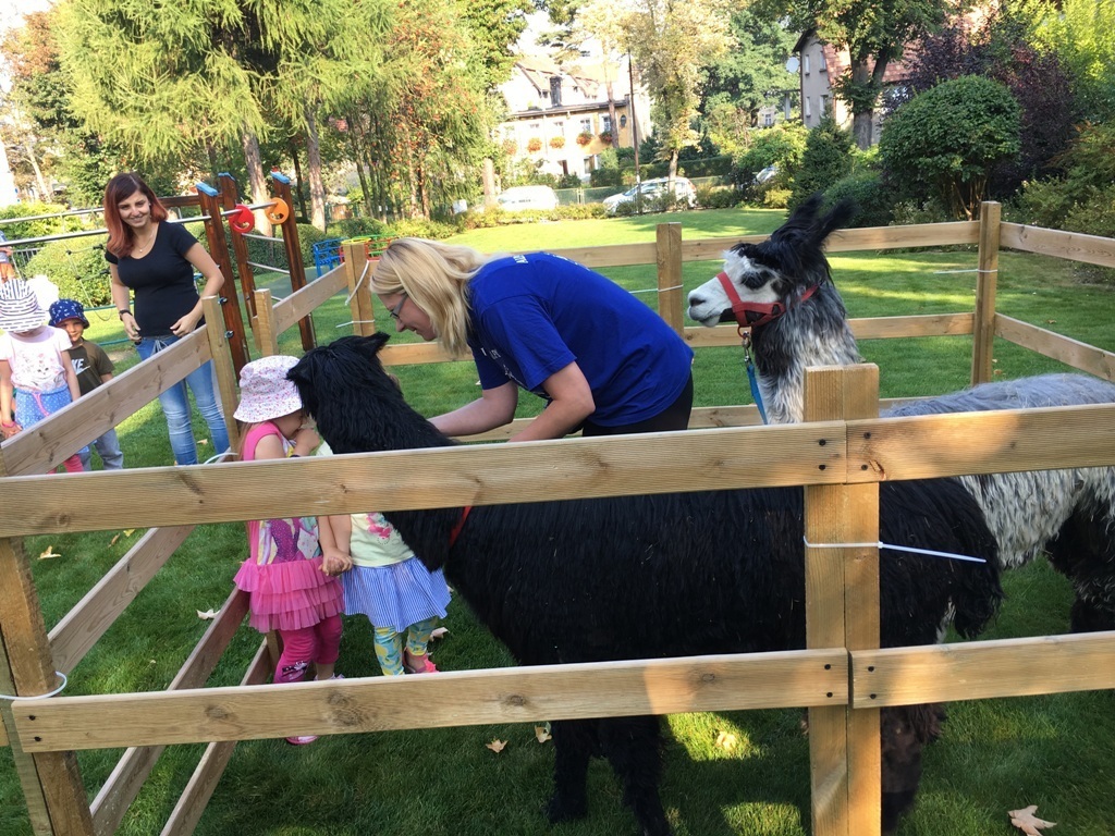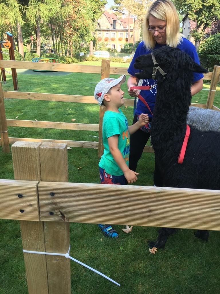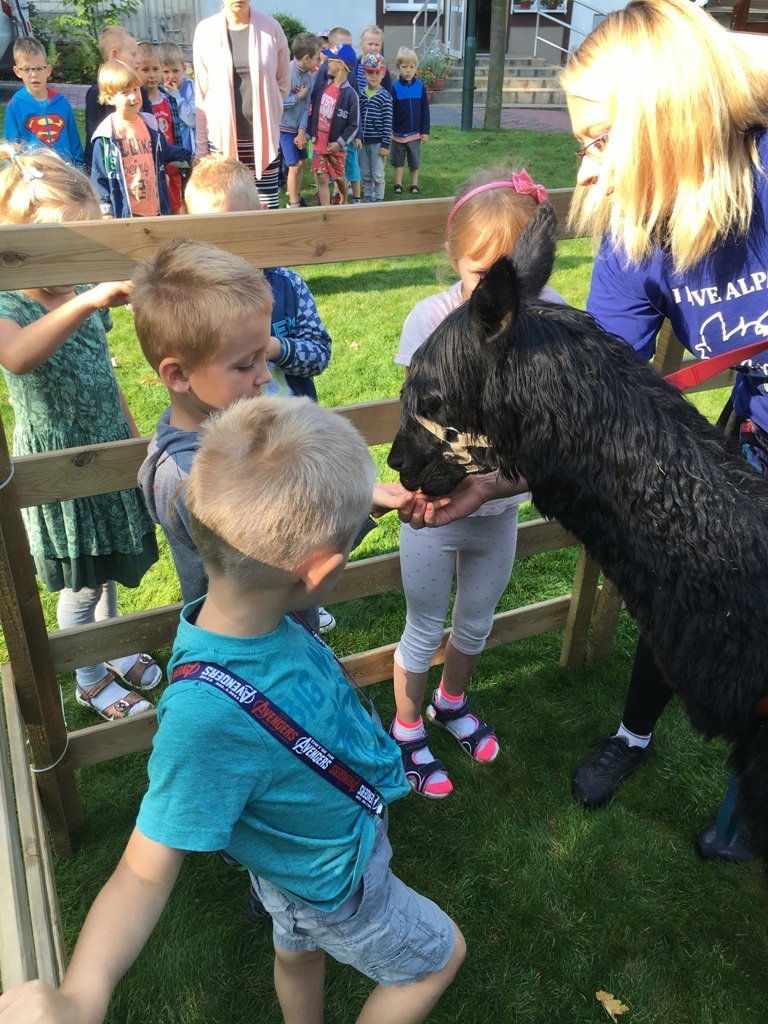 W dniu dzisiejszym nasze przedszkole odwiedziły żywe alpaki. Przed spotkaniem ich opiekunka opowiedziała nam w jaki sposób bezpiecznie powinniśmy się zachować w kontakcie z tymi zwierzętami. Szafirek i Klakson zrobiły na dzieciach ogromne wrażenie. Każdy przedszkolaka miał możliwość krótkiej zabawy i nakarmienia zwierząt. Okazało się , ze alpaki są ogromnymi fanami marchewek i trawy. Ze smakiem zajadały przygotowane przekąski z rak dzieci, a nawet "czapek". Była to dla nas wspaniała zabawa.