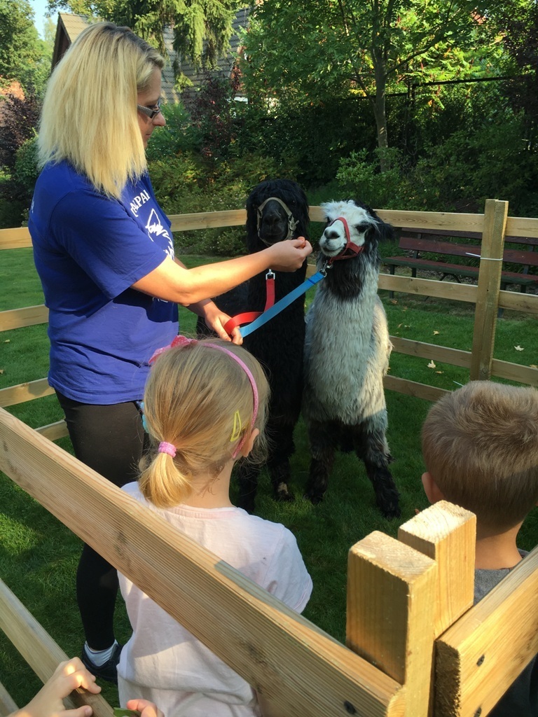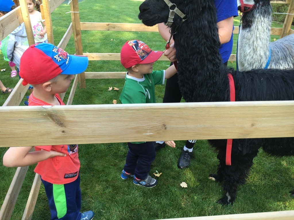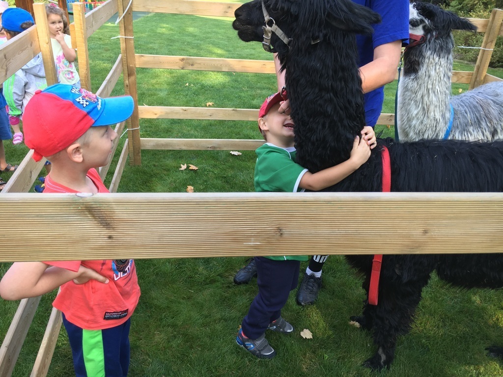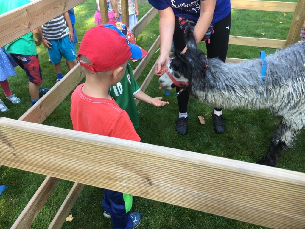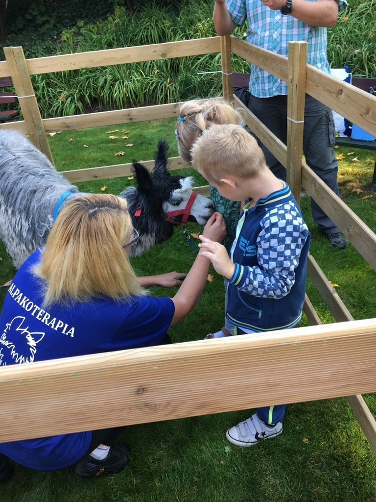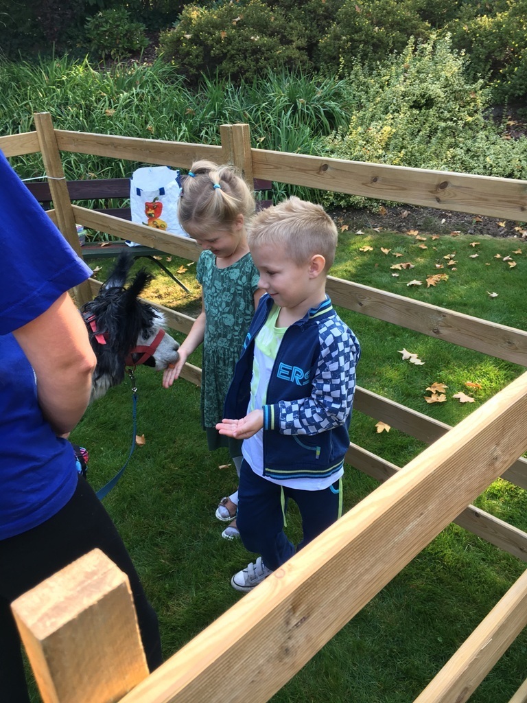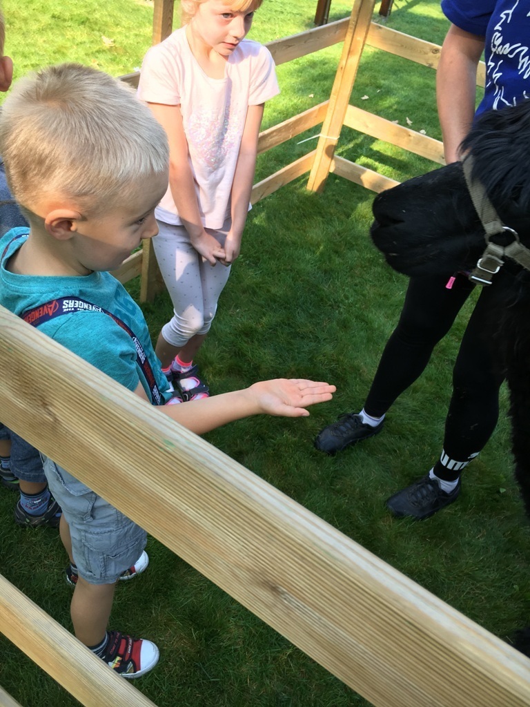 W dniu dzisiejszym nasze przedszkole odwiedziły żywe alpaki. Przed spotkaniem ich opiekunka opowiedziała nam w jaki sposób bezpiecznie powinniśmy się zachować w kontakcie z tymi zwierzętami. Szafirek i Klakson zrobiły na dzieciach ogromne wrażenie. Każdy przedszkolaka miał możliwość krótkiej zabawy i nakarmienia zwierząt. Okazało się , ze alpaki są ogromnymi fanami marchewek i trawy. Ze smakiem zajadały przygotowane przekąski z rak dzieci, a nawet "czapek". Była to dla nas wspaniała zabawa.