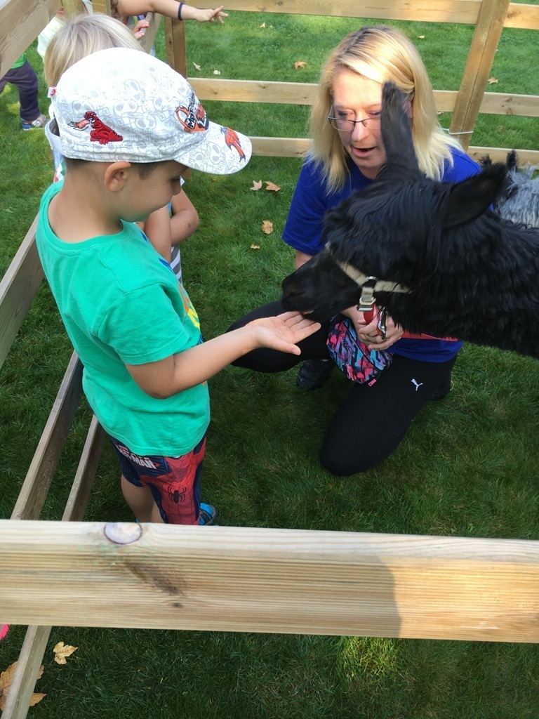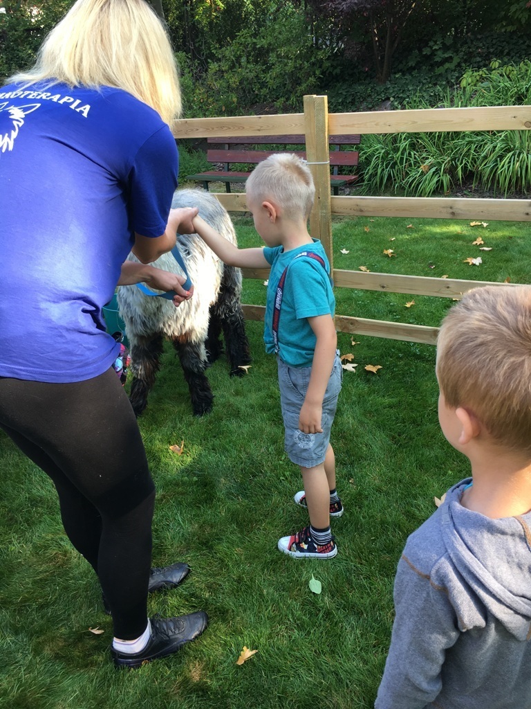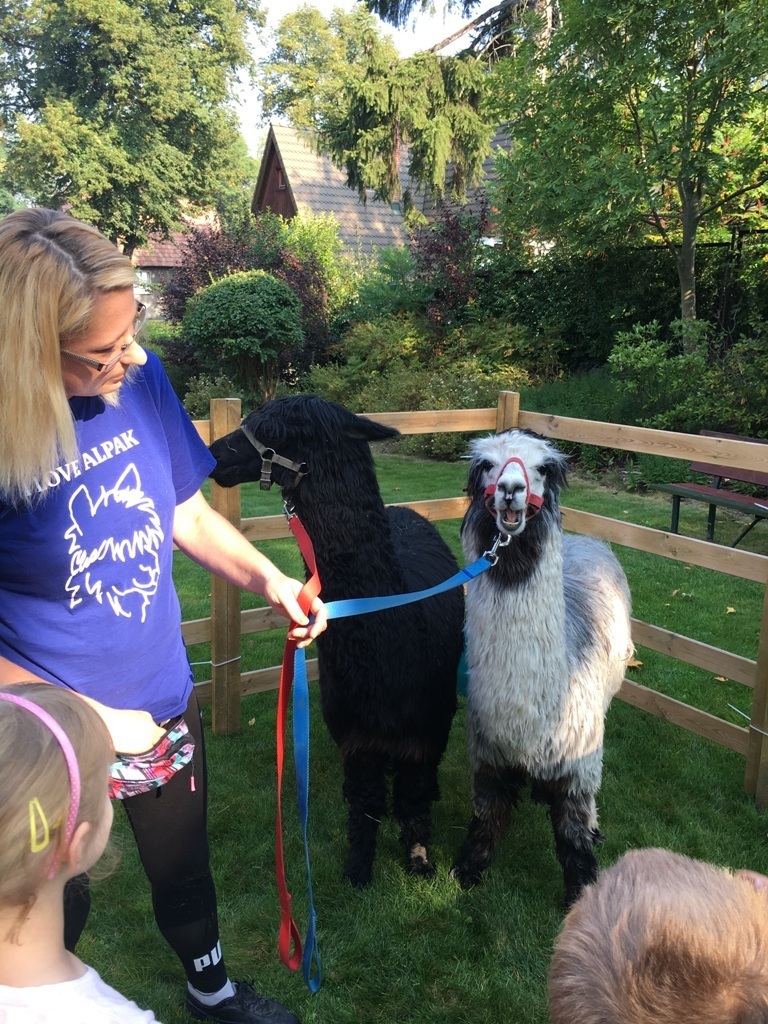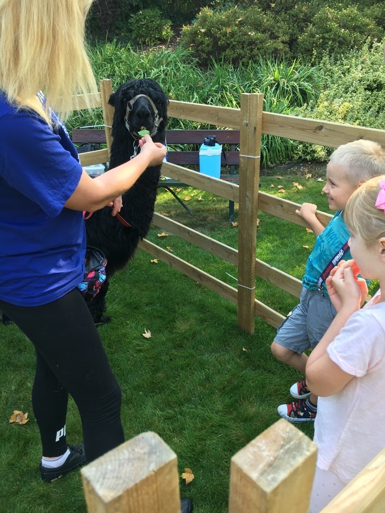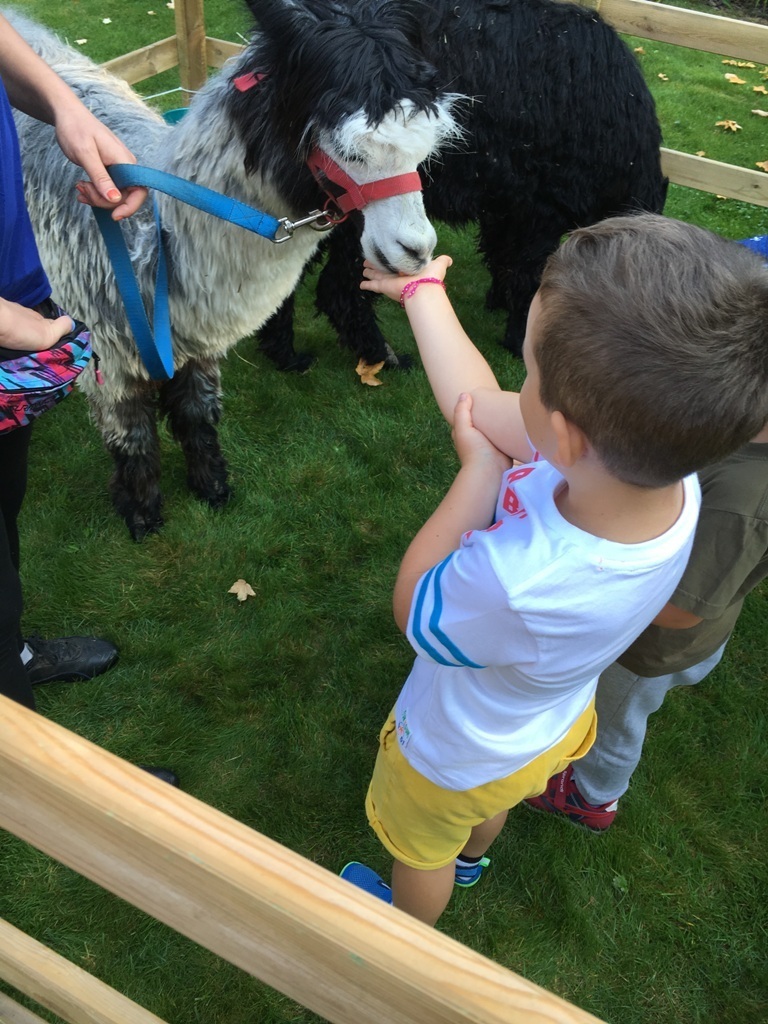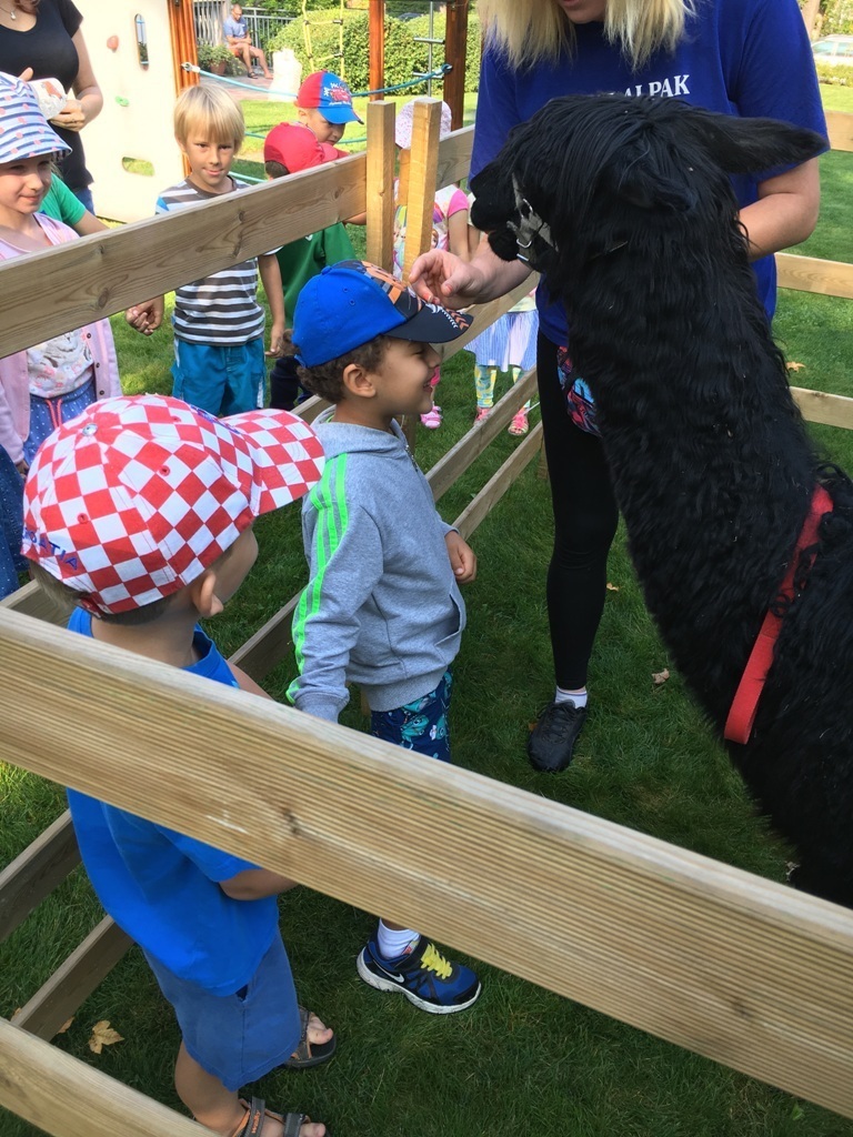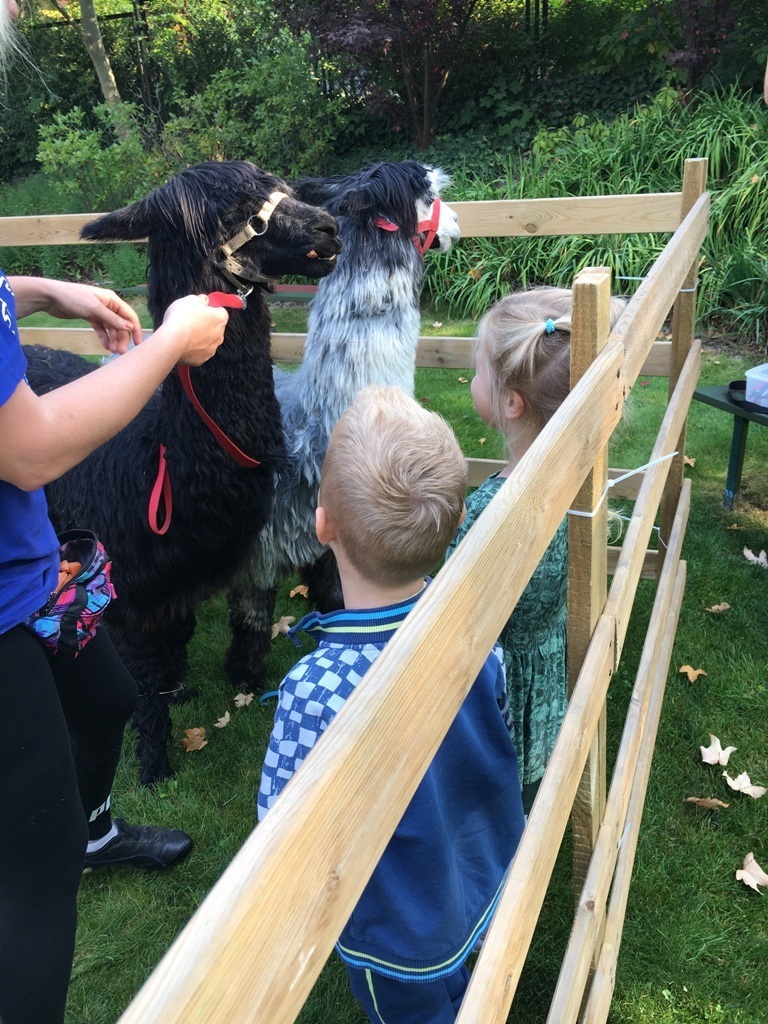W dniu dzisiejszym nasze przedszkole odwiedziły żywe alpaki. Przed spotkaniem ich opiekunka opowiedziała nam w jaki sposób bezpiecznie powinniśmy się zachować w kontakcie z tymi zwierzętami. Szafirek i Klakson zrobiły na dzieciach ogromne wrażenie. Każdy przedszkolaka miał możliwość krótkiej zabawy i nakarmienia zwierząt. Okazało się , ze alpaki są ogromnymi fanami marchewek i trawy. Ze smakiem zajadały przygotowane przekąski z rak dzieci, a nawet "czapek". Była to dla nas wspaniała zabawa.