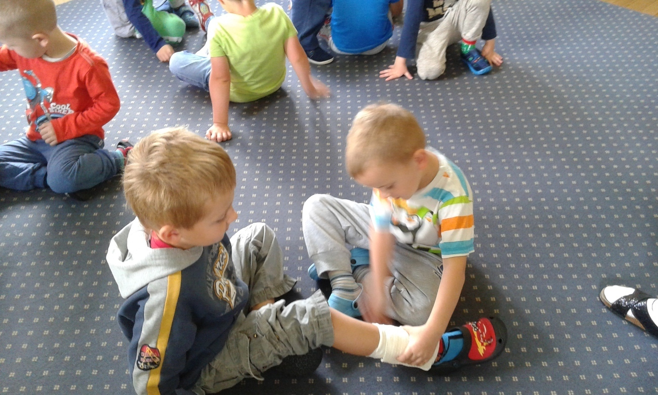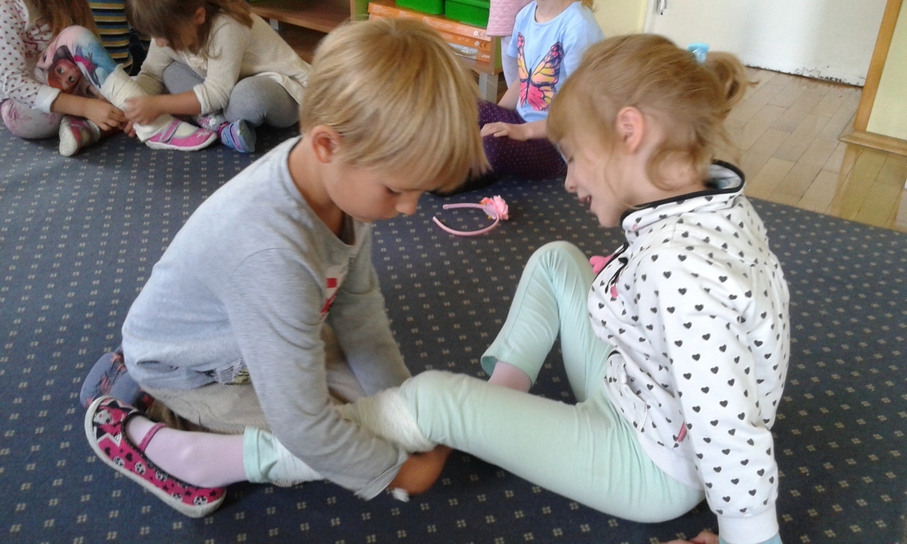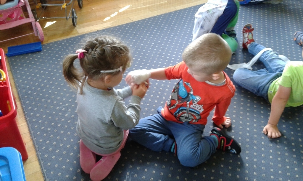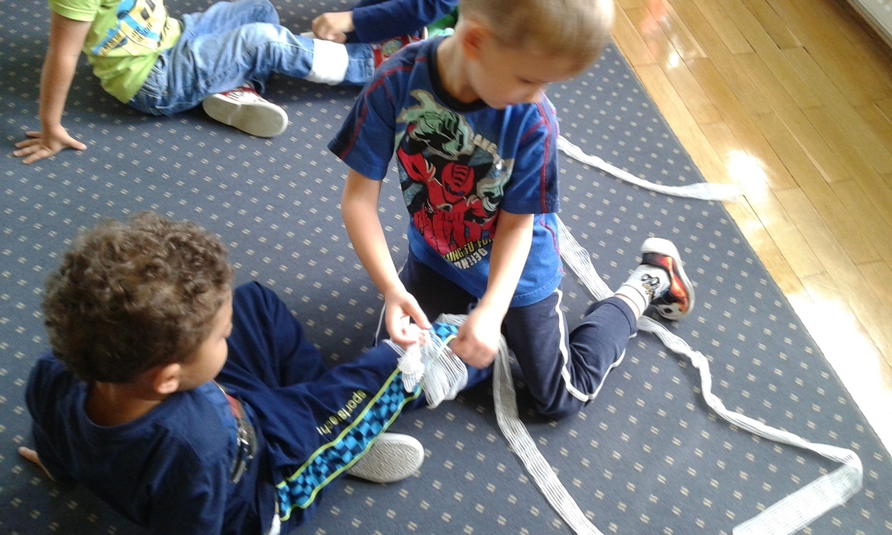 Jednak największa atrakcją było bandażowanie określonych części ciała: głowy, ręki, stopy i nasze przedszkolaki świetnie sobie z tym poradziły.