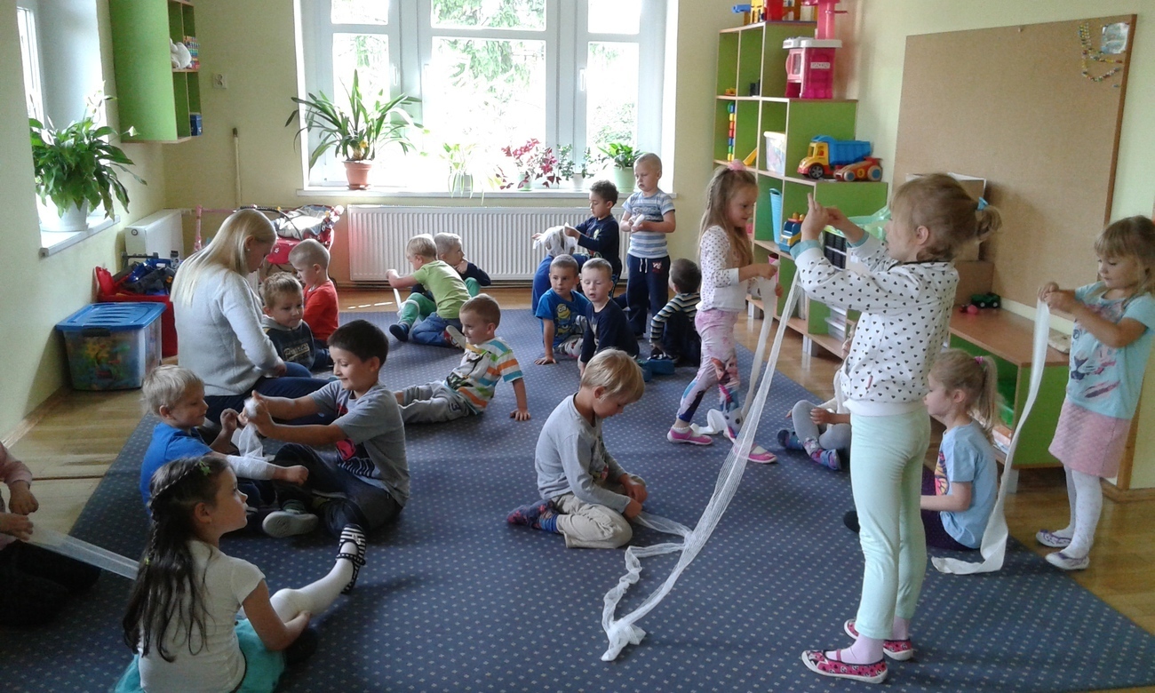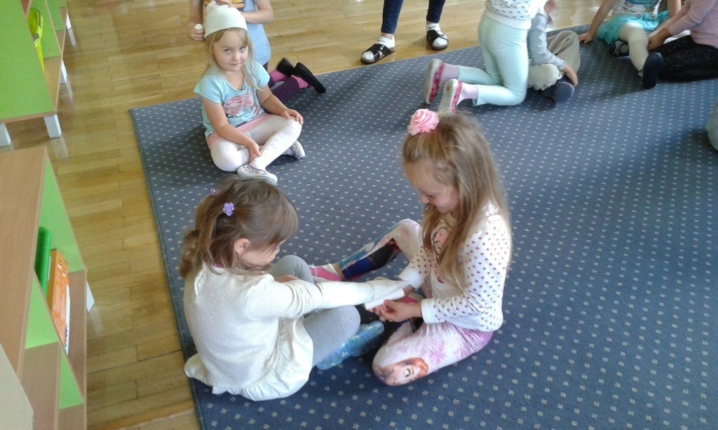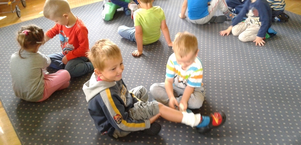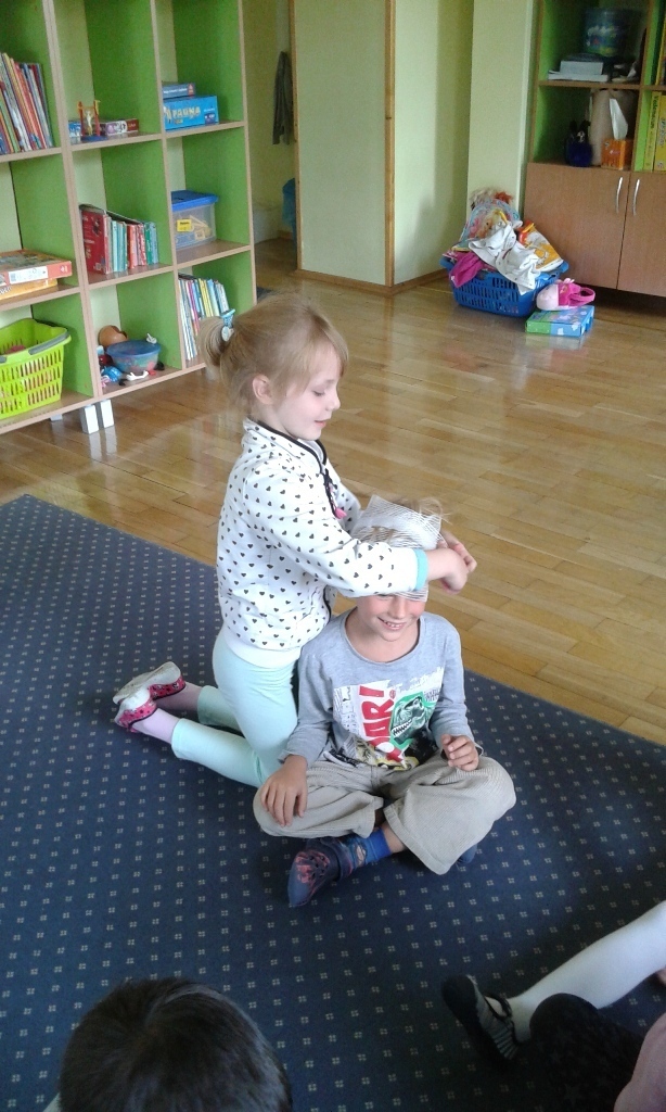Jednak największa atrakcją było bandażowanie określonych części ciała: głowy, ręki, stopy i nasze przedszkolaki świetnie sobie z tym poradziły.
