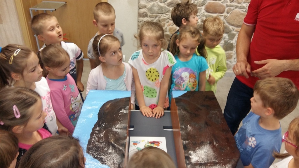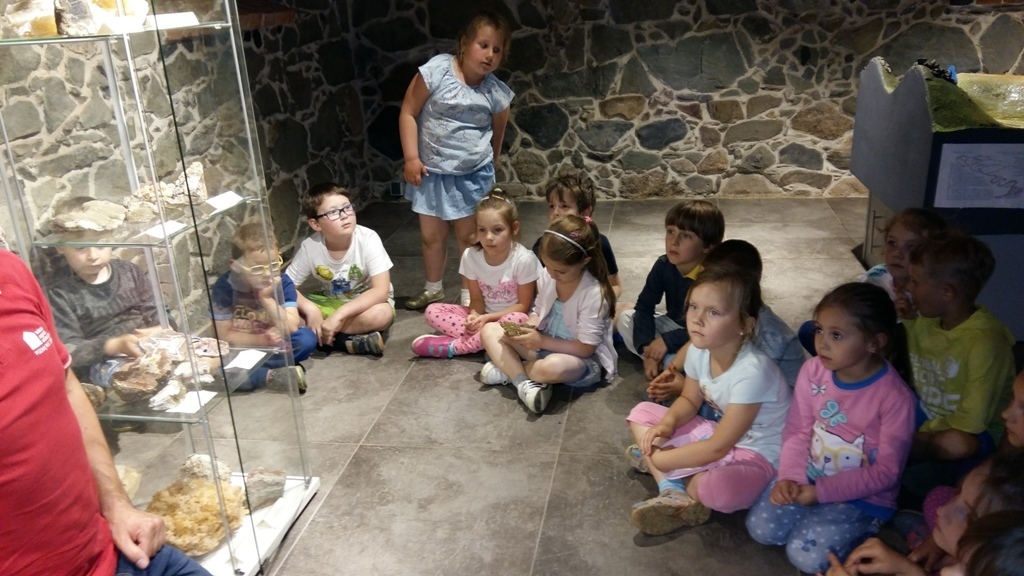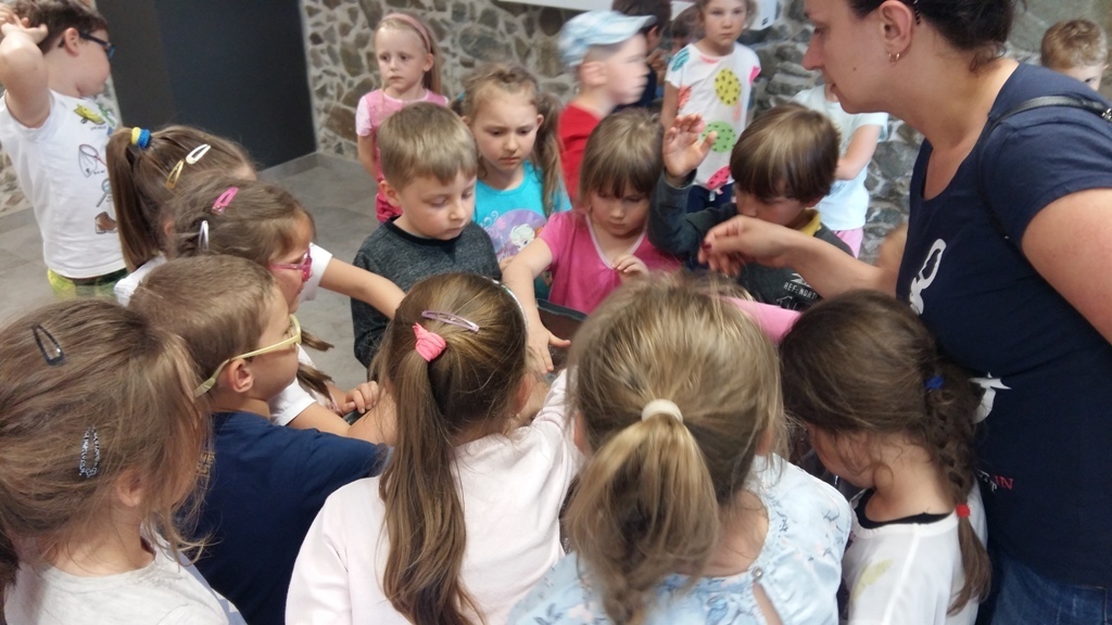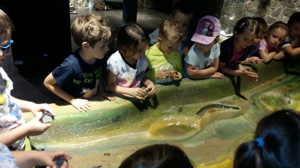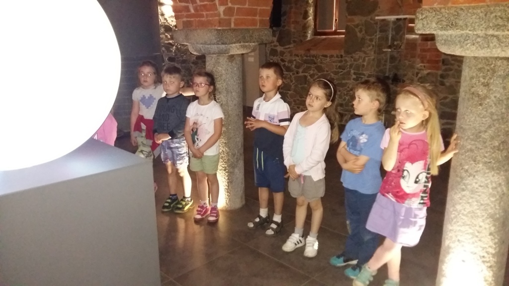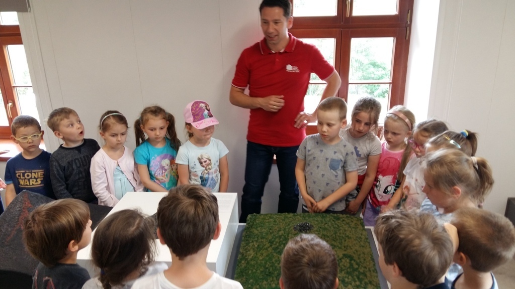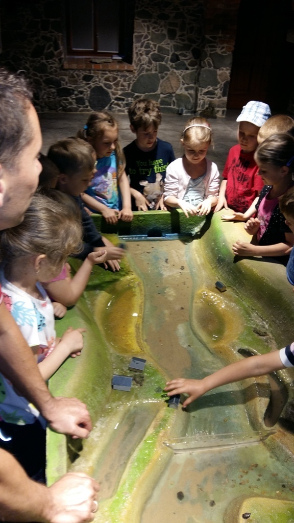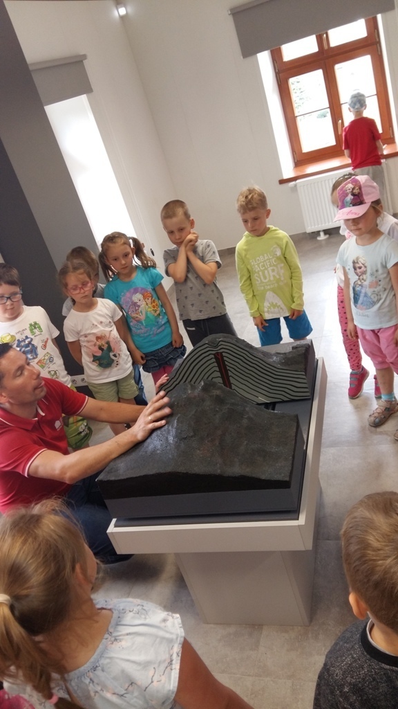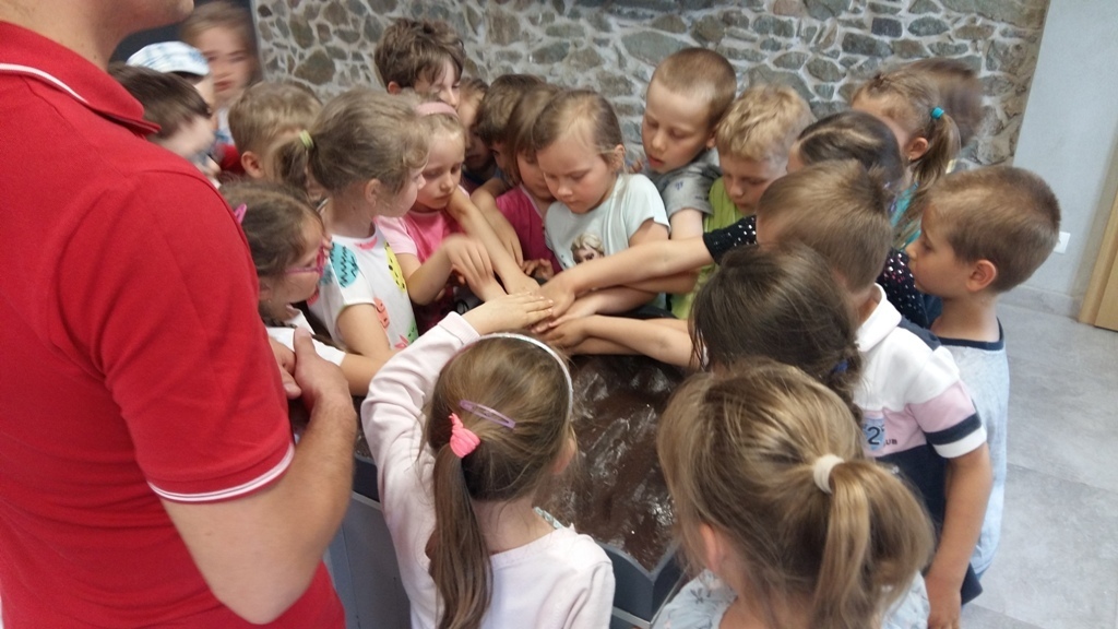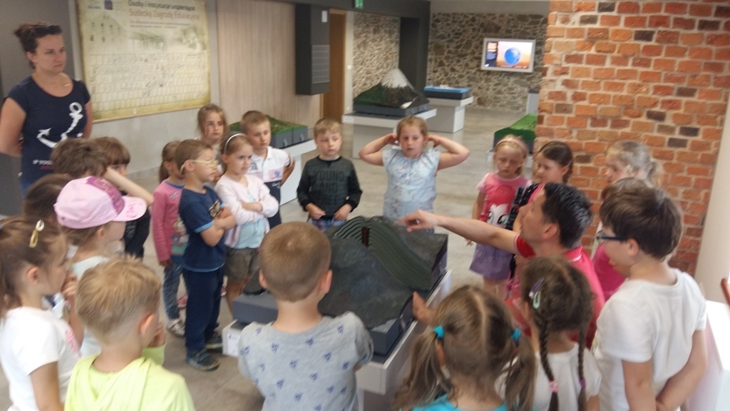 Około godziny 14.00 dotarliśmy do drugiego miejsca naszej wycieczki czyli do Zagrody Edukacyjnej w Dobkowie. Naturalnie wszyscy już na nas czekali, żeby przybliżyć nam tajniki naszej Planety Ziemi. Dowiedzieliśmy się w jaki sposób powstała, nauczyliśmy się rozpoznawać agat i kalcyt. Dowiedzieliśmy się co to są tereny zalewowe i na jakiej zasadzie działa tama wodna. Następnie przeszliśmy do sali z wulkanami i gejzerami, gdzie dzieci mogły zrozumieć czym jest zjawisko wybuchu wulkanu i gejzerów. Jednakże najlepsze zostało na koniec mogliśmy doświadczyć na własnej skórze jak to jest podczas trzęsienia ziemi. Pełni pozytywnych doświadczeń i radości z pięknej pogody wróciliśmy do przedszkola, przed którym czekał szpaler rodziców, którzy przyszli po swoje pociechy. Dzień wszyscy jednomyślnie uznali za udany. Oby było takich jak najwięcej.