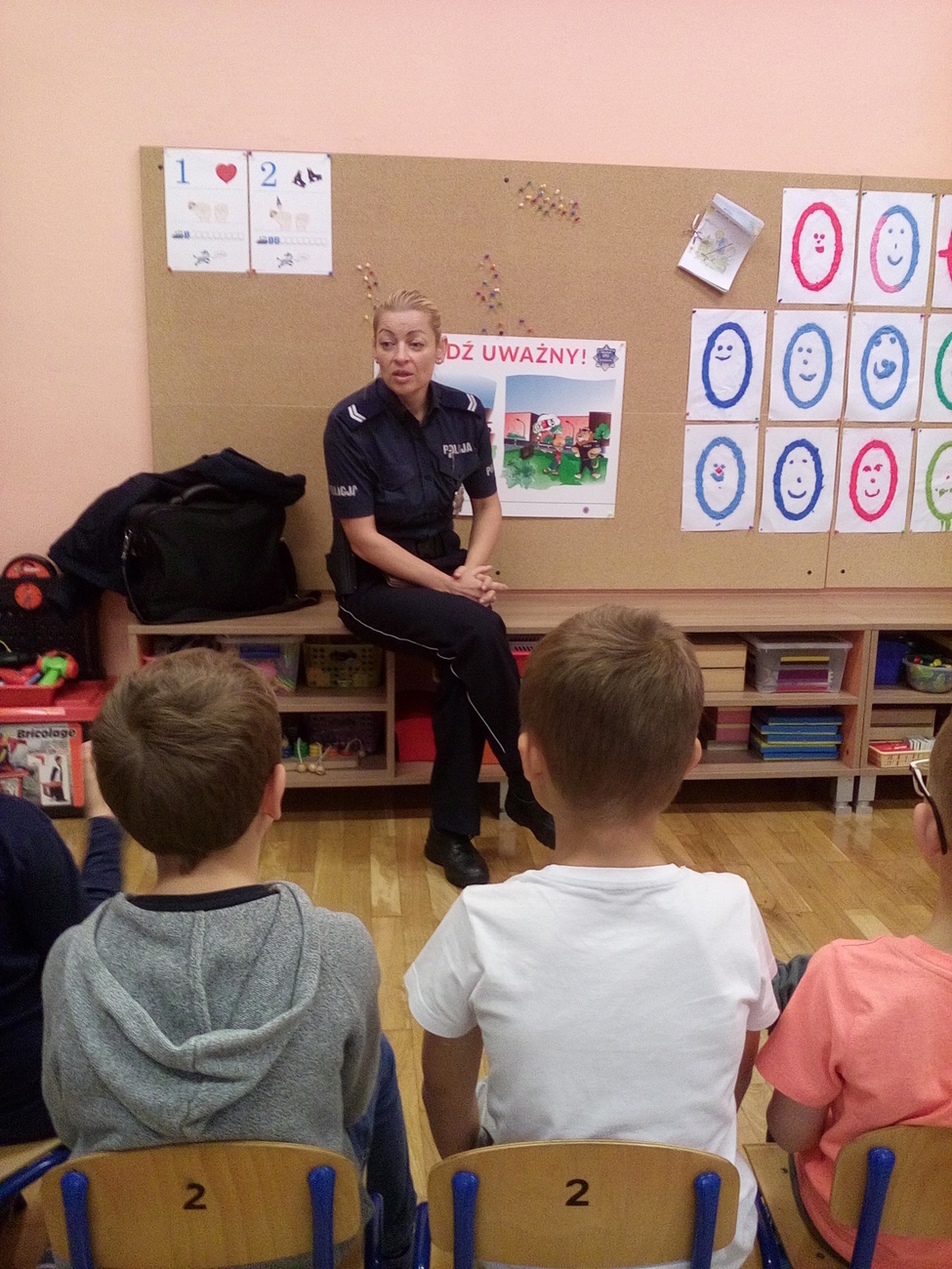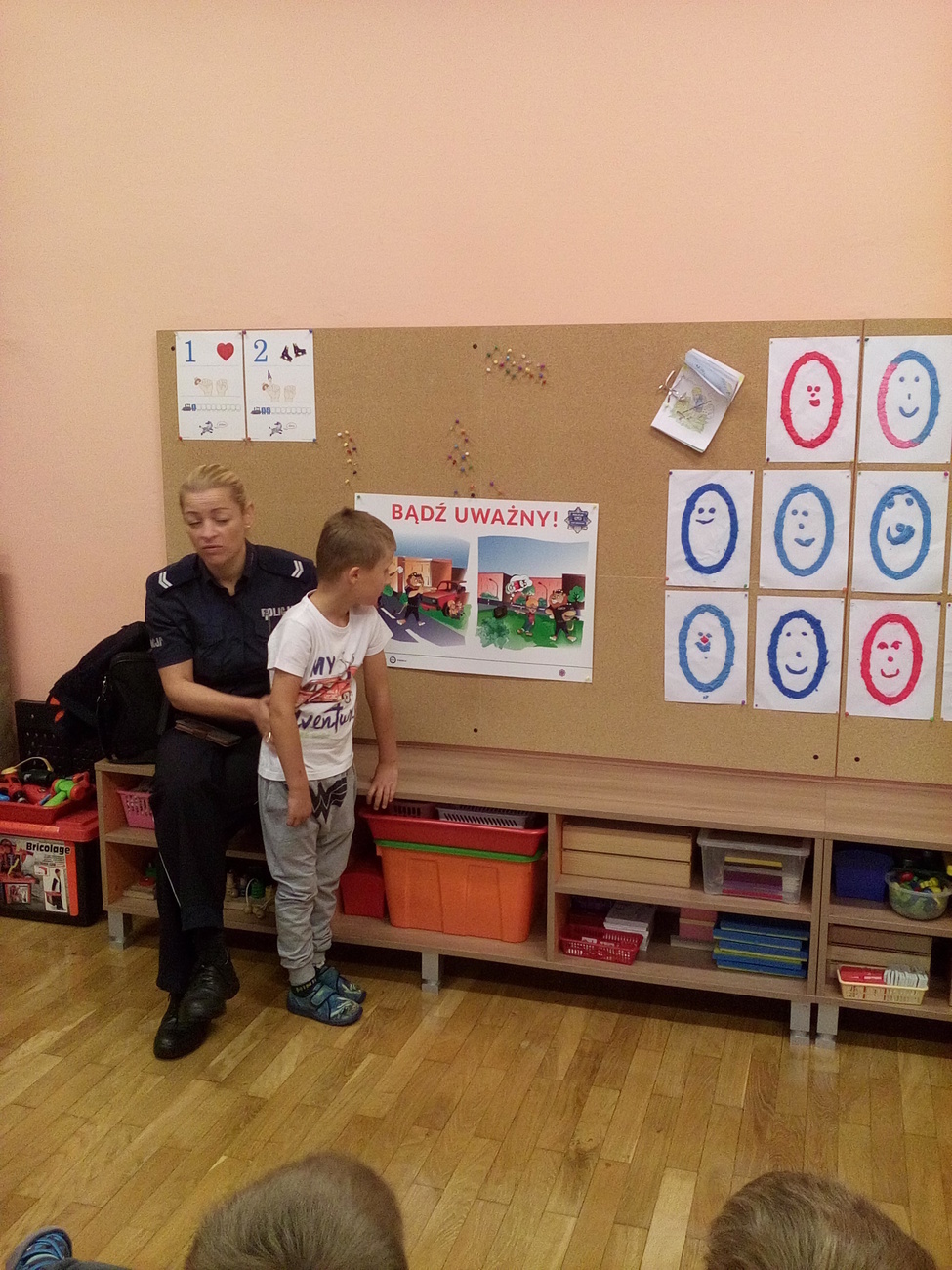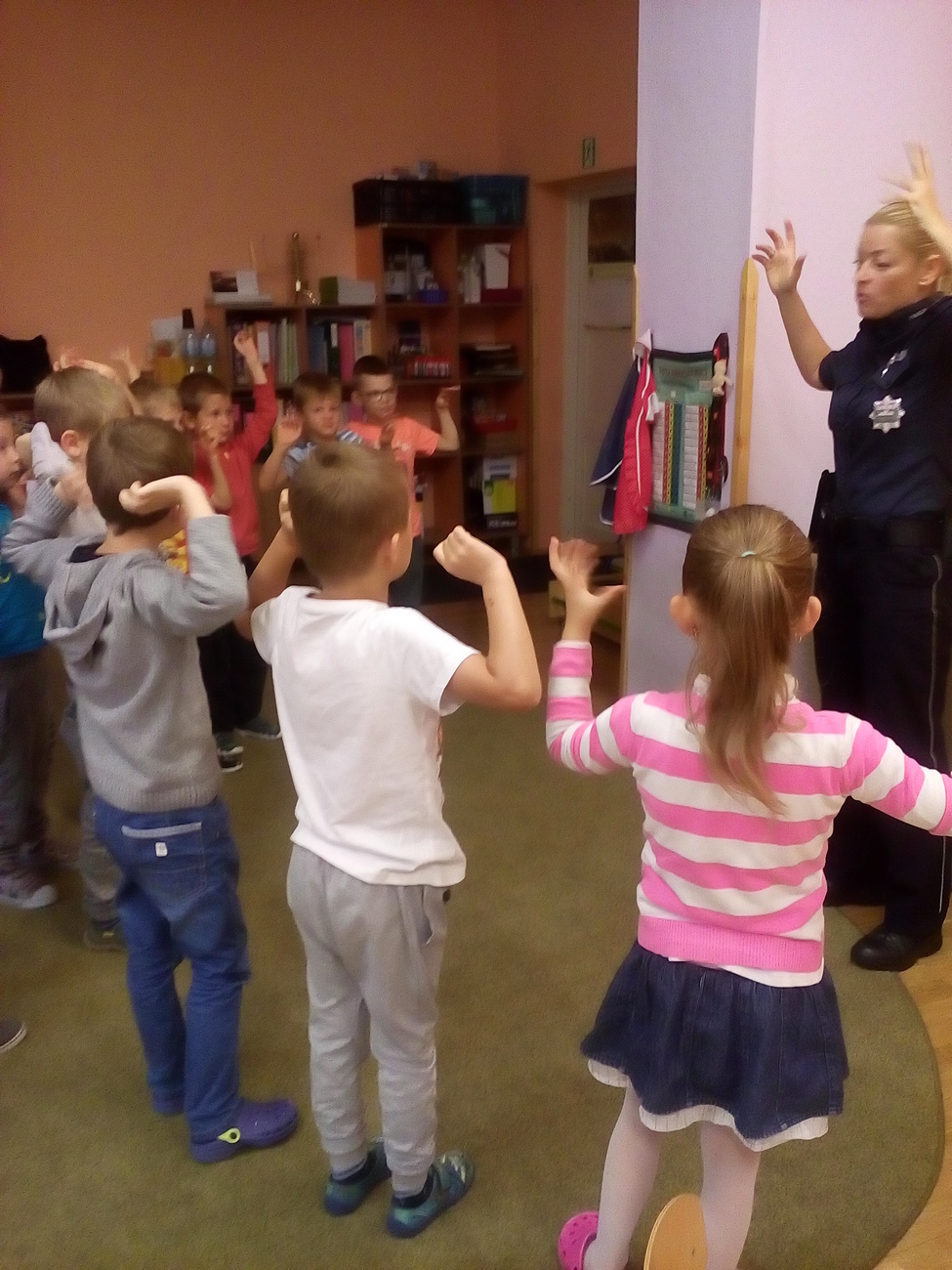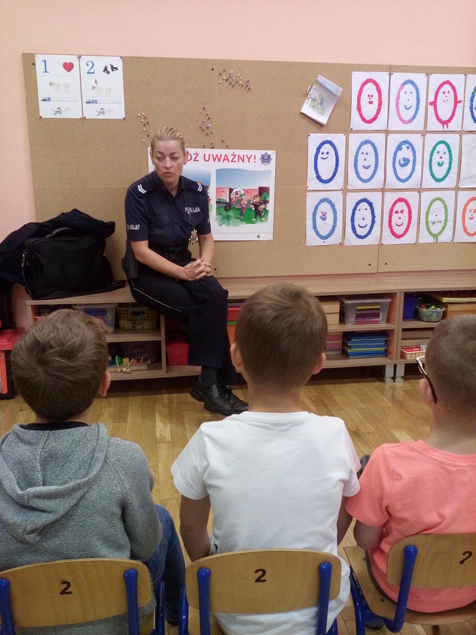 W dniu dzisiejszym wszystkie dzieci 6-letnie miały okazję uczestniczyć w spotkaniu z panią policjantką z Komendy Miejskiej Policji w Jeleniej Górze. Podczas zajęć dowiedzieliśmy się jak postępować w różnych sytuacjach niespodziewanych. Powtórzyliśmy zasady postępowania w przypadku bliskiego spotkania z dużym psem. Jak również dowiedzieliśmy się co to takiego jest terroryzm. Zdobyte wiadomości wyposażyły nas w ważną wiedzę, Wszystkim zajęcia bardzo się podobały.