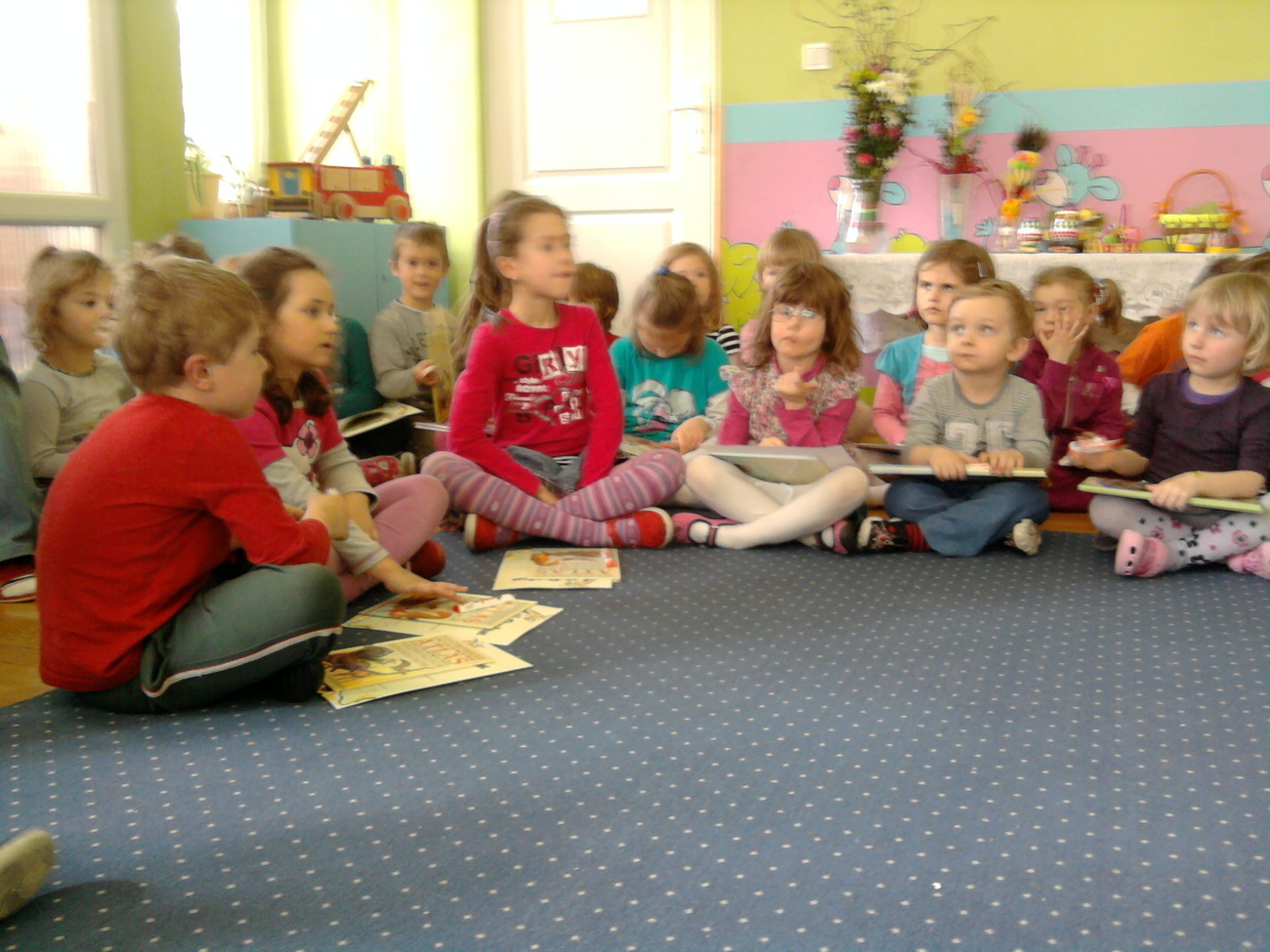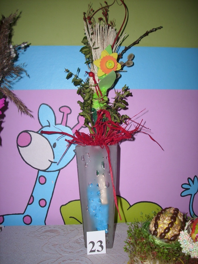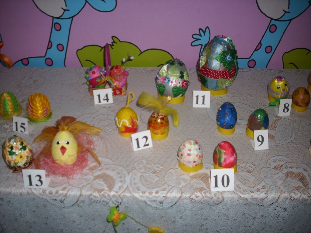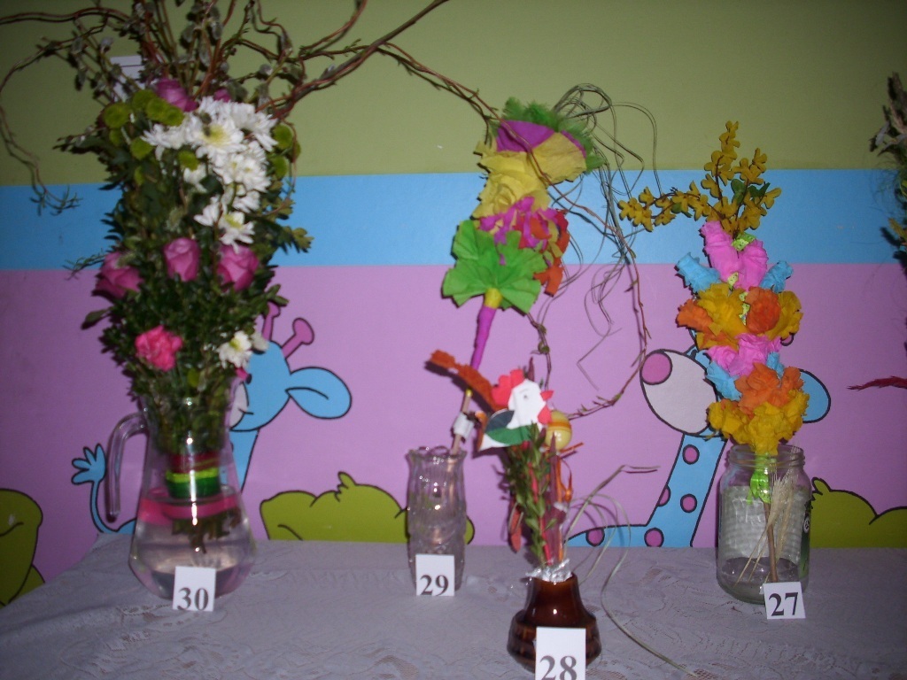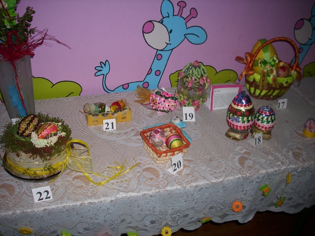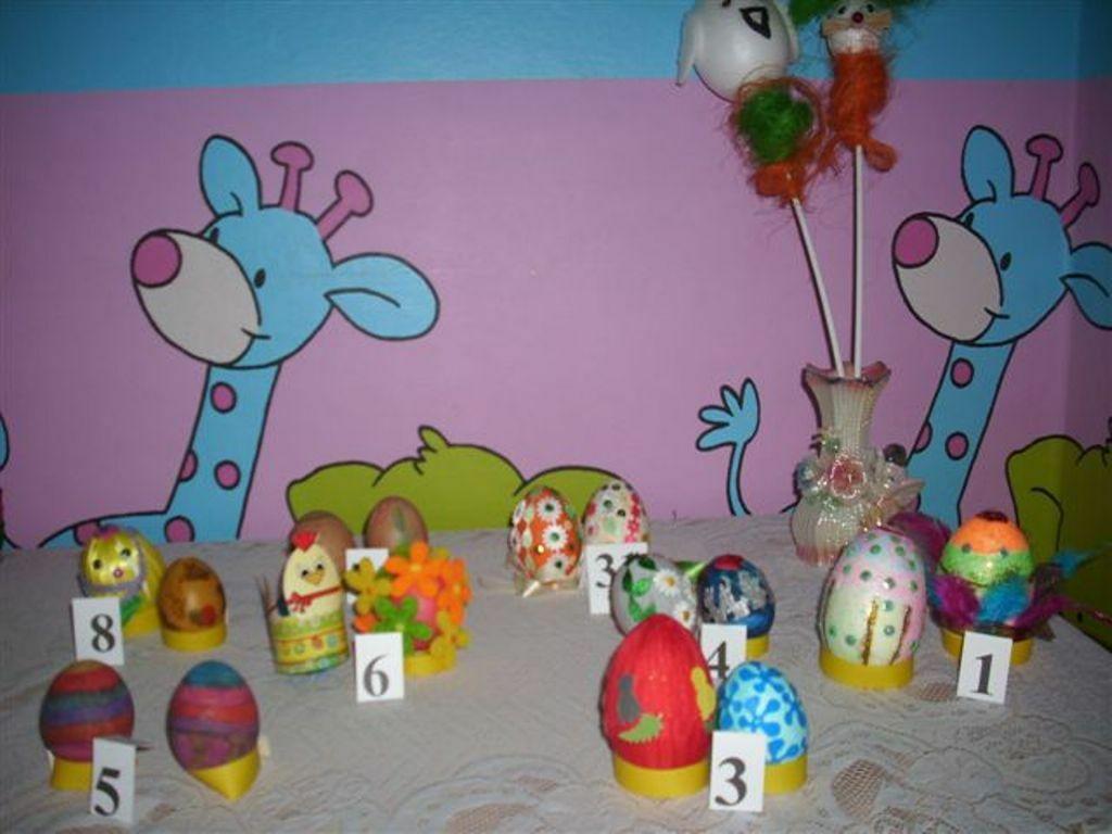 Prace konkursowiczów zgromadzone zostały w sali grupy IV i poddane ocenie przez głosowanie. Jurorami byli rodzice. Każdy mógł oddać trzy głosy na pisanki i trzy głosy na palmy, typując pierwsze trzy miejsca.