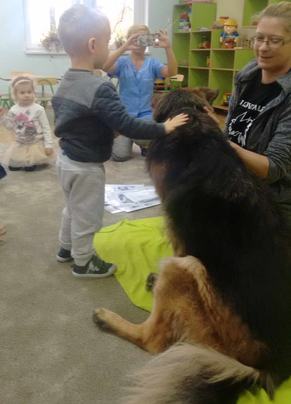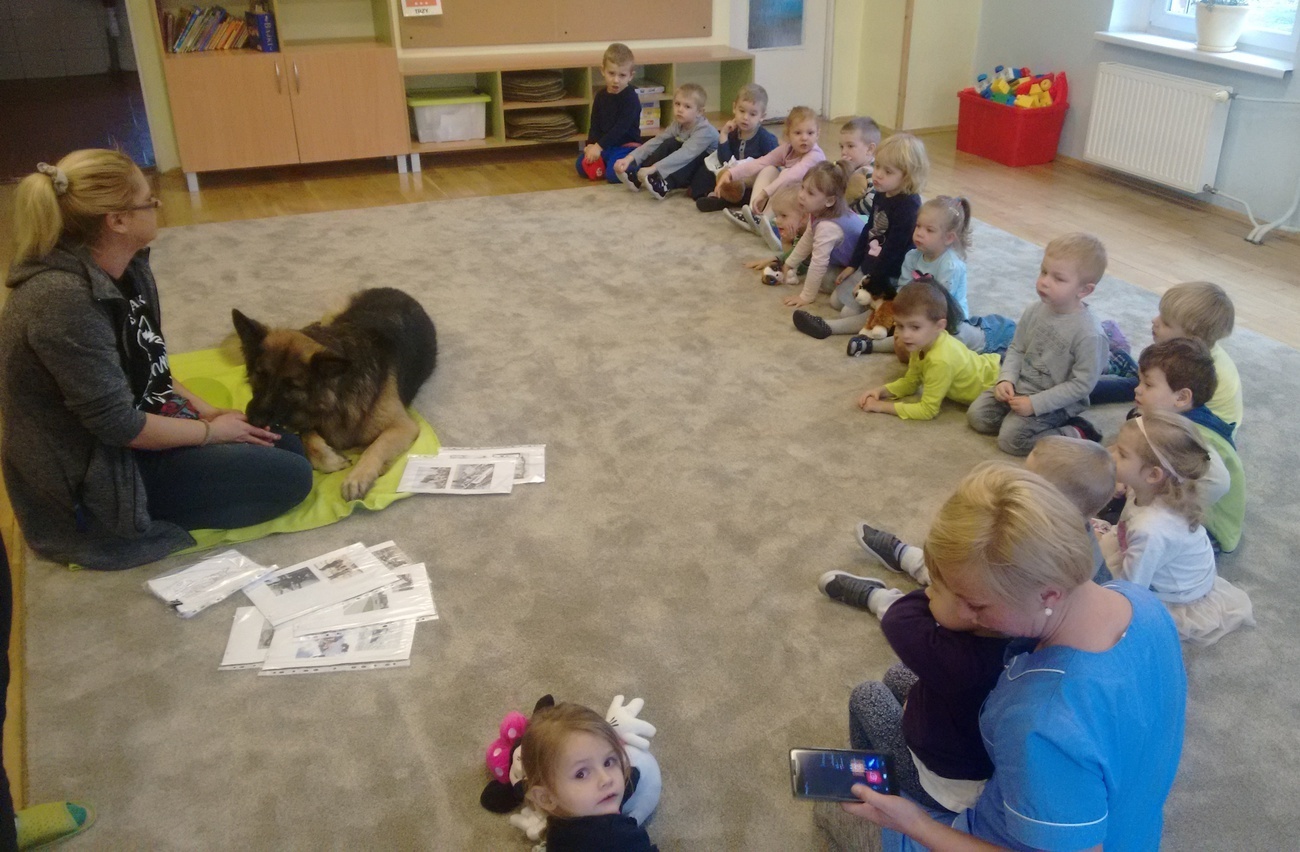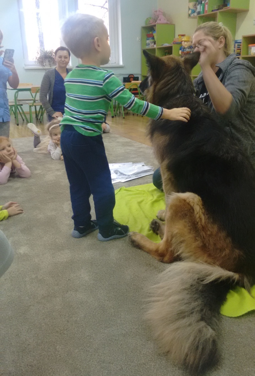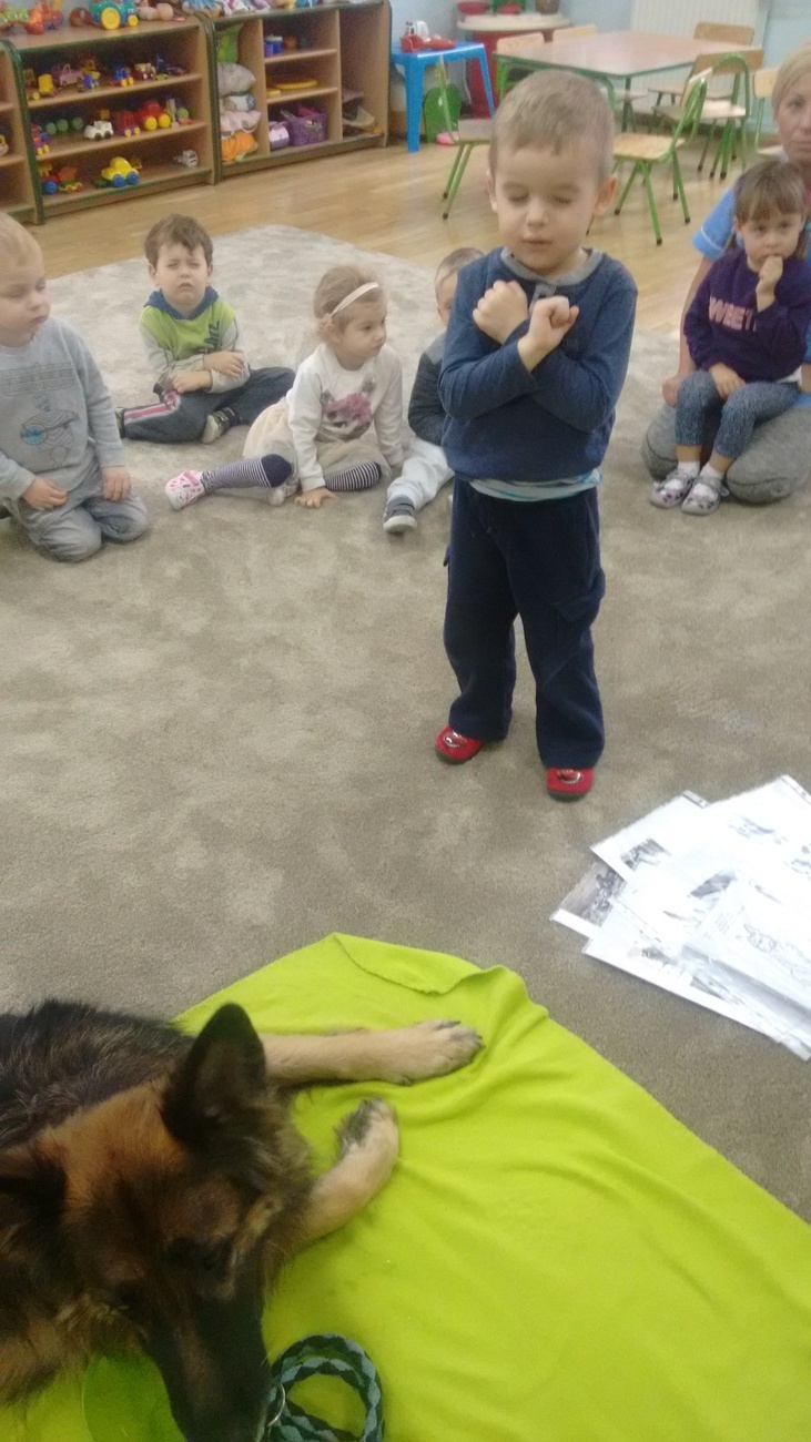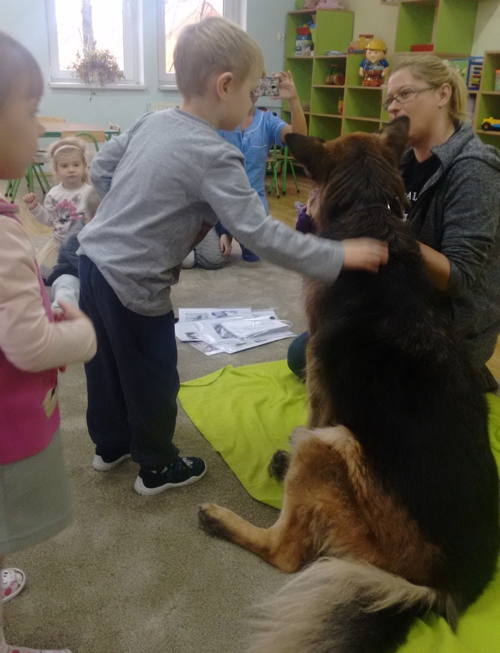 Dnia 02.12.2016 r. naszych przedszkolaków odwiedziła Wandzia - owczarek niemiecki wraz ze swoim opiekunem. W czasie tego spotkania dzieci dowiedziały się jaką rolę odgrywa pies w ratownictwie. Nauczyły się także jak bezpiecznie i odpowiedzialnie postępować z psem. Dzieci poznały pozycje bezpieczne, które należy zastosować w kontakcie z obcym, niebezpiecznym psem. Nasze Smyki wykazały wielką odwagę, gdyż każde podeszło i pogłaskało Wandzię. Zajęcia te były dla naszych dzieci wielkim wydarzeniem i dostarczyły im wiele pozytywnej energii. Bardzo miło będziemy wspominać to spotkanie i jeszcze raz serdecznie dziękujemy Opiekunom Wandzi za ciekawie spędzony czas!
