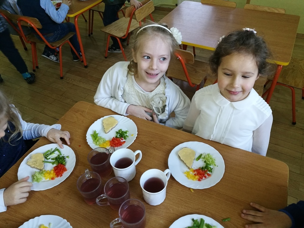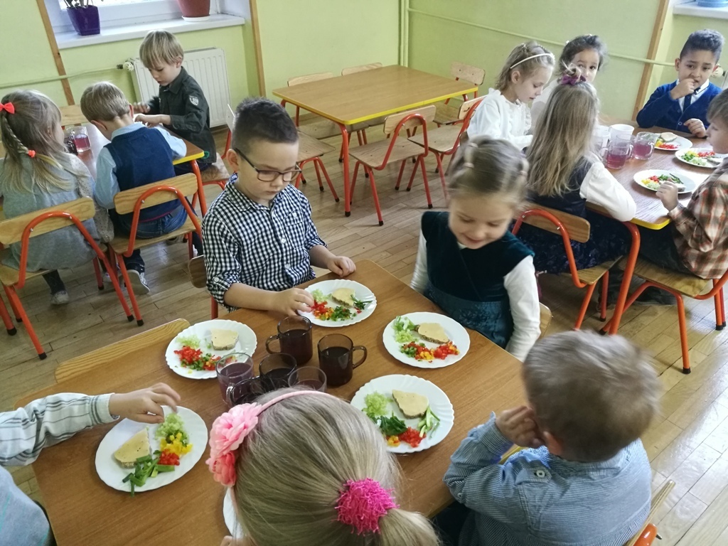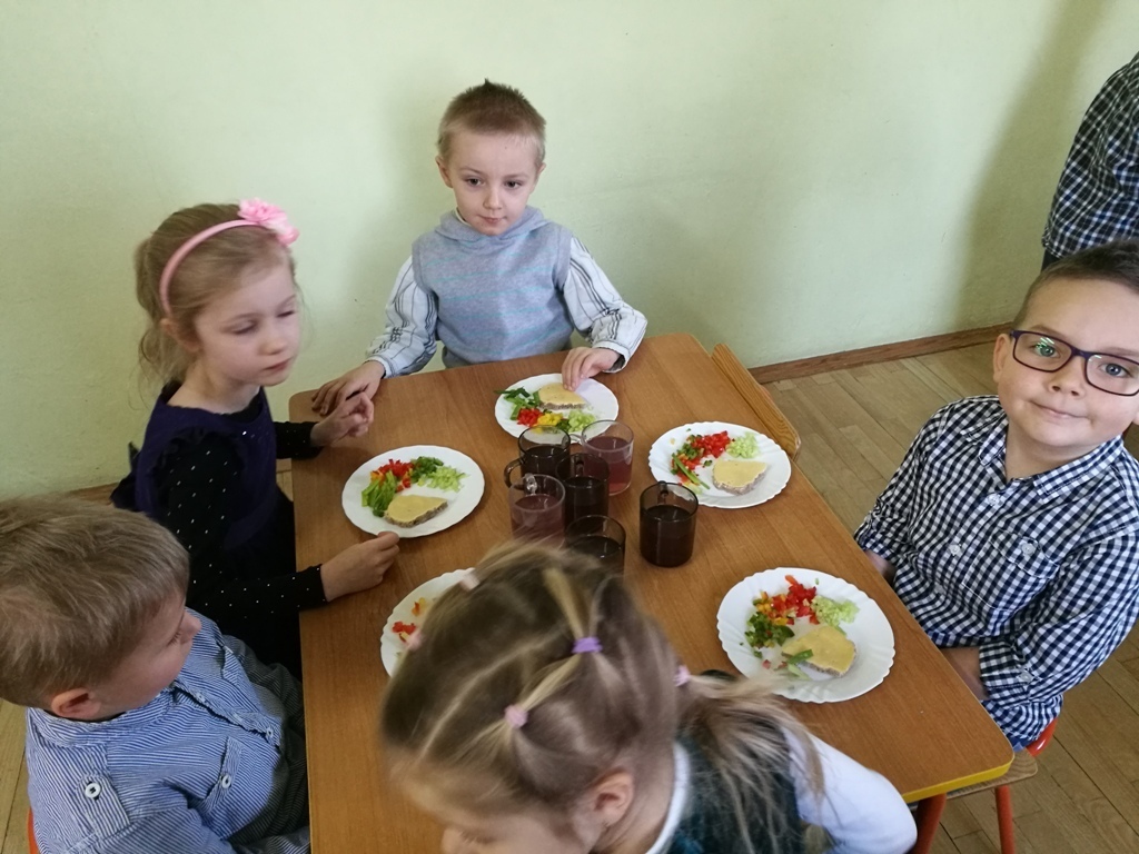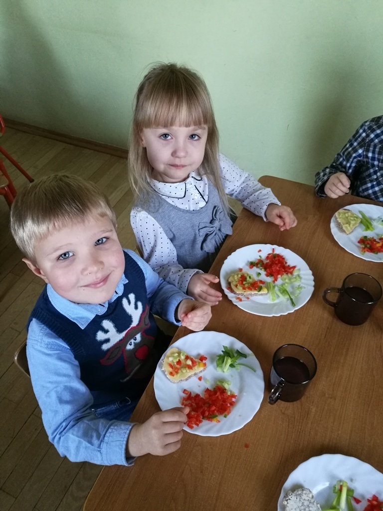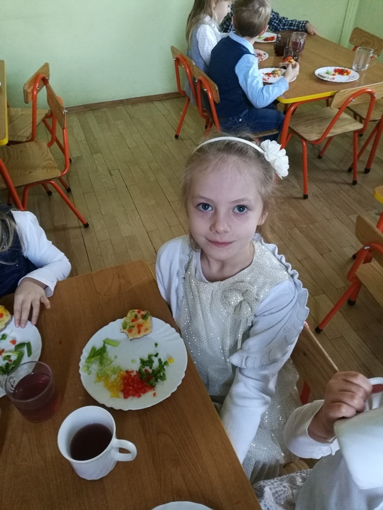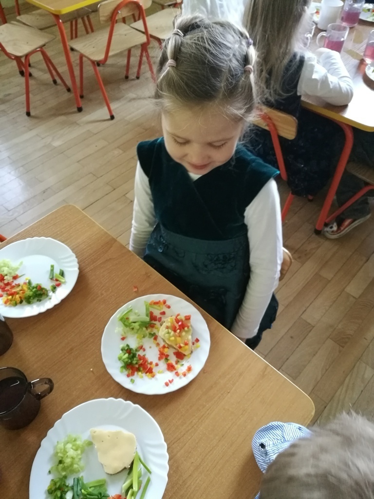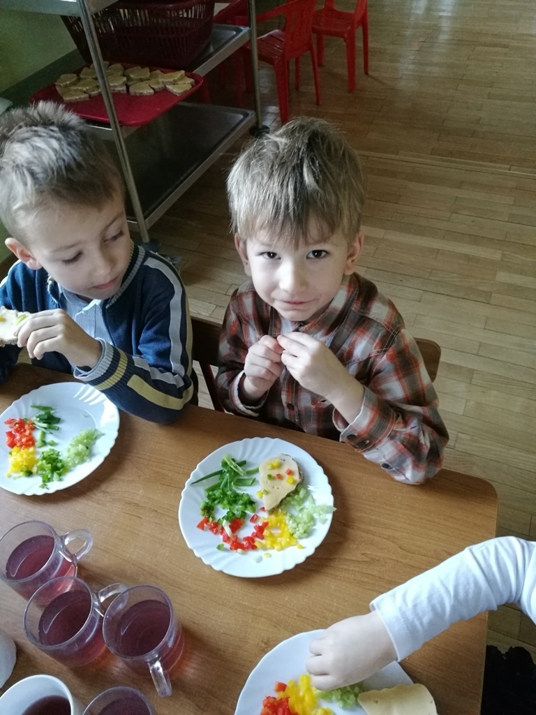 21 grudnia w naszym przedszkolu miała miejsce świąteczna wigilia. Już os rana można było poczuć klimat świąt i bożonarodzeniową atmosferę. Odświętnie ubrane dzieci, pięknie przystrojone przedszkole i kolędy w tle. Gdy nasza grupa usiadła do stolików by zacząć śniadanie czekała na nie miła niespodzianka. Na śniadanie zamiast tradycyjnych kanapek były choinki wycięte z razowego chlebka i żółtego sera, dodatkowo każde z dzieci na talerzu miało przygotowane ozdoby na choinkę z papryki., ogórka i szczypiorku. Dzieci z radością zabrały się do ozdabiania śniadania, by zaraz po tym, ze smakiem je zjeść.