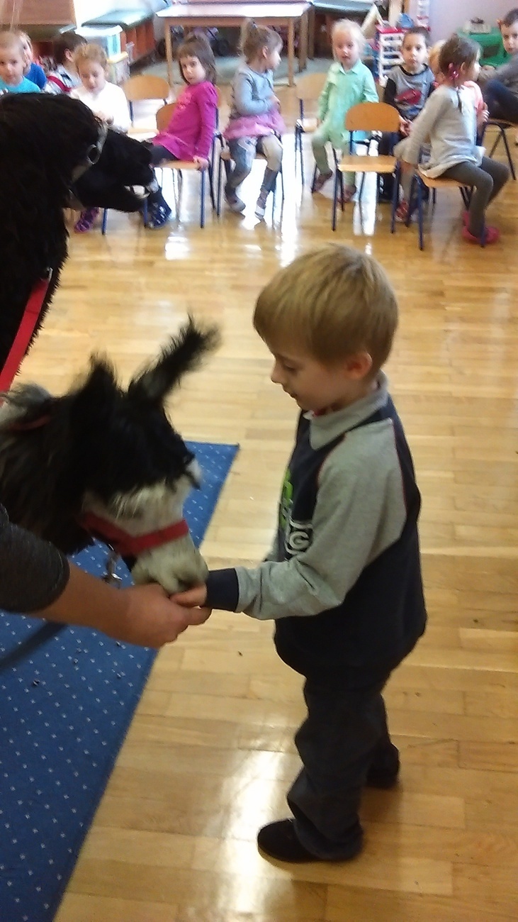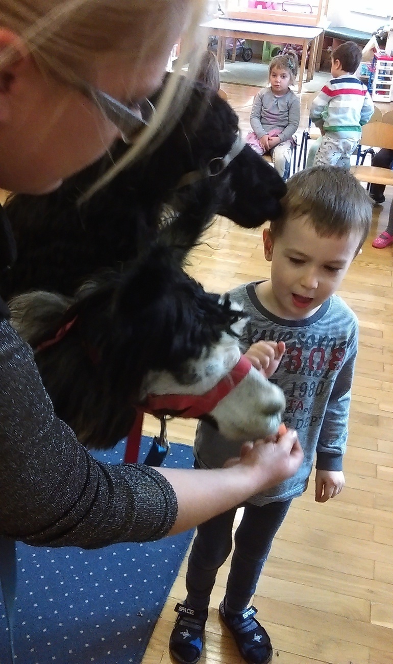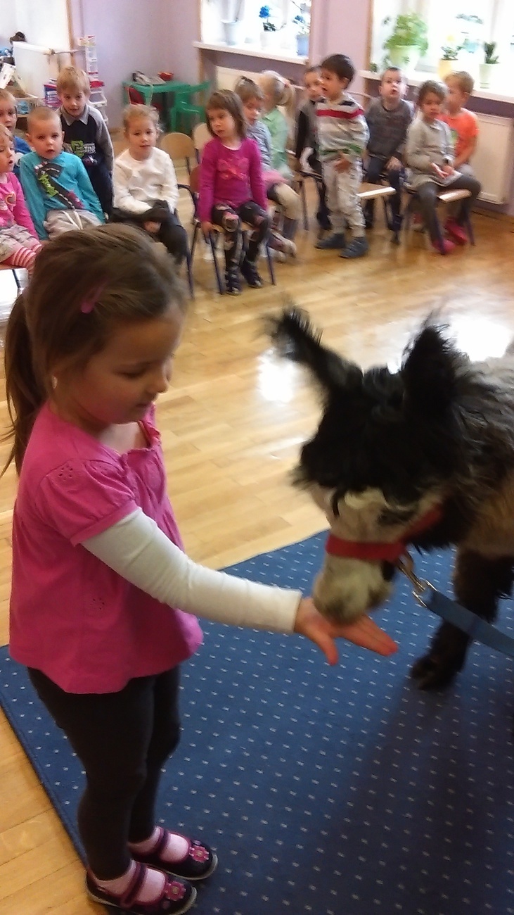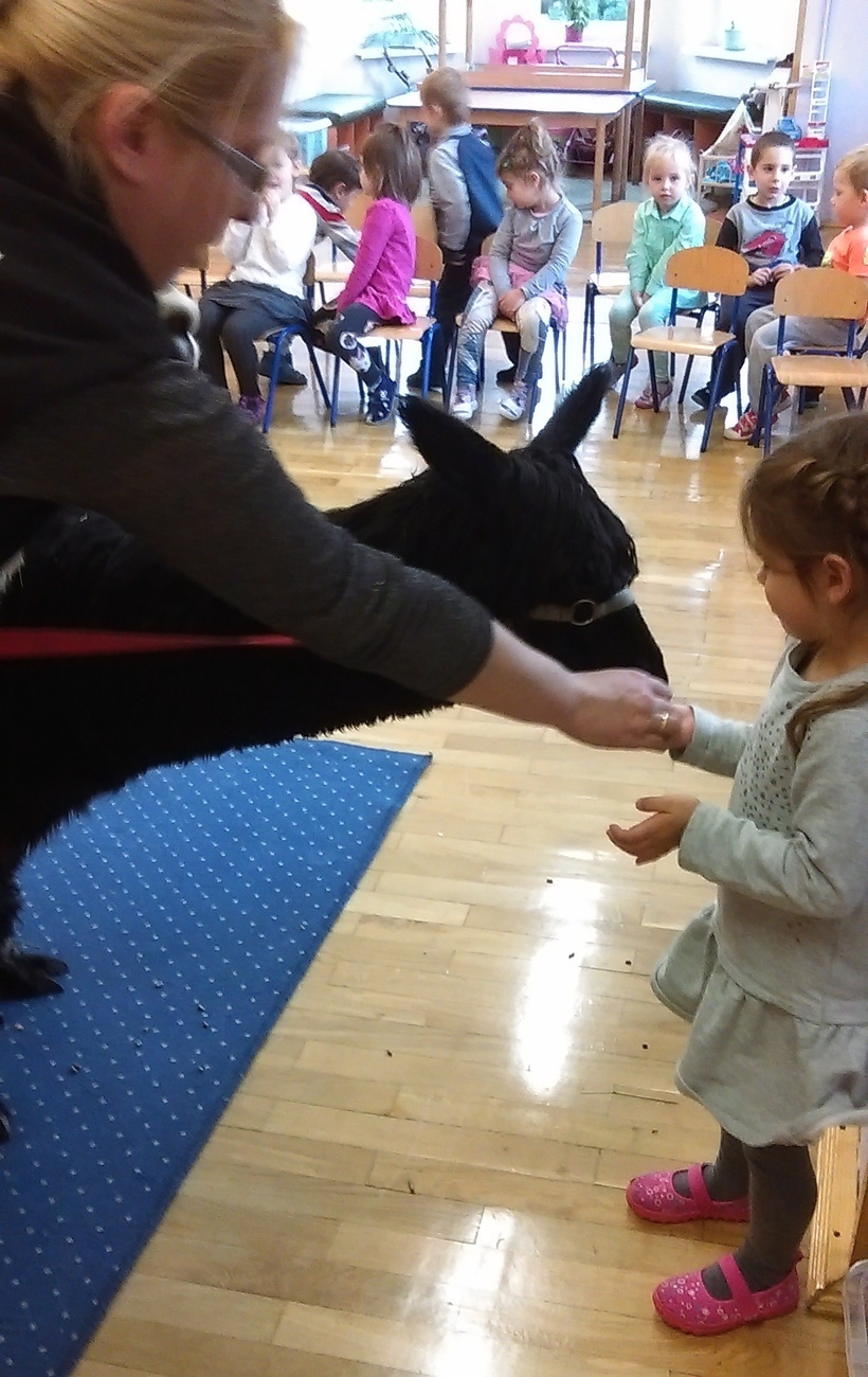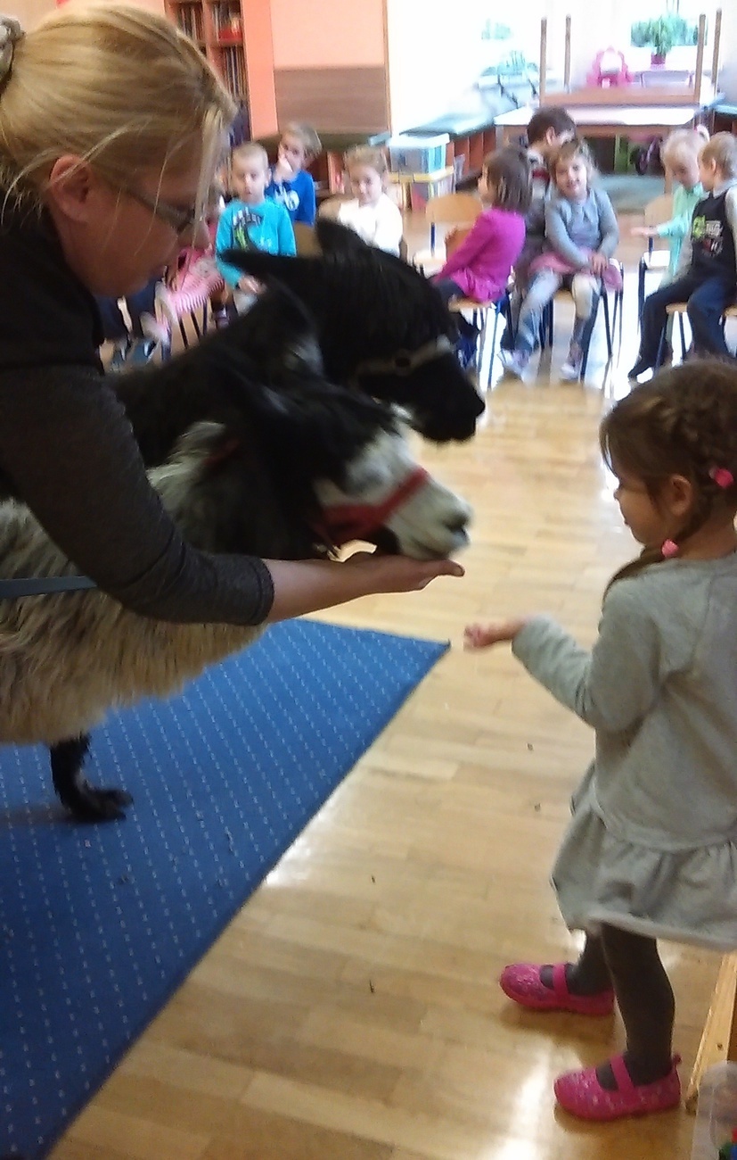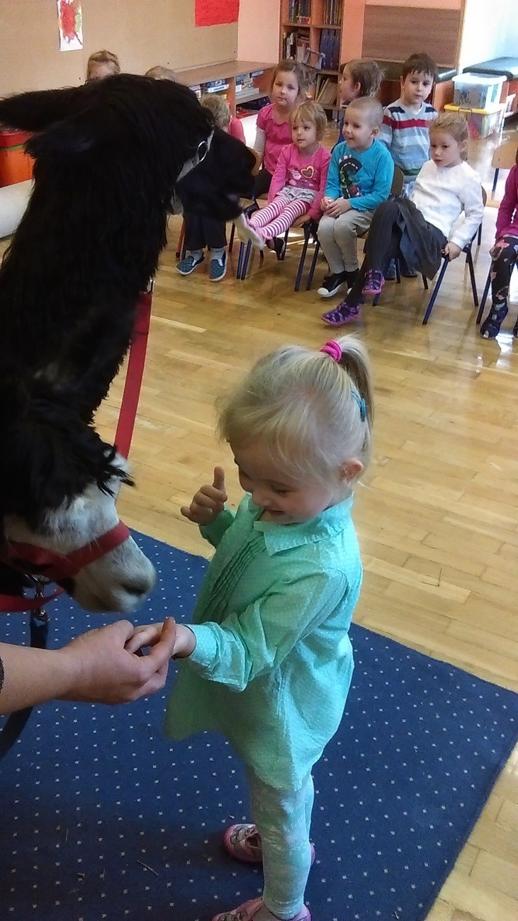 03.11.2016 r. gościły w naszym przedszkolu alpaki. Na samym początku spotkania pani opowiedziała nam o tym jak różne zwierzęta przygotowują się do zimy. Pokazała nam również ślady jakie pozostawiają na śniegu. Następnie rozmawialiśmy o tym jak wyglądają przygotowania do zimy aplaków. Na zakończenie każdy z nas mógł pogłaskać i nakarmić Klaksona i Szafira.