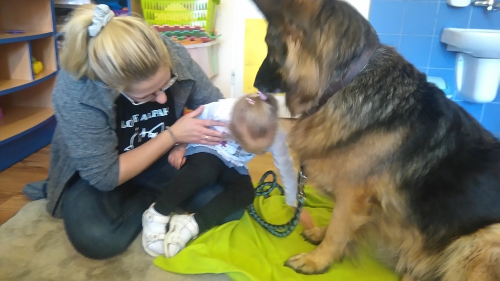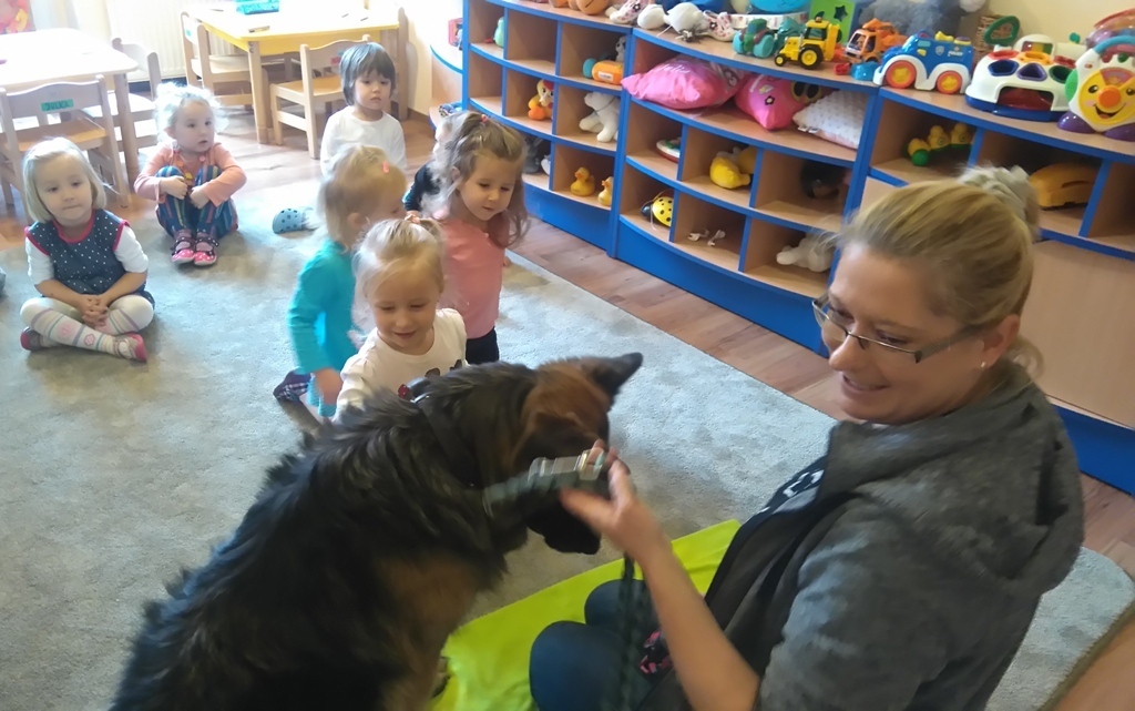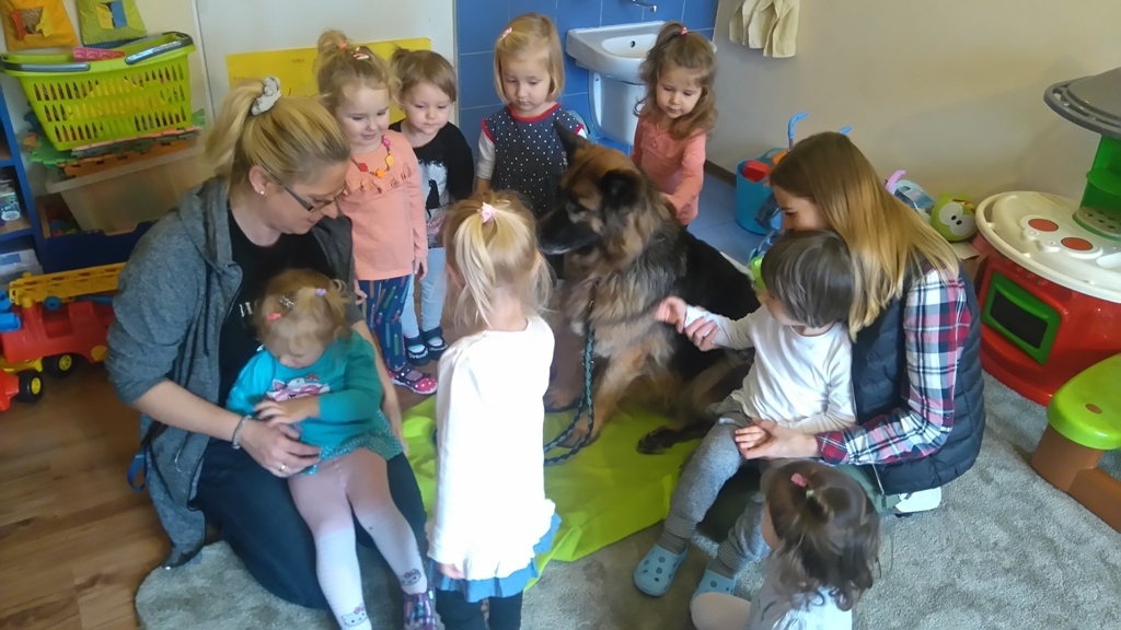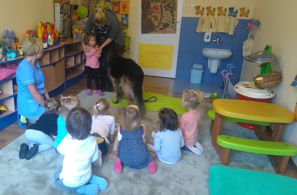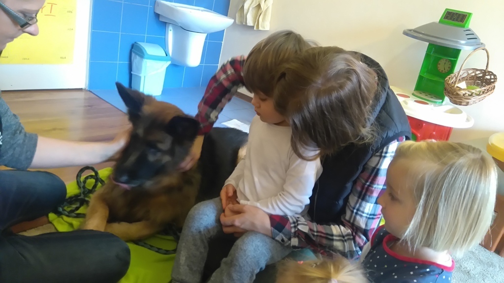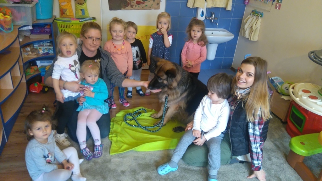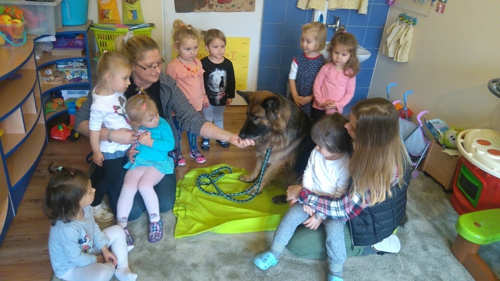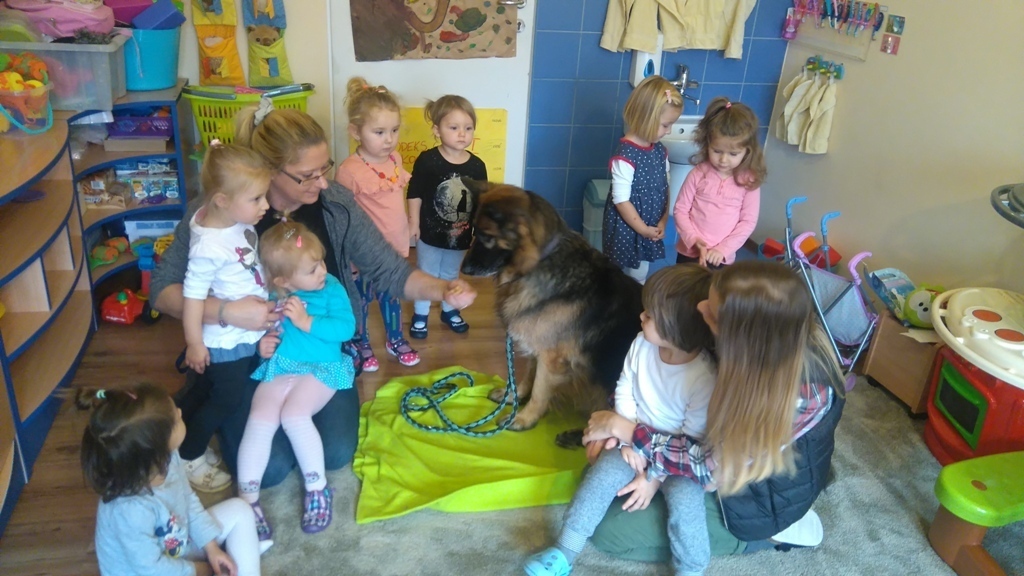 W dzisiejszym dniu spotkała nas niespodzianka. Odwiedziła nas pani Marta razem ze swoim wspaniałym psem. Zajęcia były bardzo ciekawe. Pani Marta nauczyła nas, jak postępować w momencie, kiedy na spacerze spotkamy nieznanego psa i jak się przed nim bronić, kiedy będzie chciał nas zaatakować. Mogliśmy również dać pieskowi ciasteczka, a także go pogłaskać. Ciekawe, czy będzie chciał nas jeszcze odwiedzić???